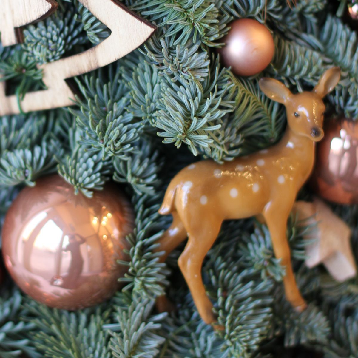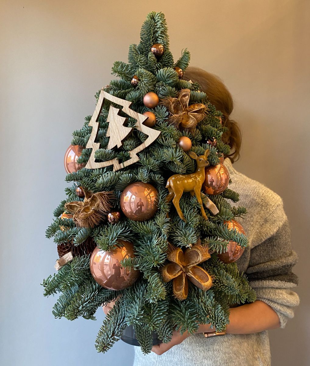 Маленькая елочка из нобилиса на подставке — интересный подарок коллегам и близким на Новый год, а также красивое украшение интерьера небольших квартир. Изящное дерево украшает большое количество новогодних игрушек в приятном бронзовом оттенке, которые создадут праздничное настроение. В интернет-магазине можно купить композицию, которую мы при сборке дополним открыткой. Поздравить оригинальным сочетанием с праздником можно с быстрой доставкой по Москве. Размеры, фото и цены доступных поздравлений есть в каталоге — выбирайте подходящую новогоднюю композицию и оформляйте заказ к событию.