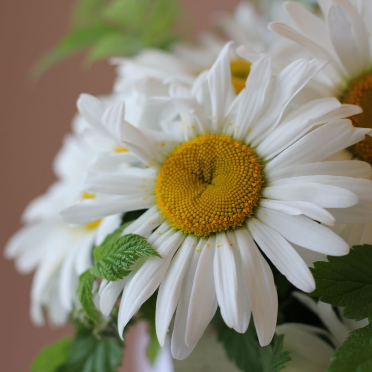 Эффектная, нежная и романтичная композиция из крупных ромашек в мини-формате – великолепный выбор для стильных поздравлений и приятных знаков внимания. Цветы дополнены сочными листьями малины, благодаря чему композиция смотрится оригинально. Работа предлагается в практичном варианте конверта-кашпо, станет отличным украшением интерьера, гармонично будет выглядеть даже на рабочем столе в кабинете. Универсальный вариант презента, актуальный во все времена и сезоны. К работе прилагается стильная подарочная карточка для адресного поздравления получателя. Отличный вариант, который будет долго радовать первоначальным внешним видом.