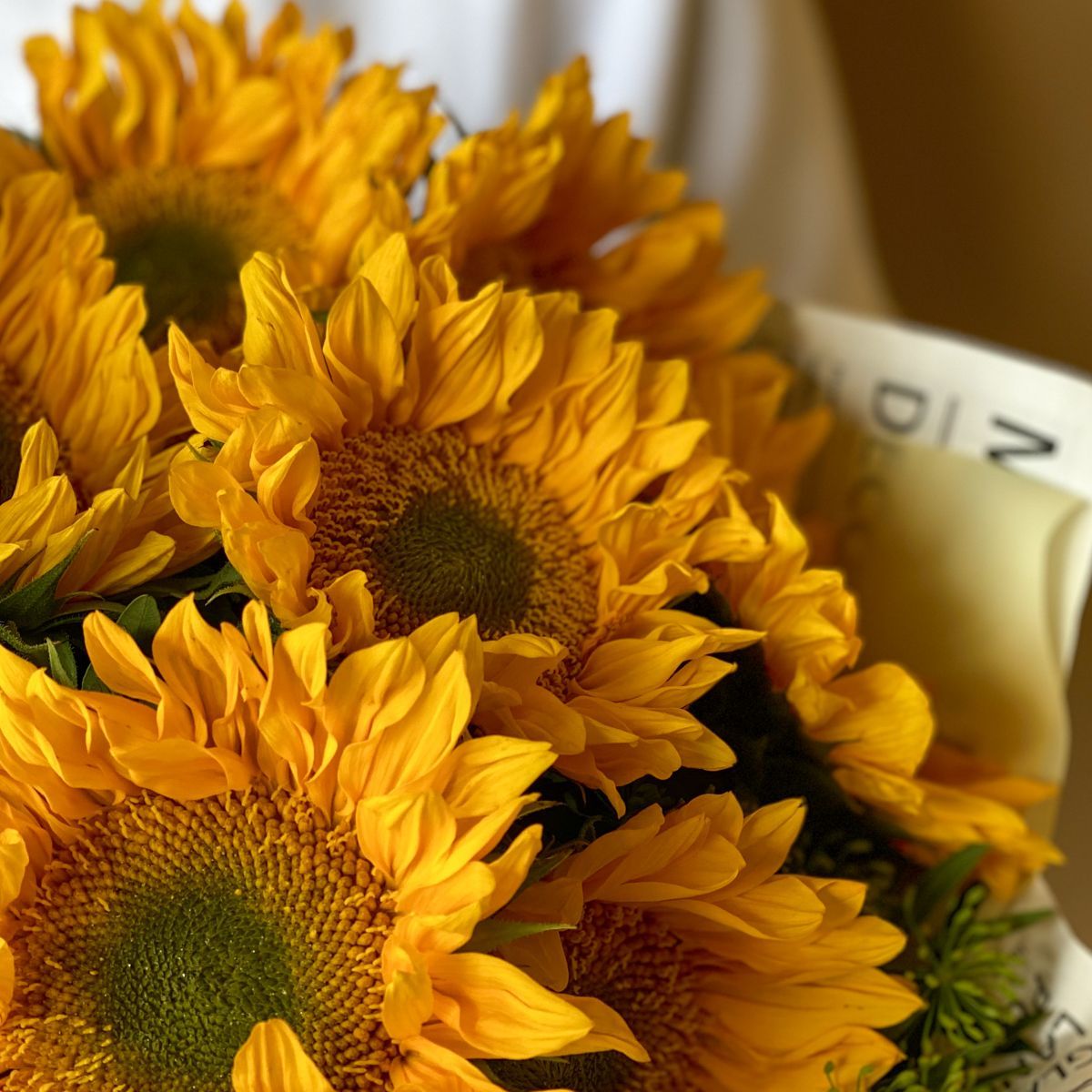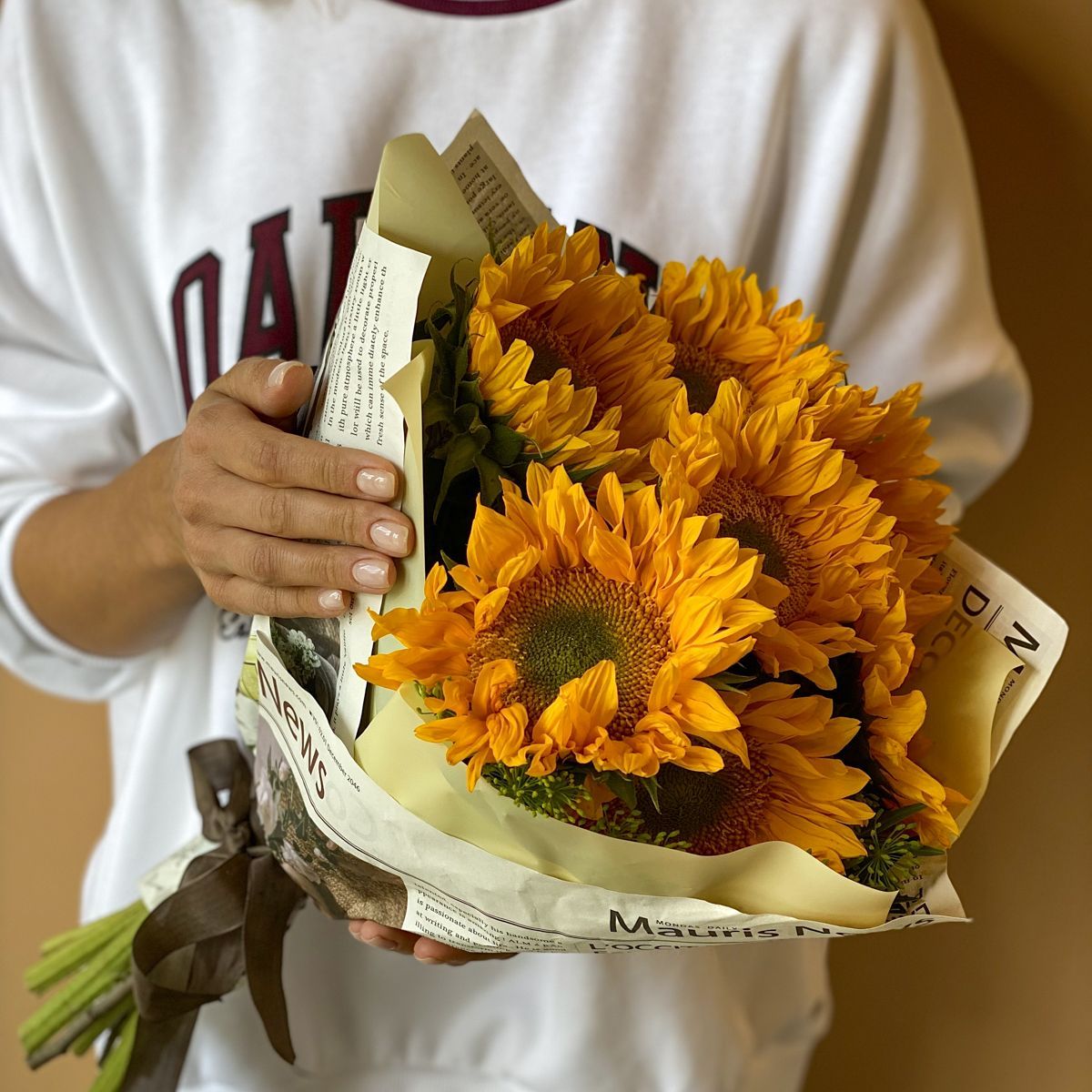 Яркий цвет и крупный размер гелиантусов делает их лидерами в букете на любой праздник. Композиция, составленная только из этих свежих цветков, приносит радость и счастье в каждый дом. Поздравить позитивным цветочным подарком из подсолнухов уместно любимого педагога — насыщенный букет на 1 сентября в красивой упаковке в виде газетных листов с лентой шоколадного оттенка не оставит никого равнодушным и отлично дополнит фото с важного события. Внутрь поздравления мы положим открытку. Купить необходимое количество бутонов можно с доставкой заказа, заранее посмотрев цены цветов в каталоге интернет-магазина.