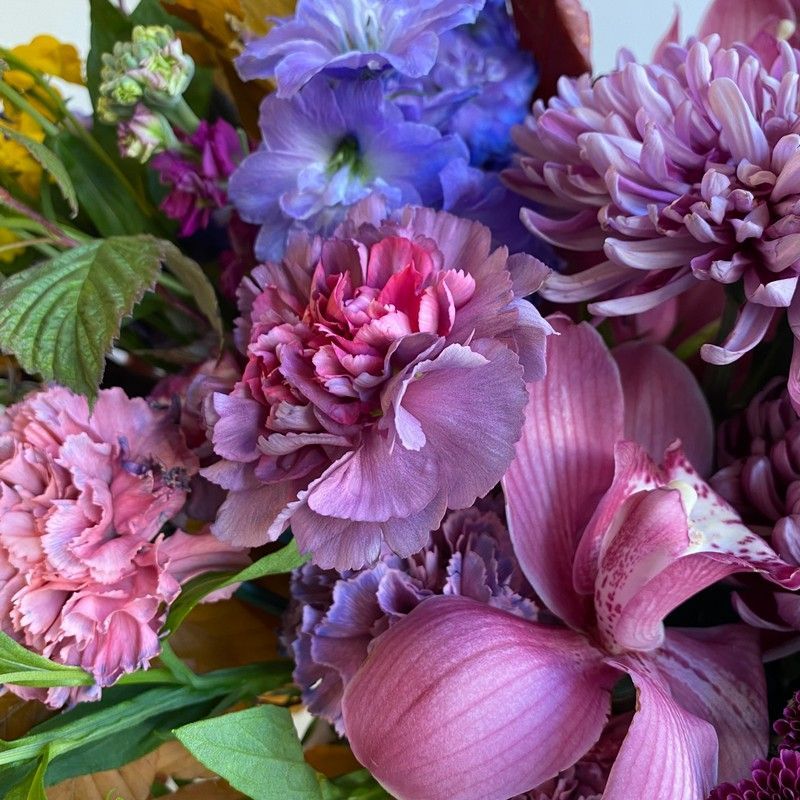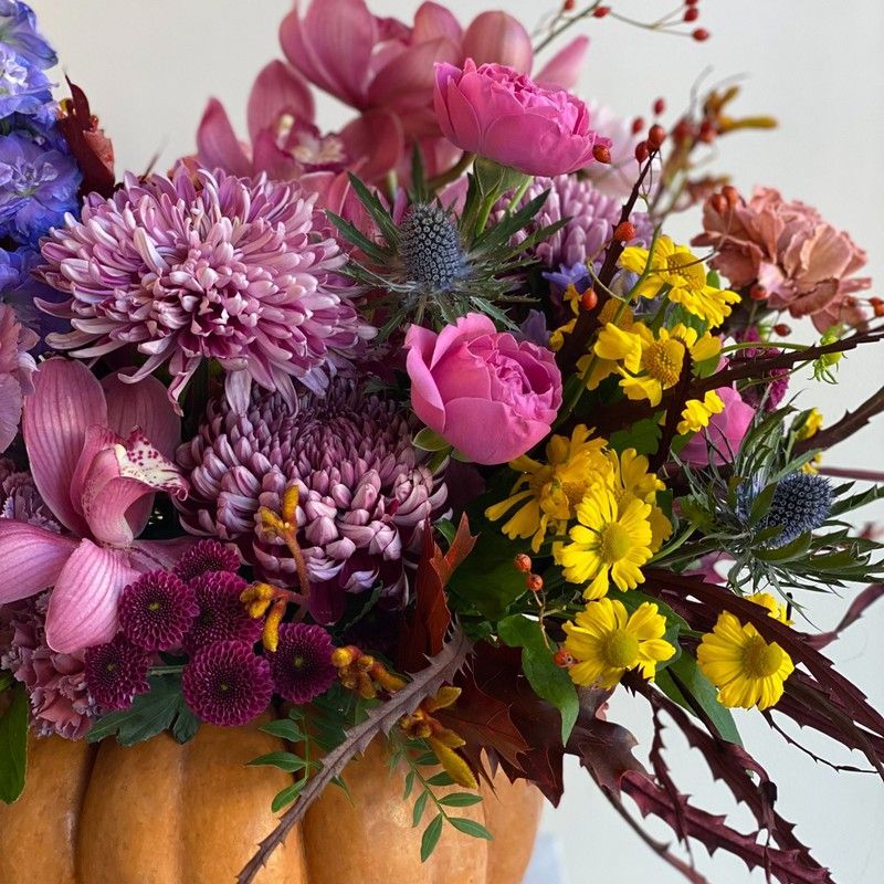 Элегантность и утонченность — слова, которые описывают красивый букет из цветков гвоздик, хризантем, маттиол, анигозантуса, цимбидиума, кустовой, российской и голландской розы в огромном количестве. Разнообразие оттенков дополняют свежие шиповник, календула, эрингиум, антуриум, гелениум, дельфиниум с листьями бука и дуба. Расставляет акценты в поздравлении упаковка рыжего цвета. В каталоге интернет-магазина можно купить композицию с открыткой и поздравить ей с праздником с бесплатной доставкой. Вы можете посмотреть размеры, фото, цены сборок цветов для заказа самого подходящего подарка к важному событию.