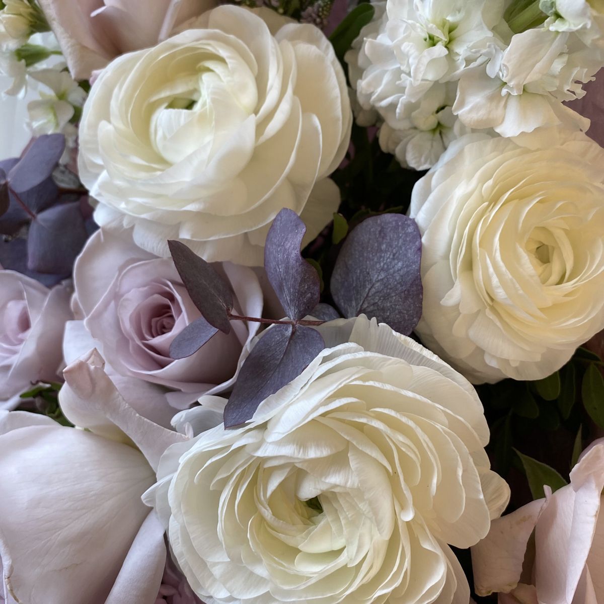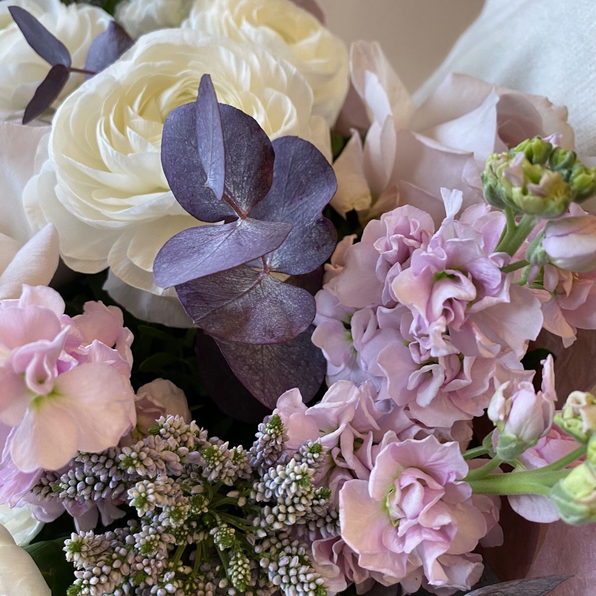 Классика весенних букетов к важным событиям — бежево-фиолетовые оттенки пышных цветов. Поздравить ими любимую можно с юбилеем и 8 Марта, признаться в чувствах или удивить девушку на 14 февраля. В композиции собраны ранункулюсы, розы Голландия, маттиолы, вероники и гвоздики. Свежий вид поздравлению придают эвкалипт и листья фисташки, а также воздушная упаковка с лентой в тон бутонов. Купить подарок к празднику в нашем интернет-магазине можно с доставкой и открыткой. Для этого посмотрите фото цветков в каталоге, доступные размеры, выберите нужное количество сочетаний и узнайте цену заказа.