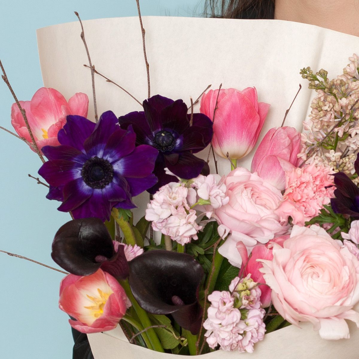Стильный и эффектный букет, подкупающий изящной цветовой гаммой. В работе использованы нежно-розовые тюльпаны, очаровательные анемоны, элегантная маттиола, калла редкой расцветки, гвоздики, ранункулюс, ароматная сирень. Композиция представлена в большом размере, благодаря чему выглядит эффектно и презентабельно, отлично подходит для самых торжественных моментов. Классическое оформление букета в нежно-молочном оттенке делает композицию визуально ярче и колоритнее. Это великолепный вариант красивого, современного букета, способный произвести должное впечатление на любого получателя.