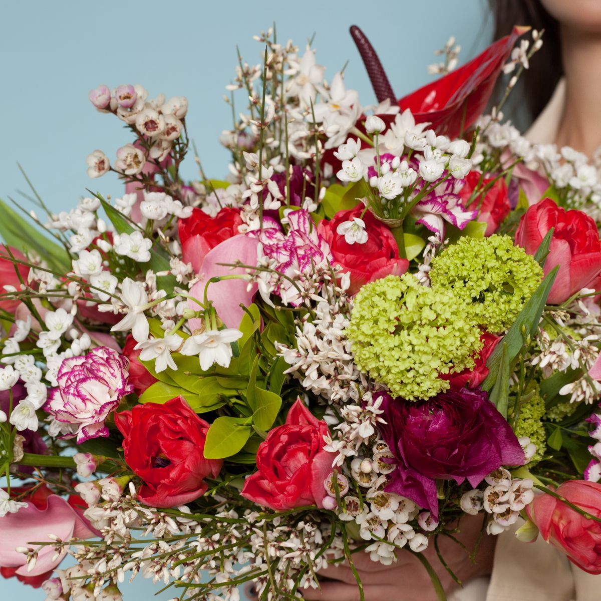 Оригинальная, стильная и эффектная цветочная композиция, каждый элемент которой заслуживает отдельного внимания. Работа представлена в популярном и практичном среднем размере. Состоит из тюльпанов, гвоздик, каллы, нарциссов, ранункулюса, шуазии. Это великолепный вариант для ярких и запоминающихся поздравлений. Благодаря внушительным габаритам и классической круглой форме, композиция станет достойным украшением любого интерьера и его стильным, колоритным и самодостаточным акцентом. Беспроигрышный выбор для приятного подарка по любому случаю или без повода. Вариант, который не может остаться незамеченным.
