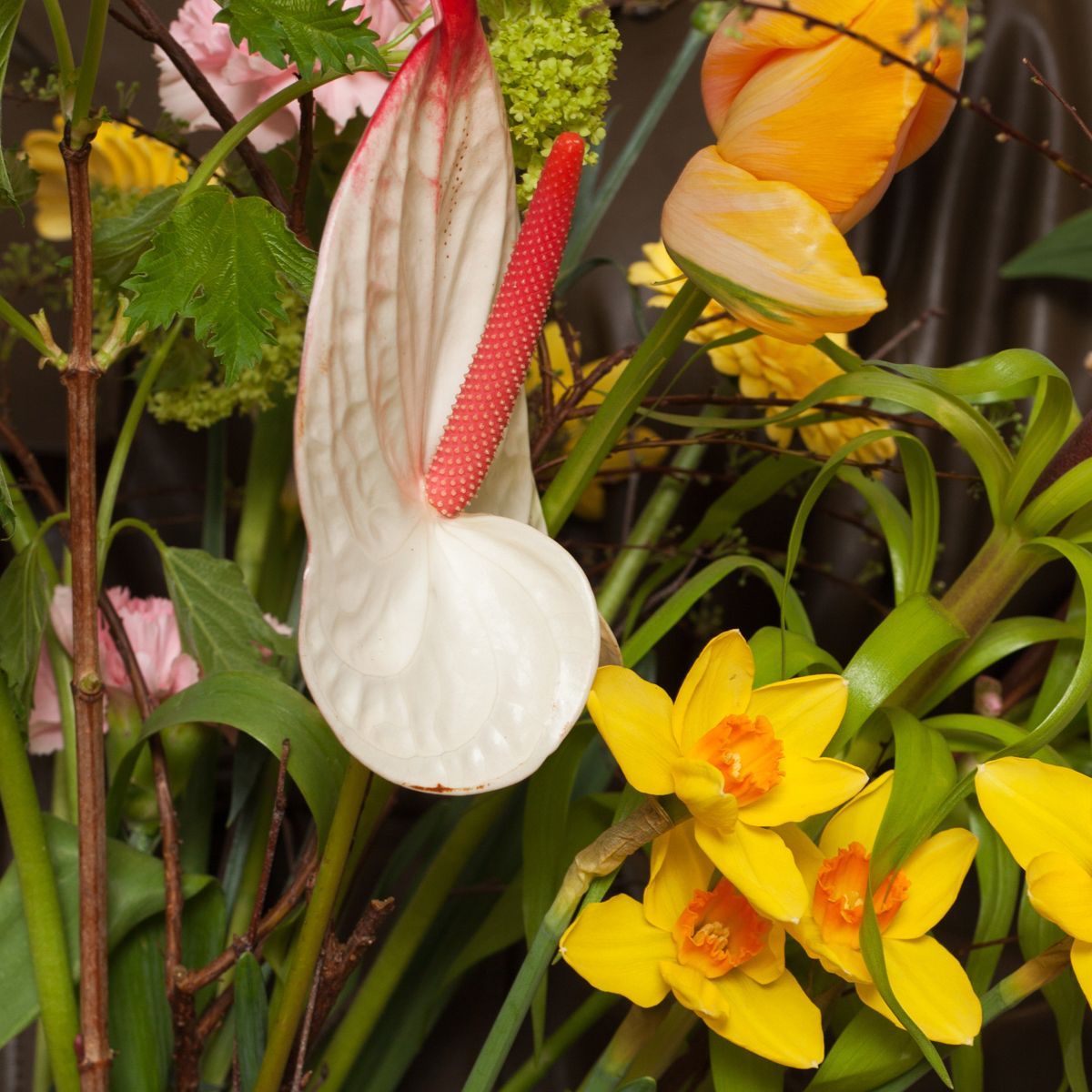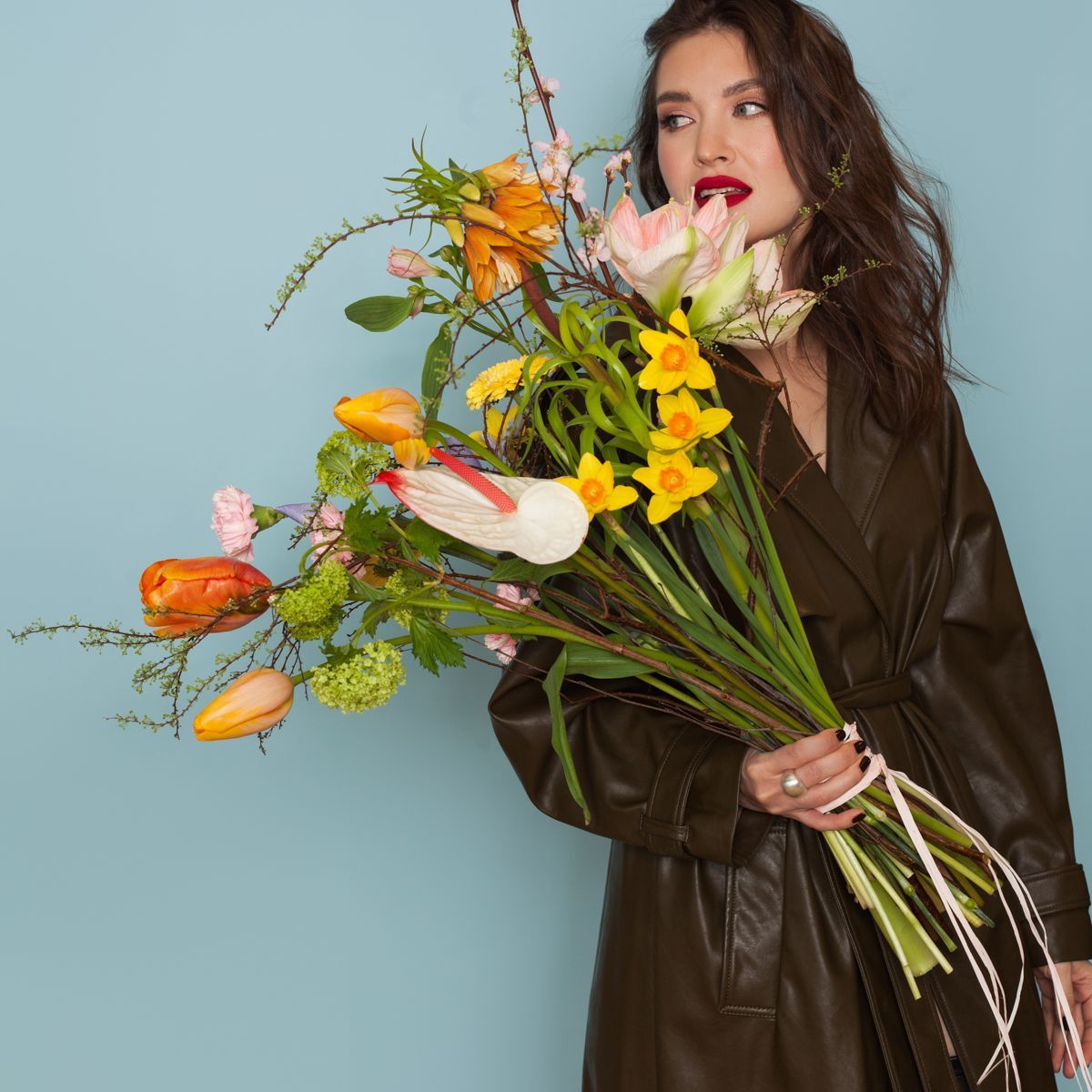 Яркая демонстрация того, как и небольшой букет может выглядеть презентабельно и эффектно. Собственно, назвать эту работу небольшой можно достаточно условно: ее высота около 1 метра, потому композиция смотрится солидно и объемно. Это современный пример флористики с ее лаконичностью, смелым сочетанием неожиданных деталей, экстравагантными формами и яркими дизайнерскими решениями. В букете гармонично сочетаются ирисы, мини-герберы, тюльпаны, нарциссы, альстромерии, антуриум, вибурнум, гвоздики, спирея, ветки березы. Великолепный вариант для тех, кто предпочитает небанальные подходы во флористике и самые смелые эксперименты в этом искусстве.