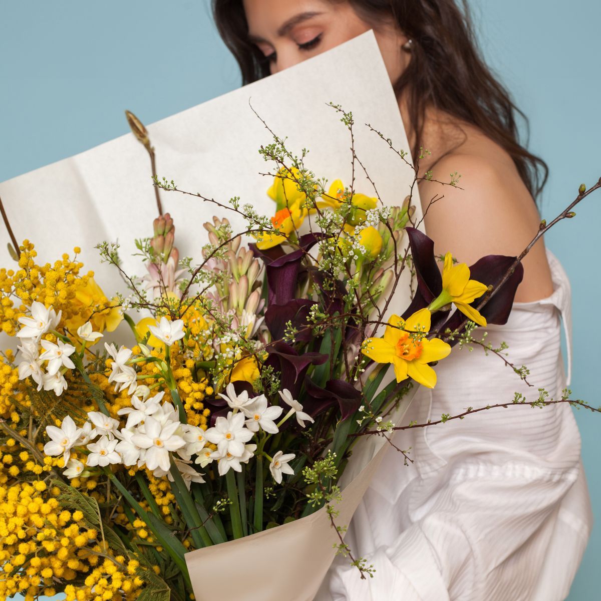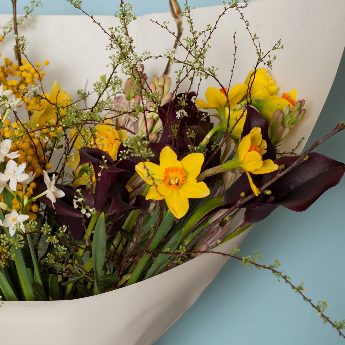 Нарциссы, каллы и спиреи ярко-желтого оттенка — весенний букет со свежим ароматом и романтичным видом. Поздравить девушку нежной композицией с большим количеством цветков с ветками березы, листьями фисташки и мимозой можно с 8 Марта, выпиской из роддома и другими событиями. Легкость поздравления поддерживает бумажная упаковка с лентой — она придает цветам непринужденности и очарования. Фото, цены и размеры сборок можно найти в каталоге интернет-магазина. В подарок к каждому заказу идет открытка для пожеланий. Купить цветочную красоту к празднику и без повода можно с доставкой.