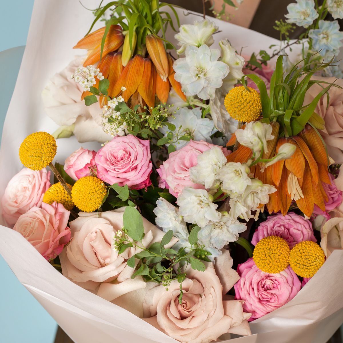 Близится День рождения, 8 марта или Новый год? Собираетесь продемонстрировать всю гамму ваших чувств? Тогда порадуйте вашего близкого человека роскошным и волнующим букетом из дельфиниумов, фритиллярий и роз. Яркие весенние расцветки, свежие ароматные растения, собранные заботливыми руками лучших флористов всегда станут замечательным дополнением к любому подарку и станут отличным аксессуаром для сказочно красивой фотосессии! Мы же гарантируем своевременную доставку точно в указанное время, прикладываем открытку к букету перед отправкой и присылаем фотографию цветочной композиции. Ждем ваших обращений и превратим любой будничный день в настоящий праздник!