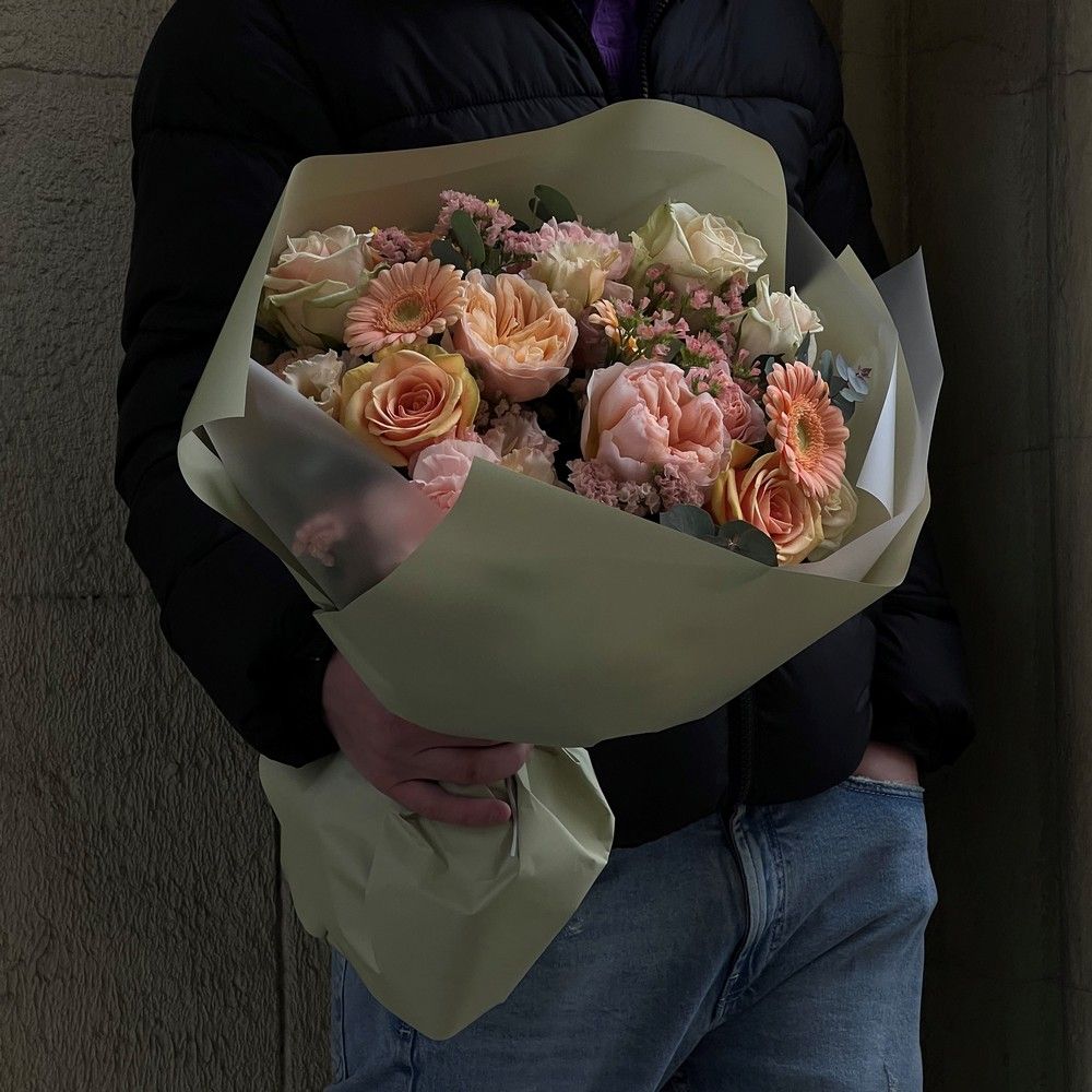 Современная интерпретация букета из роз (голландской и российской). Работа выполнена в актуальном дизайне, для ее основы, помимо собственно бутонов роз, выбраны гербера, эустома, гвоздика и статица. Гармоничное сочетание нежных оттенков цветов удачно подчеркнуто контрастным матовым графитовым фоном. Композиция выполнена в большом размере, идеально подходит для приятных поздравлений и стильных знаков внимания. К букету прилагается подарочная карточка для адресного поздравления получателя. Красивый выбор, подкупающий креативным выбором цветов и элегантным, сдержанным оформлением в лаконичном стиле.