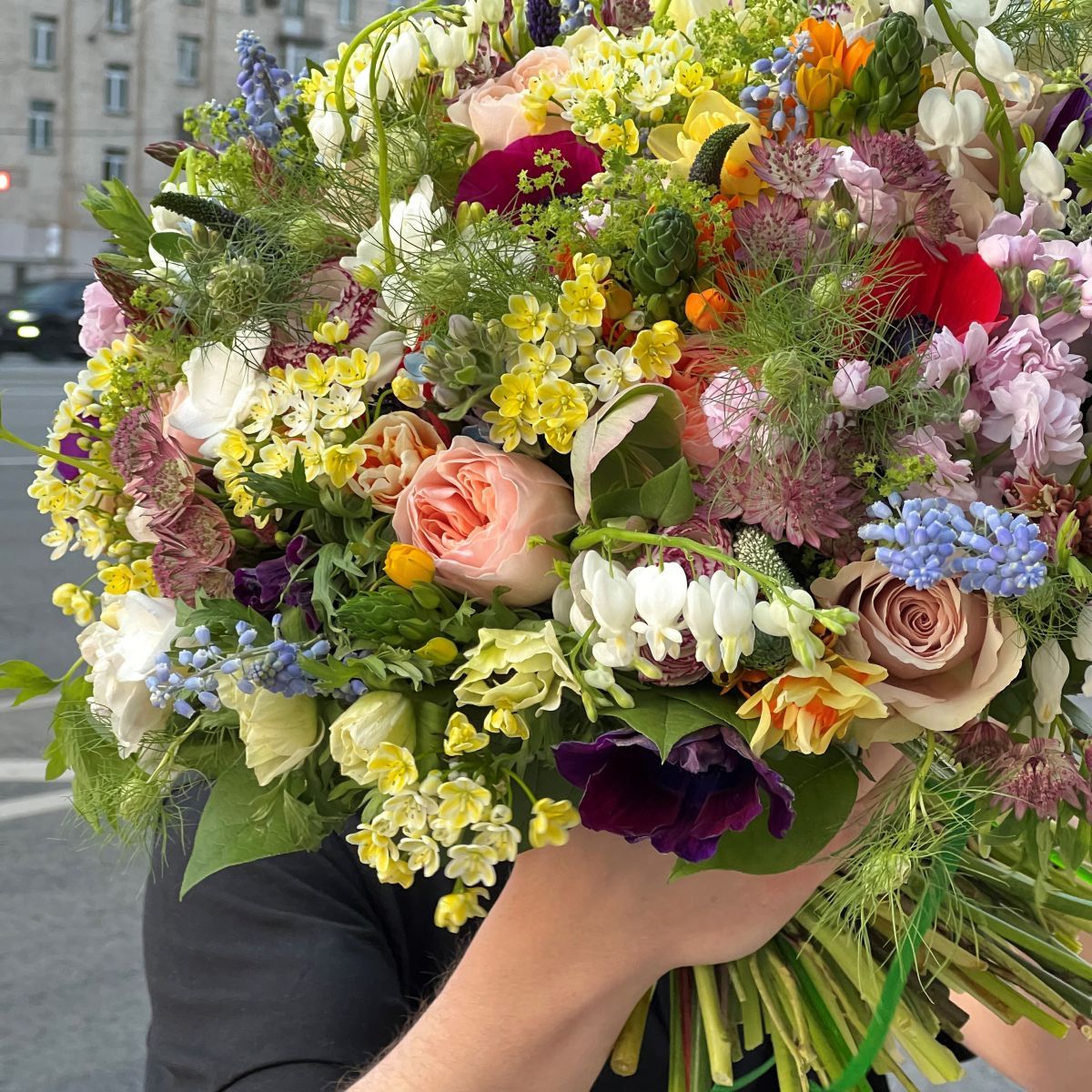 Необыкновенно яркий, интересный и оригинальный букет, способный произвести должное впечатление и надолго остаться в памяти получателя. Работа выполнена в большом размере, благодаря чему выглядит особенно масштабно и эффектно. Это идеальный вариант для тех случаев, когда традиционные букеты не подходят и нужны свежие флористические идеи. В работе использованы нарциссы, анемоны, розы (эквадорская, кустовая, голландская), вероника, маттиола, ранункулюс, орнитогалум, астранция, хелеборус. Яркая цветовая гамма букета великолепно дополняется свежей зеленью, которая придает композиции летний шарм.