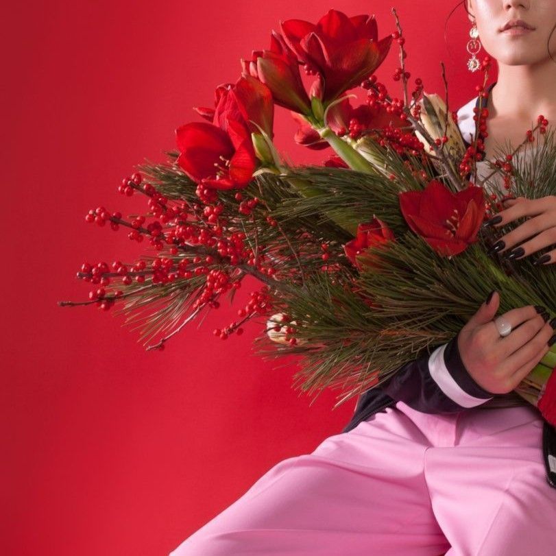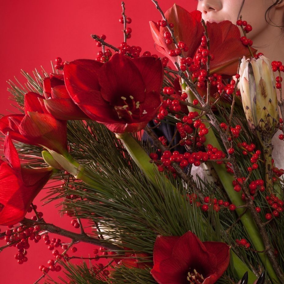 Букет из амариллисов, илекса и протеи №1835 самого большого размера