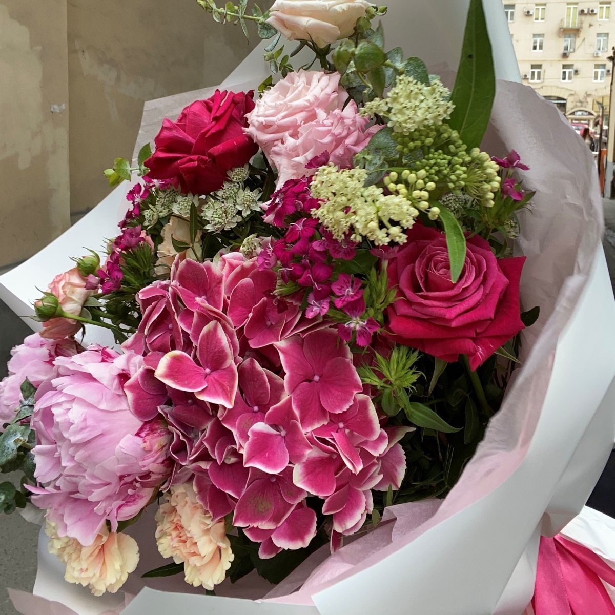 Пышная композиция, объединяющая объемные гортензии, нежные пионы и благородные розы, создает эффект подарка для особых случаев. Этот букет сочетает в себе, нежность и изысканность, производя незабываемое впечатление. Ключевые преимущества: Пышные гортензии с крупными соцветиями. Пионы с махровыми лепестками в сезон цветения. Свежие розы премиального сорта. Идеально сбалансированные пропорции. Идеальный выбор для: Важных юбилеев и торжеств. Романтических признаний. Дорогих подарков с глубоким смыслом. Букет оформляется в стильной упаковке с использованием декоративных элементов. Каждый цветок проходит строгий отбор по свежести и качеству. Доступна доставка в день заказа по Москве и области. Закажите это великолепное сочетание гортензий, пионов и роз для самых важных моментов жизни – букет, достойный королевского подарка.