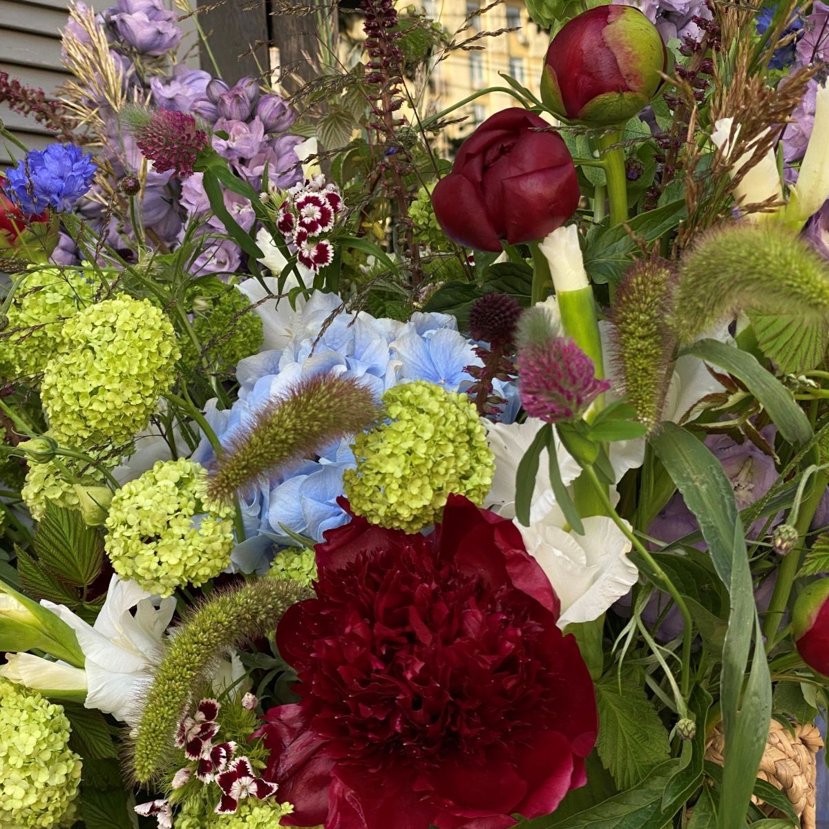 Эта корзина из пионов, дельфиниума и гвоздик собрала в себе все оттенки летнего восторга: бархатные пионы, стройные свечи дельфиниума и жизнерадостные гвоздики создают праздничный каскад. Купить такую корзину — значит получить готовый летний сад в миниатюре. Заказать эту композицию стоит тем, кто ценит контрасты — нежные пионы, графичный дельфиниум и яркие гвоздики образуют идеальный баланс роскоши и простоты. Особенно хороша корзина для торжественных событий — она одинаково эффектно украсит и свадебный банкет, и юбилейный стол. Доставка по Москве осуществляется в защитной упаковке, сохраняющей безупречный вид каждого цветка.