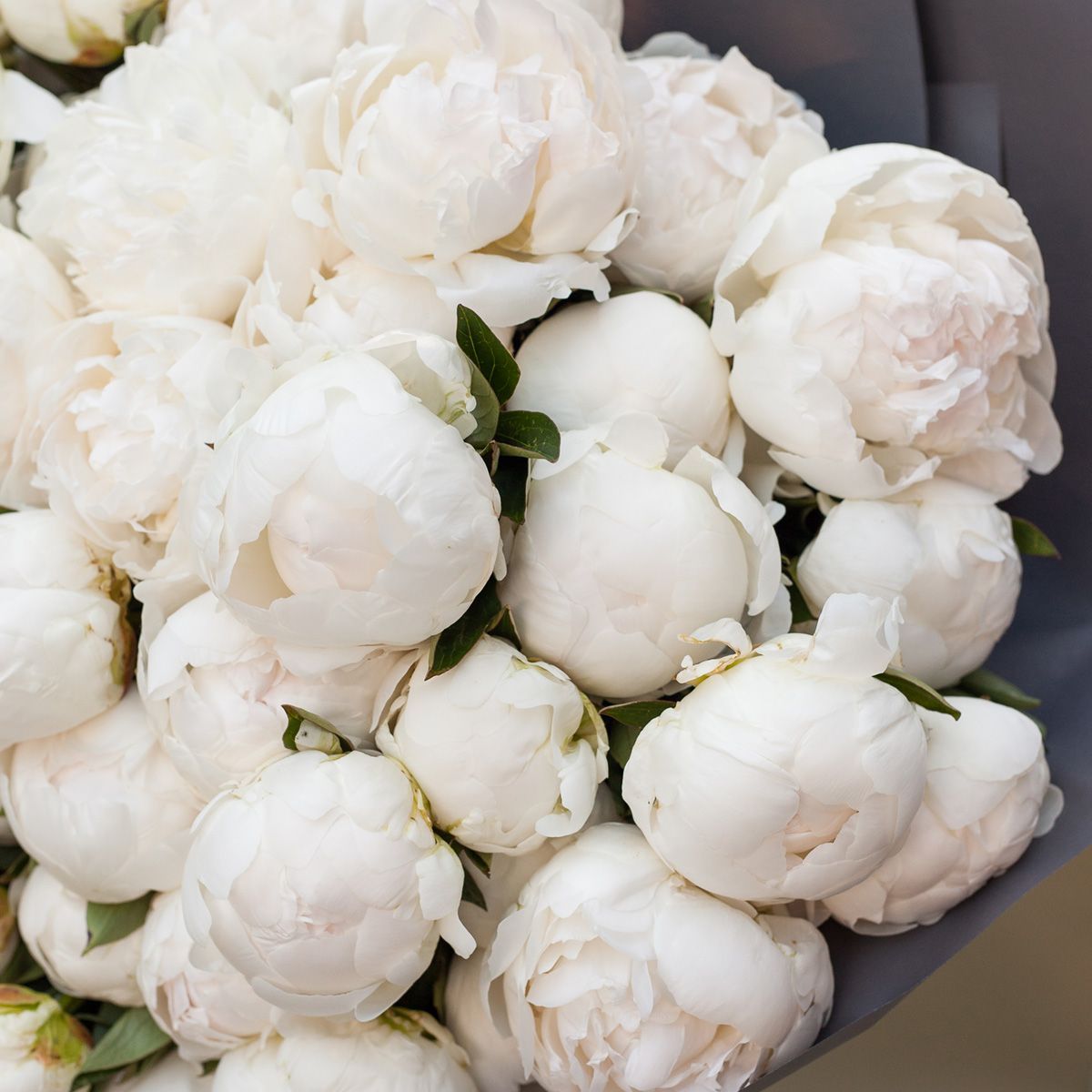 Почти все девушки называют среди любимых цветов пионы. Ведь объемные бутоны – воплощение романтики и легкости, которыми уместно поздравить с днем рождения или другим праздником. Белый оттенок красивых цветков в количестве 39 штук делает их похожими на летящие в небе облака, что необычно выглядит на фото. Немного «приземляет» букет матовая упаковка серого цвета с лентой. Внутрь заказа в виде свежей композиции мы положим открытку для пожеланий. Сборка подарка в каталоге интернет-магазина возможна в любом размере по доступным ценам. Предлагаем купить цветочное поздравление с доставкой к событию.