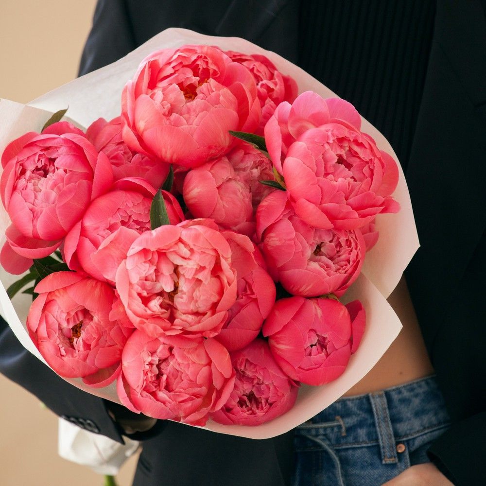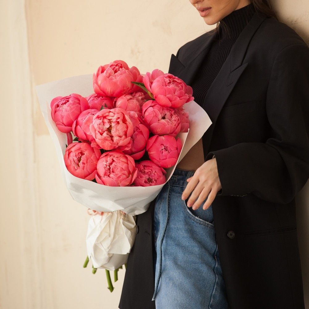 Потрясающий, нежный, женственный букет в элегантном, достаточно редком коралловом оттенке. На фоне классического белоснежно-белого оформления бутоны пионов выглядят особенно сочно, нарядно и максимально колоритно. Это отличный вариант для стильного поздравления с любым праздником, эффектного и приятного знака внимания, красивого комплимента. Монобукет из коралловых пионов станет достойным украшением любого торжества, а в интерьер внесет акцент модного лоска. В работе использовано 15 крупных пионов одного оттенка.
