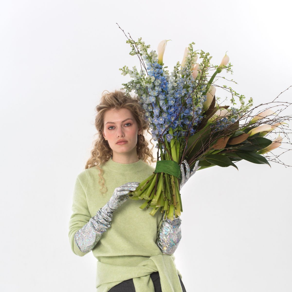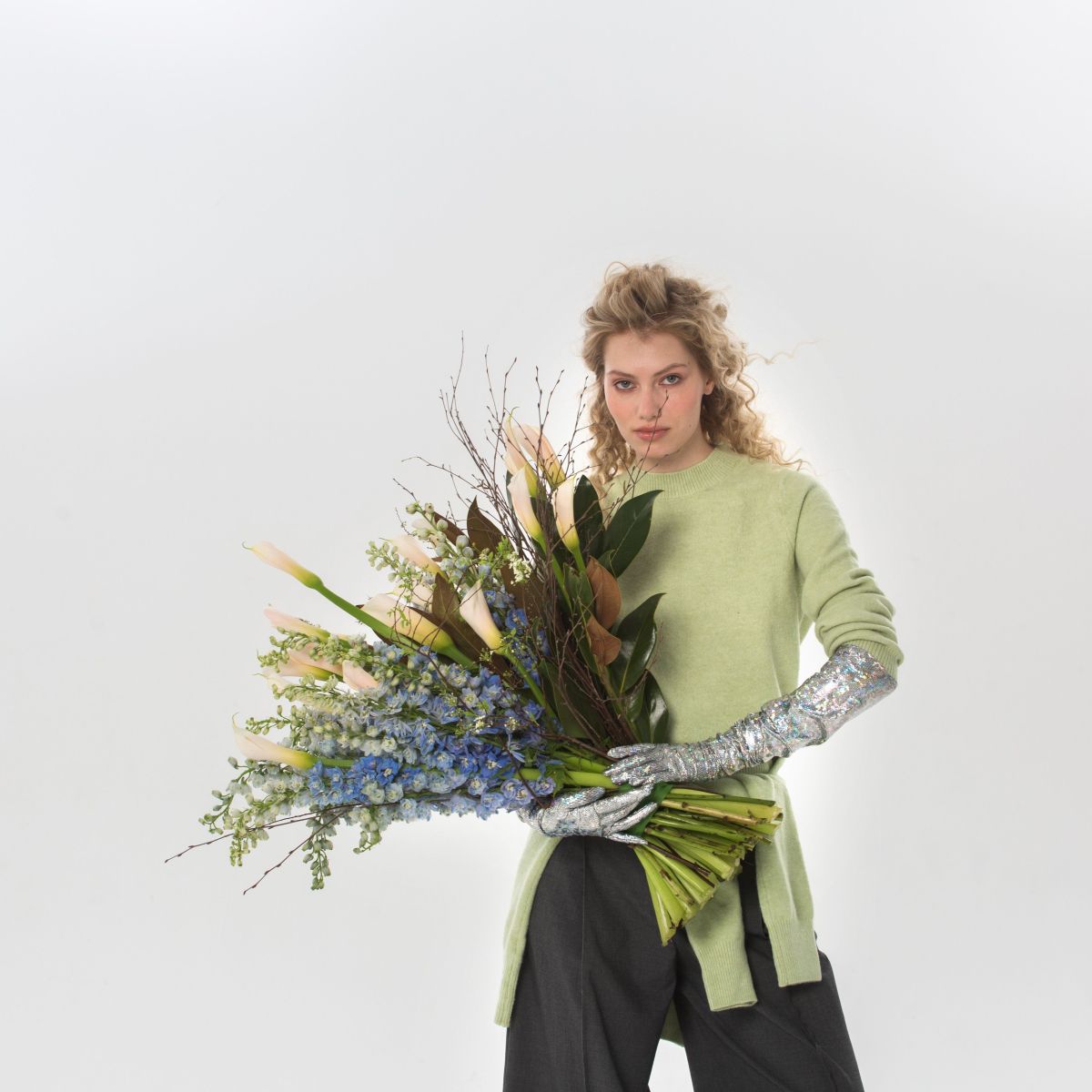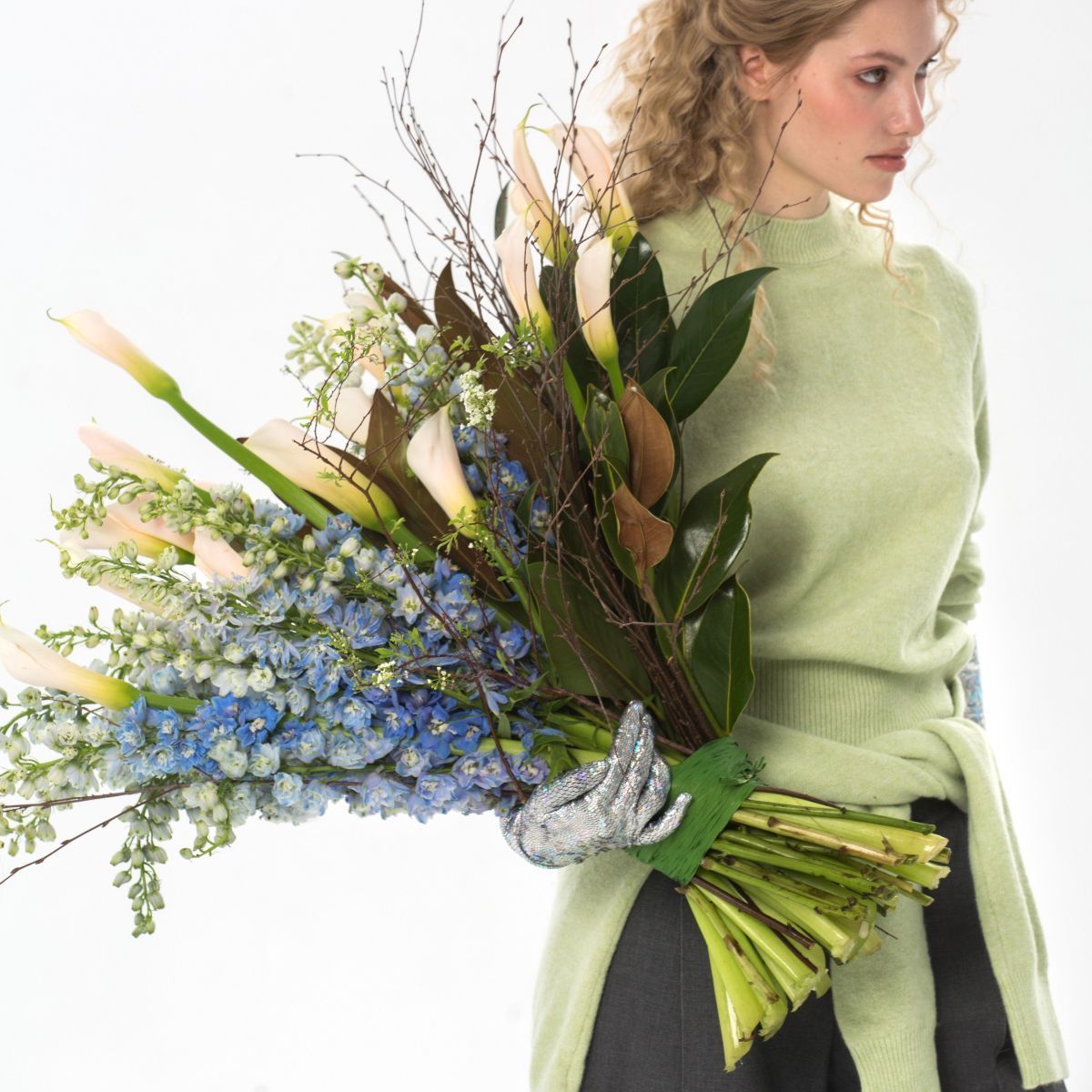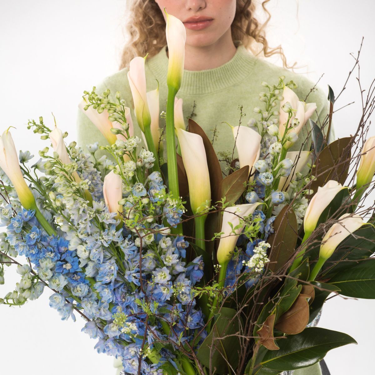 Букет из дельфиниумов и калл №2047 самого большого размера