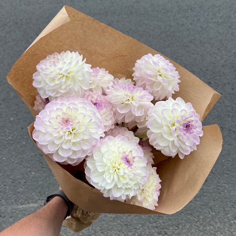 Пышные белоснежные георгины - красивый выбор для стильных и элегантных поздравлений по любому поводу. Их объемные бутоны великолепно выглядят в формате моно букета, формируя ажурный цветочный купол. Благодаря использованию лаконичной крафтовой упаковки, композиция выглядит современно, в духе актуальных трендов во флористике. Достойный вариант для эффектных поздравлений, запоминающихся знаков внимания и элегантных комплиментов. Белоснежная цветовая гамма делает работу универсальным выбором для любых праздничных мероприятий.