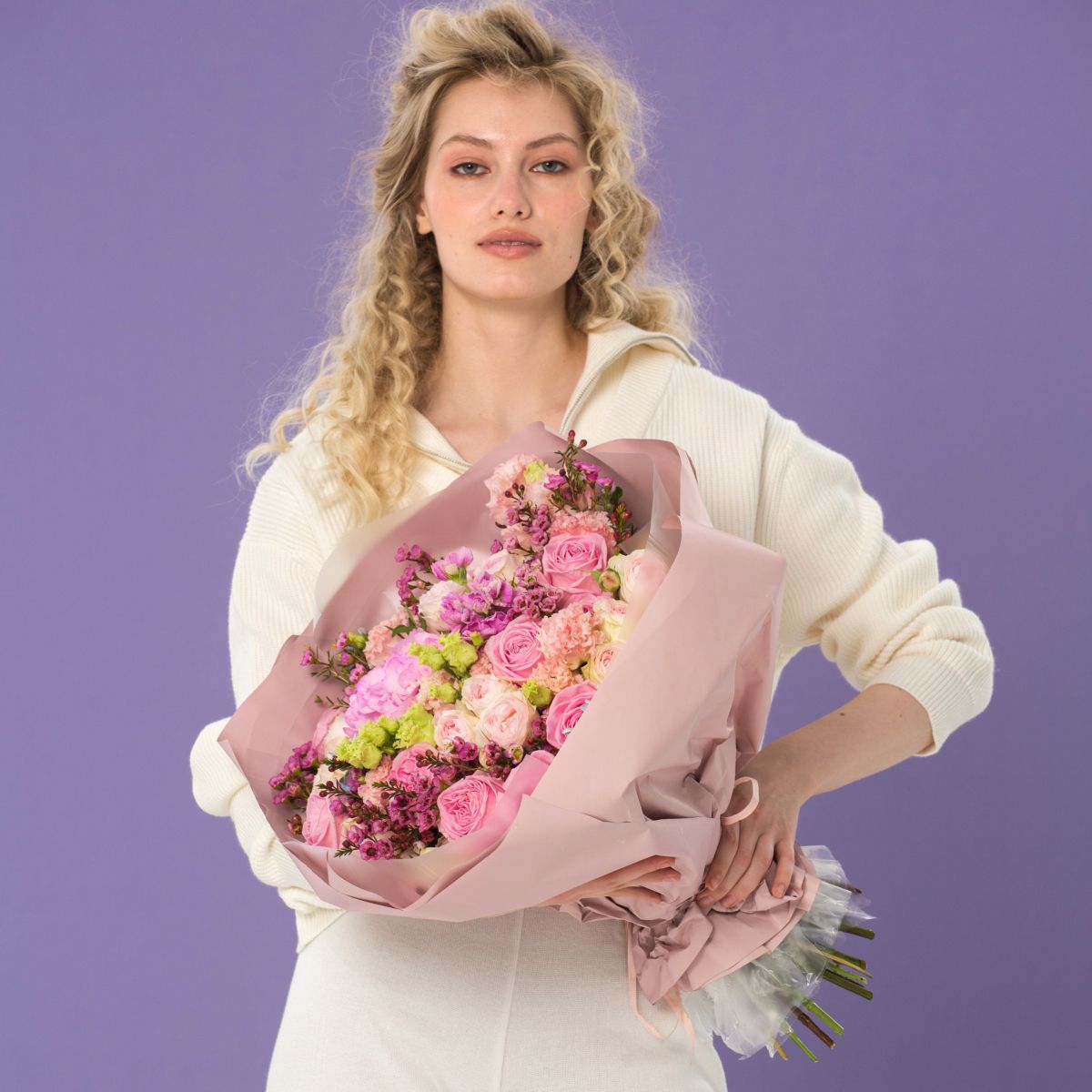 Очень понравился аромат — нежный, но при этом насыщенный, наполнил весь дом. Цветы простояли больше недели, не потеряли свежесть и радовали всё это время. Приятно удивило внимание к деталям — даже ленточка была подобрана в тон композиции. Немного переживала из-за цвета, но результат превзошёл ожидания — всё идеально. Букет отлично подошёл под мой запрос, выглядит изысканно и современно. Заказ оформляла онлайн, всё прошло легко и понятно, осталась довольна сервисом.