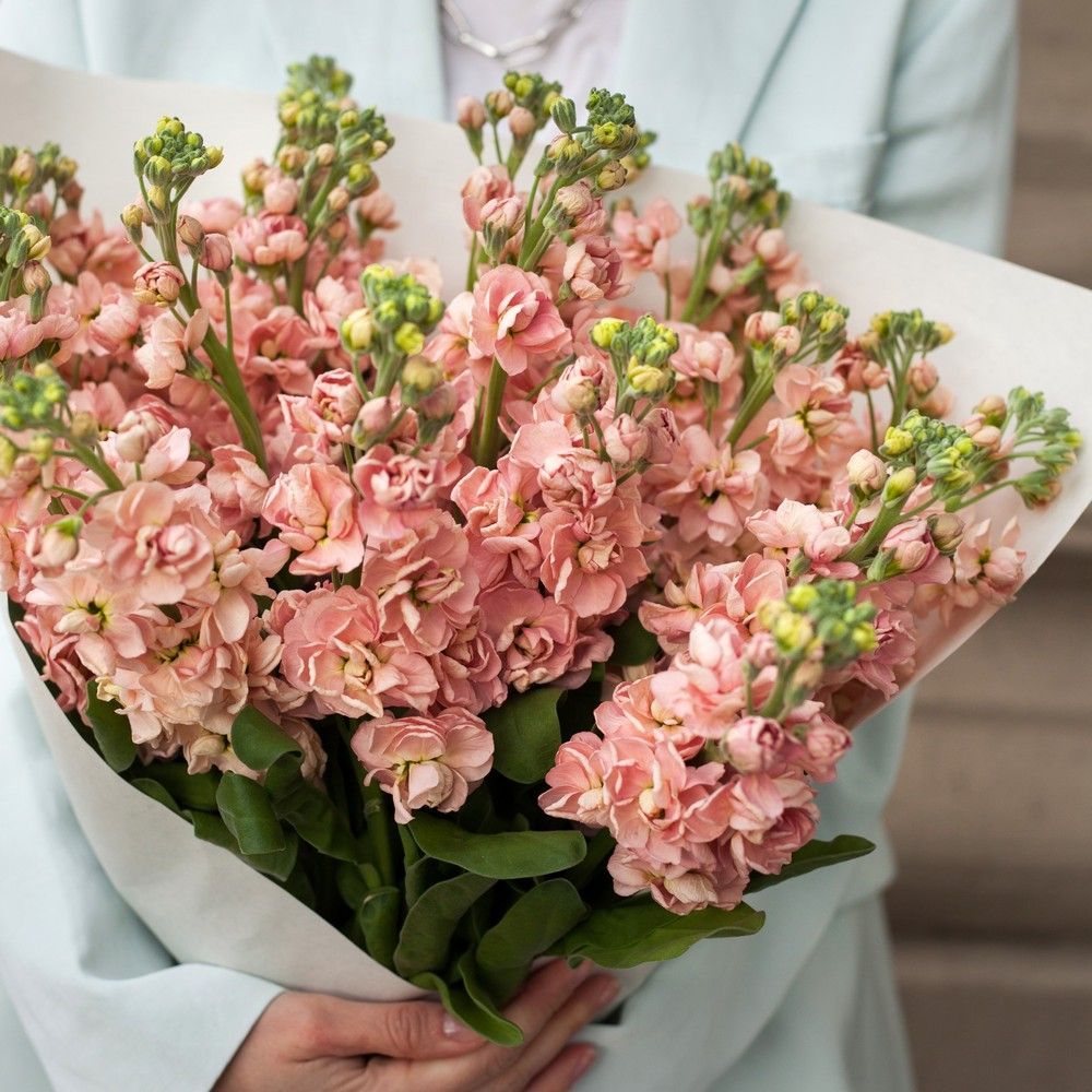 Потрясающий букет из стильной, элегантной, экзотической маттиолы. В работе использованы соцветия благородного оттенка пыльной розы, которые в сочетании с сочной зеленью выглядят особенно свежо, колоритно и нарядно. Композиция оформлена в классическом стиле, идеально подходит для романтических признаний, комплиментов и красивых знаков внимания. Букет станет отличным украшением любого интерьера, достойно украсив его изящной, хрупкой, естественной красотой маттиолы. К работе прилагается поздравительная открытка.