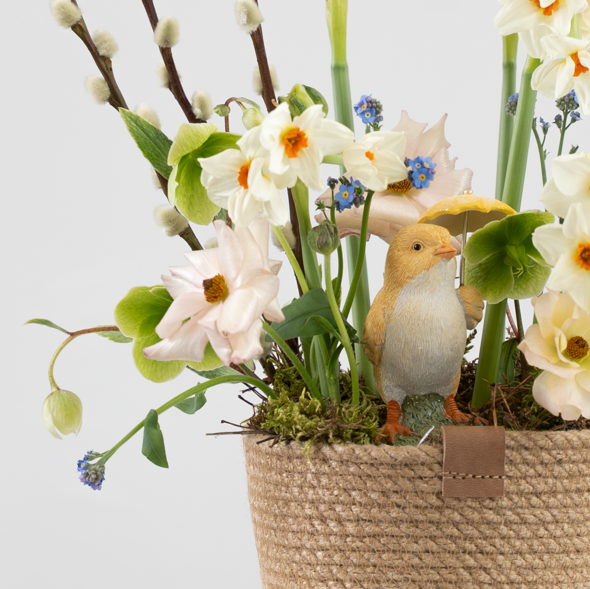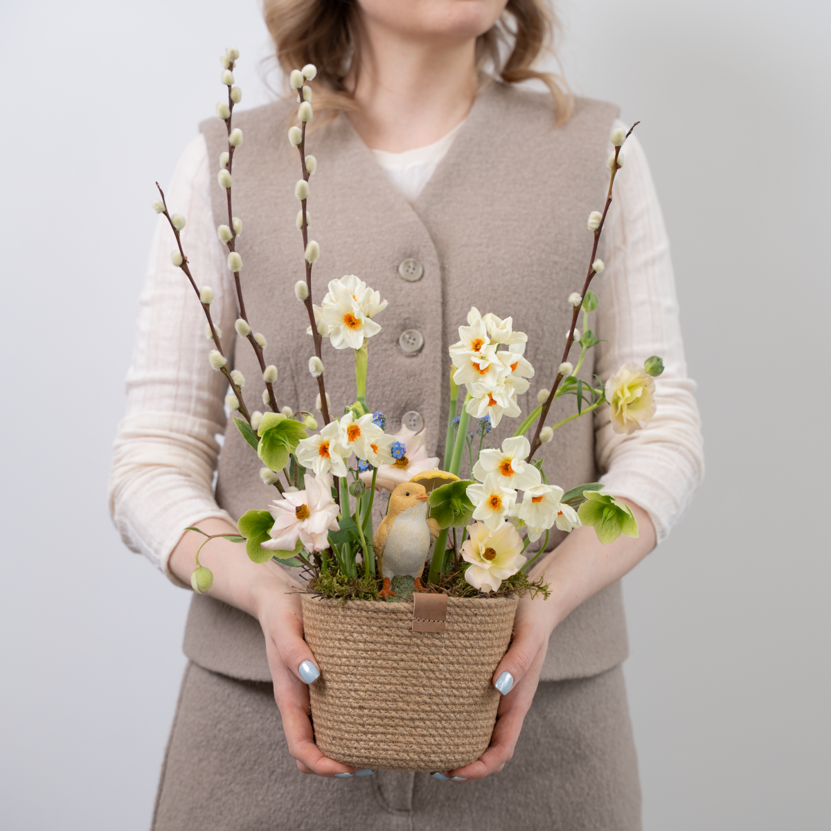 Встретьте светлый праздник Пасхи с изысканной композицией из свежих нарциссов и пушистой вербы. Эта трогательная флористическая работа сочетает нежность первых весенних цветов и традиционные пасхальные символы, создавая атмосферу праздника и тепла. Особенности композиции: Свежесрезанные нарциссы с тонким весенним ароматом. Натуральные веточки вербы с мягкими почками. Традиционное пасхальное оформление.. Долго сохраняет свежесть и праздничный вид. Подходит для украшения праздничного стола. Идеальное решение для: Пасхального подарка родным и близким. Украшения дома к празднику. Создания весеннего настроения. Каждый элемент тщательно отбирается для создания гармоничного пасхального ансамбля. Закажите эту праздничную композицию с доставкой по Москве и области, чтобы сделать Пасху по-настоящему теплой и запоминающейся. Доступны варианты разного размера и оформления под ваш вкус. Подарите весеннее настроение и пасхальную радость с этой трогательной композицией из символов обновления и возрождения.