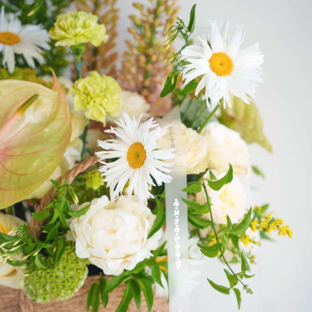 Подарите незабываемые эмоции с нашей великолепной цветочной корзиной! В основе – пышные, нежные пионы, олицетворяющие роскошь и романтику. Их дополняют яркие, элегантные антуриумы с бархатистыми соцветиями, добавляющие тропический шарм и графическую выразительность. Свежие белые ромашки вносят ноту чистоты, легкости и деревенского очарования. Этот контрастный букет, собранный с любовью в стильной корзине, поражает объемом и гармонией форм и оттенков. Идеальный подарок для особого случая, способный сказать больше слов.