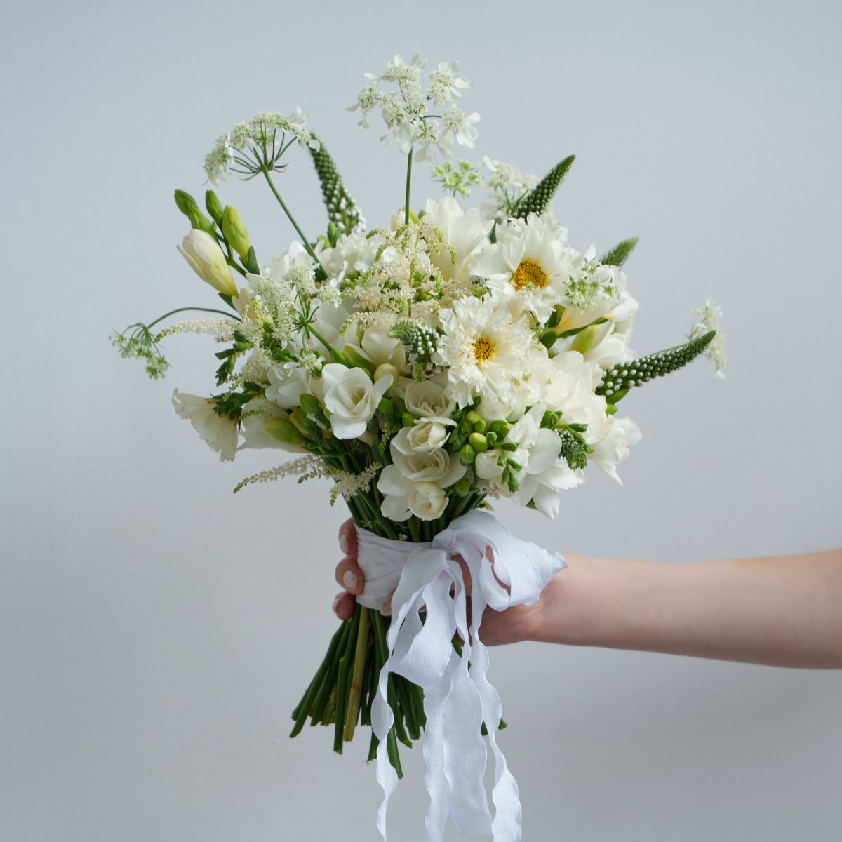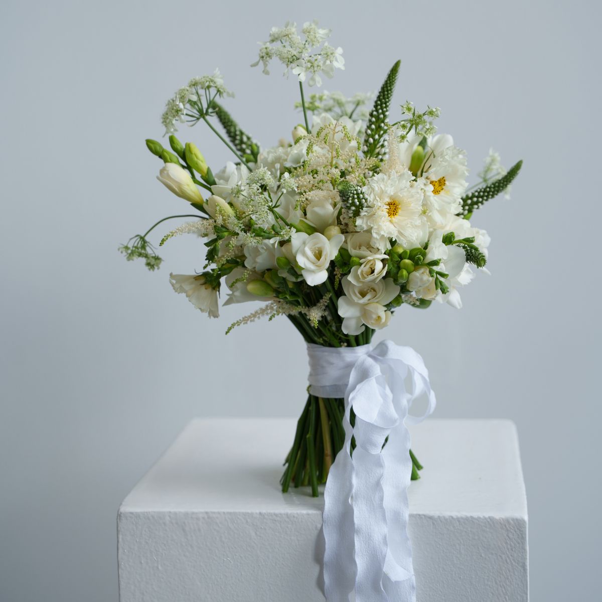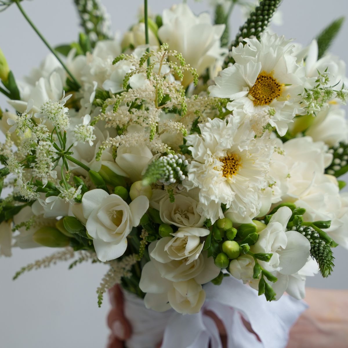Воздушное кружево белоснежной астильбы, нежные колокольчики ароматной фрезии и золотистые свечи лизимахии создают этот изысканный букет. Идеальный баланс легкости и объема, текстуры и элегантности. Свежий, романтичный, с нотками аристократичной простоты – он подчеркнет нежность образа и будет удобно лежать в руках. Символ света, радости и начала новой жизни. Долговечен в течение всего торжества.