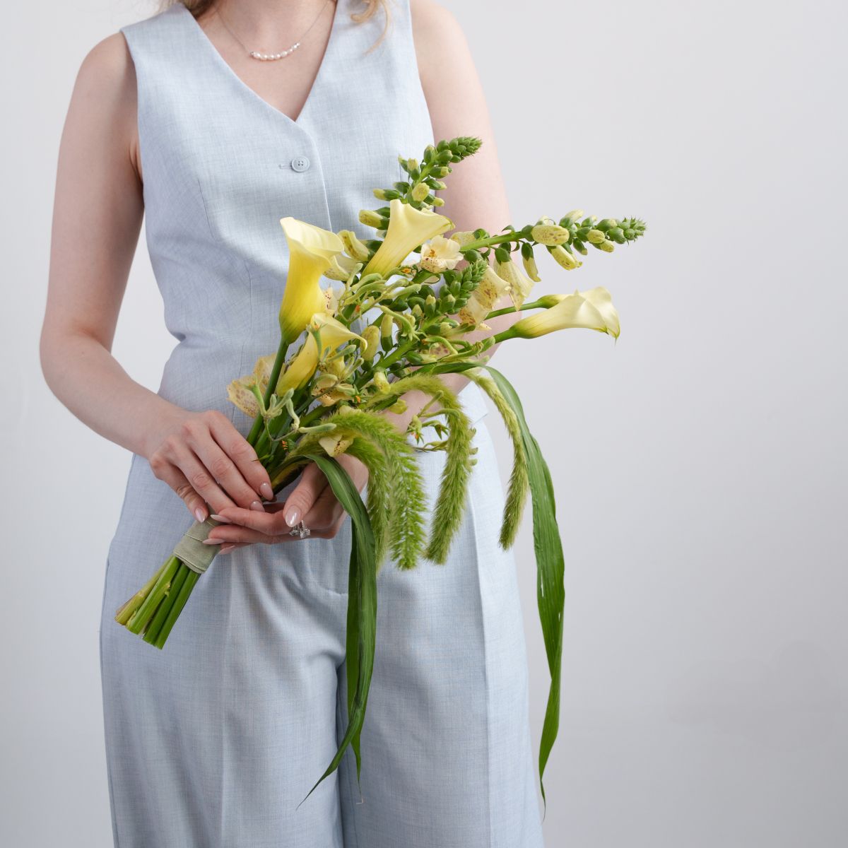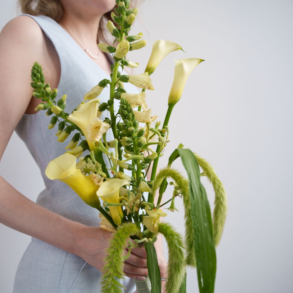 Этот букет – скульптура из цветов. Благородные каллы задают чистоту линий, дигиталис добавляет вертикальный ритм и изящество, а пушистые соцветия анигозантуса вносят элемент дикой природы и тепла. Современный, выразительный, полный текстуры. Подарок для сильной личности или шикарное украшение интерьера. Динамичное сочетание гладких калл, устремленных колокольчиков дигиталиса и фактурного анигозантуса. Смелый контраст форм и текстур, элегантная экзотика. Свежий, стойкий, запоминающийся. Для тех, кто ищет необычное.