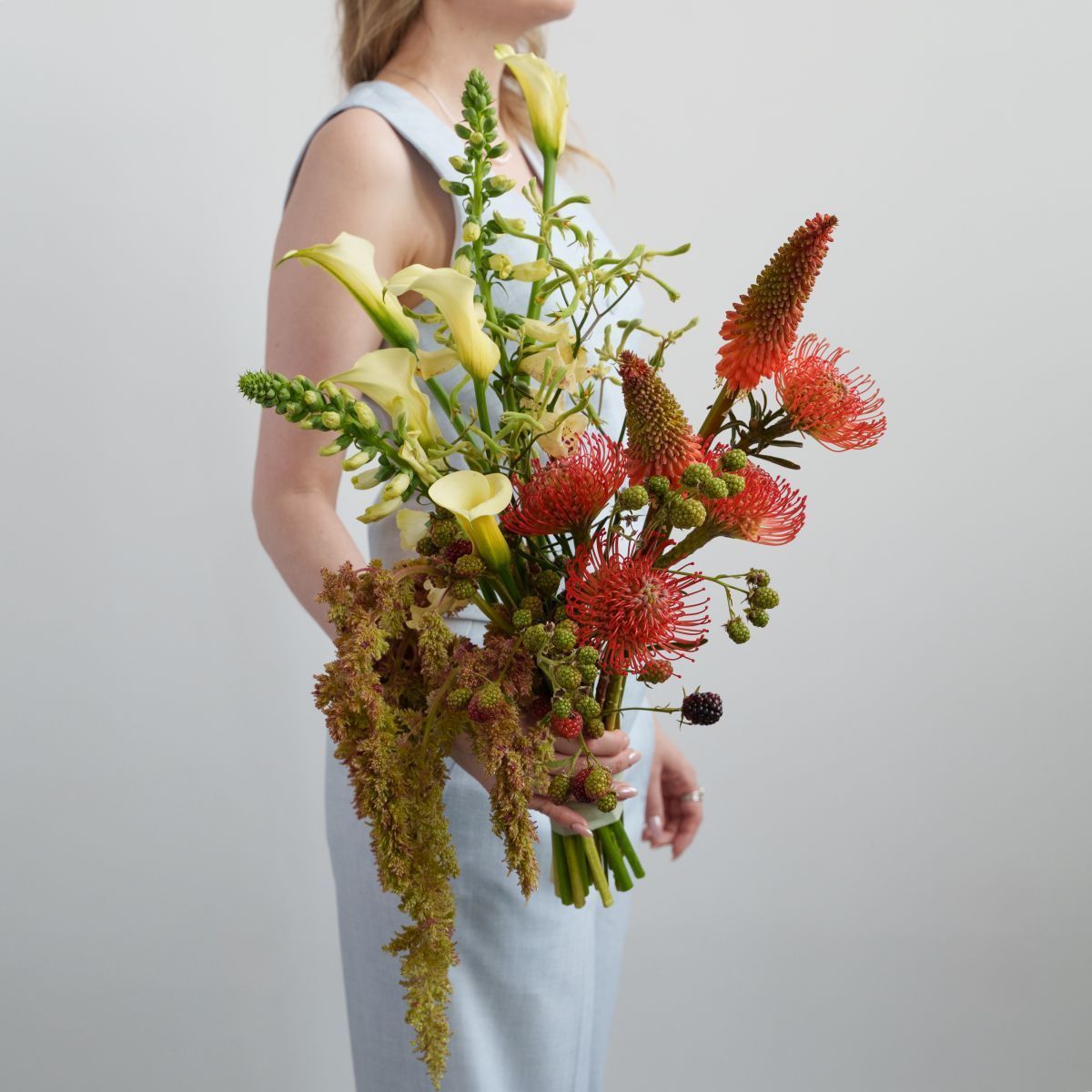 Чистые линии белоснежных калл встречаются с дерзкими факелами огненно-рыжей нутнафии (книфофии). Контраст гладкой элегантности и дикой энергии. Символ страсти, обузданной изысканным вкусом. Идеален для сильных, уверенных личностей, юбилеев или смелых признаний. Долговечен, стойкий, производит незабываемое впечатление.