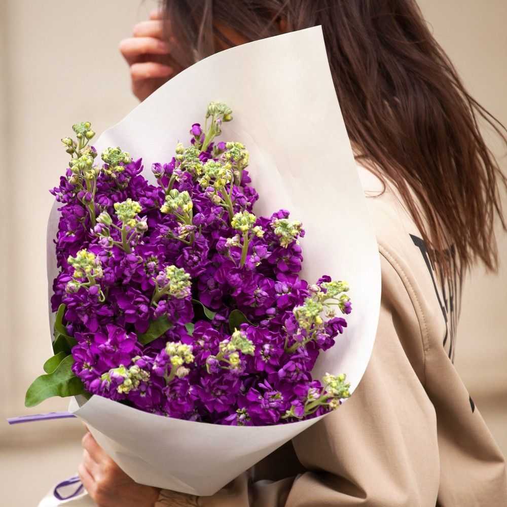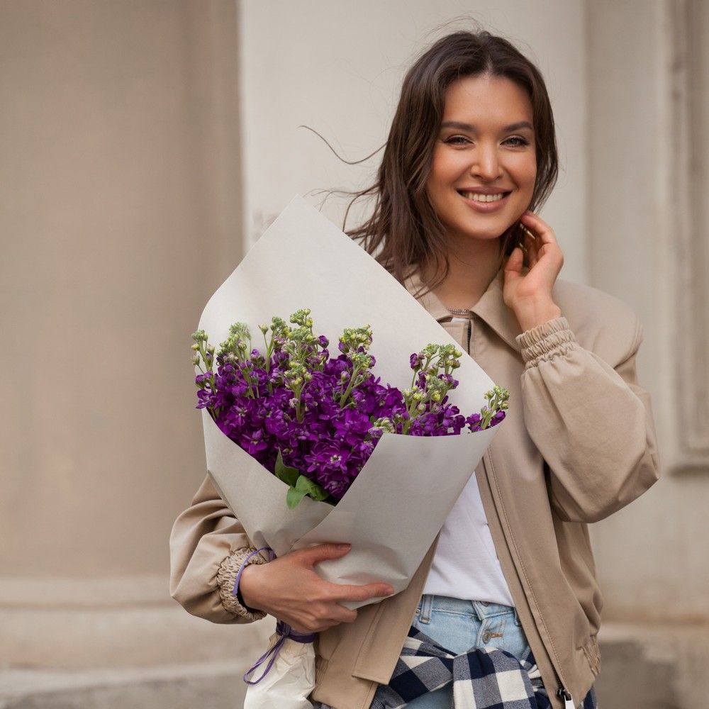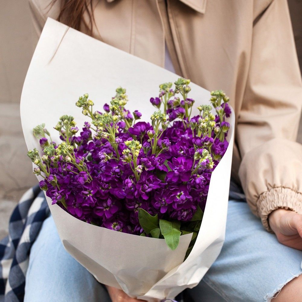 Изящный, нежный и утонченный букет из изысканной маттиолы – красивый выбор для романтических признаний, эффектных комплиментов или стильных поздравлений по любому поводу. Сочные соцветия маттиолы особенно колоритно выглядят на фоне белоснежного оформления букета. Эффектная цветовая гамма композиции делает ее яркой, нарядной и праздничной. Достойный вариант для тех, кто предпочитает актуальные дизайны и современный лаконичный стиль во флористике. Работа представлена в большом размере, гармонично украсит собой любое торжество или мероприятие.