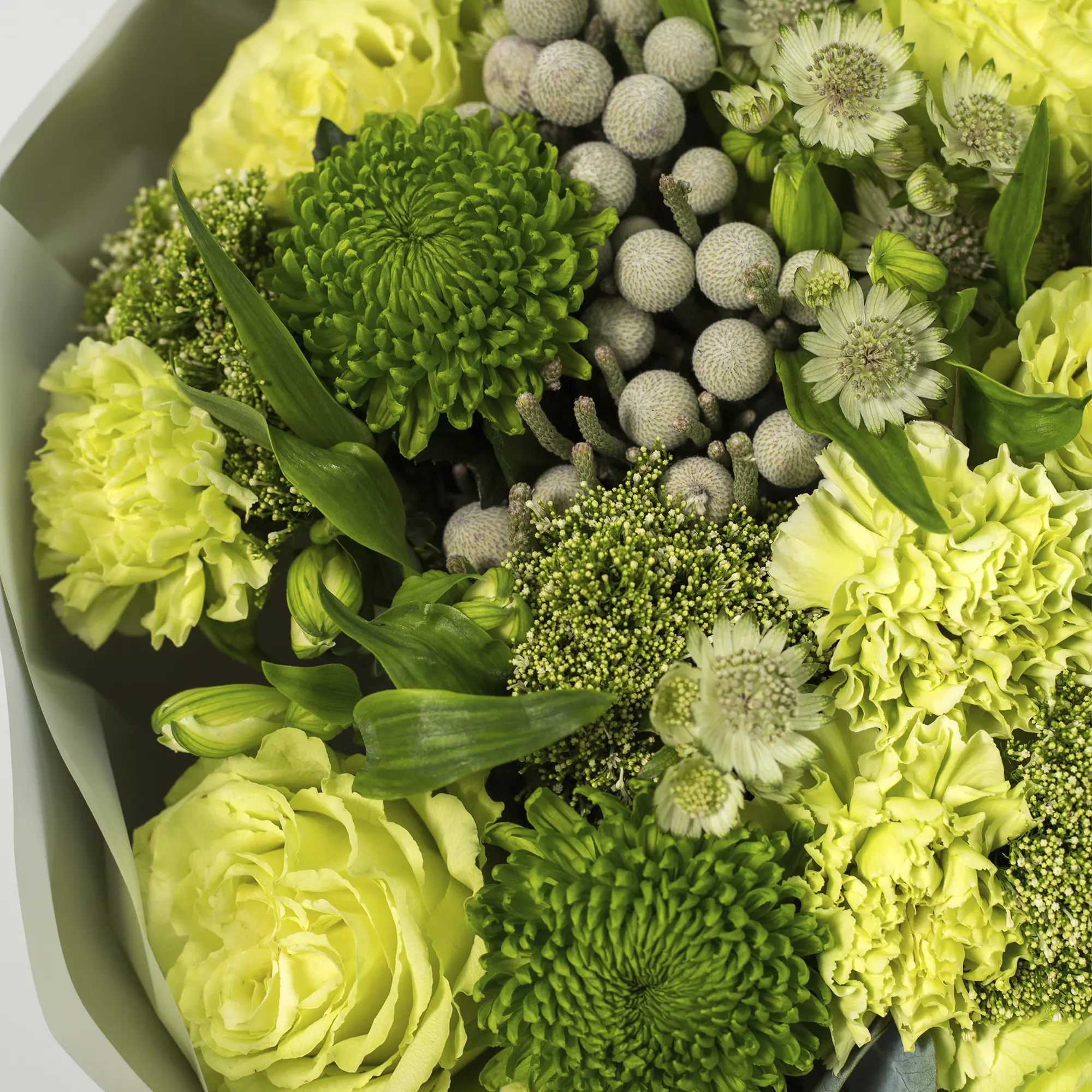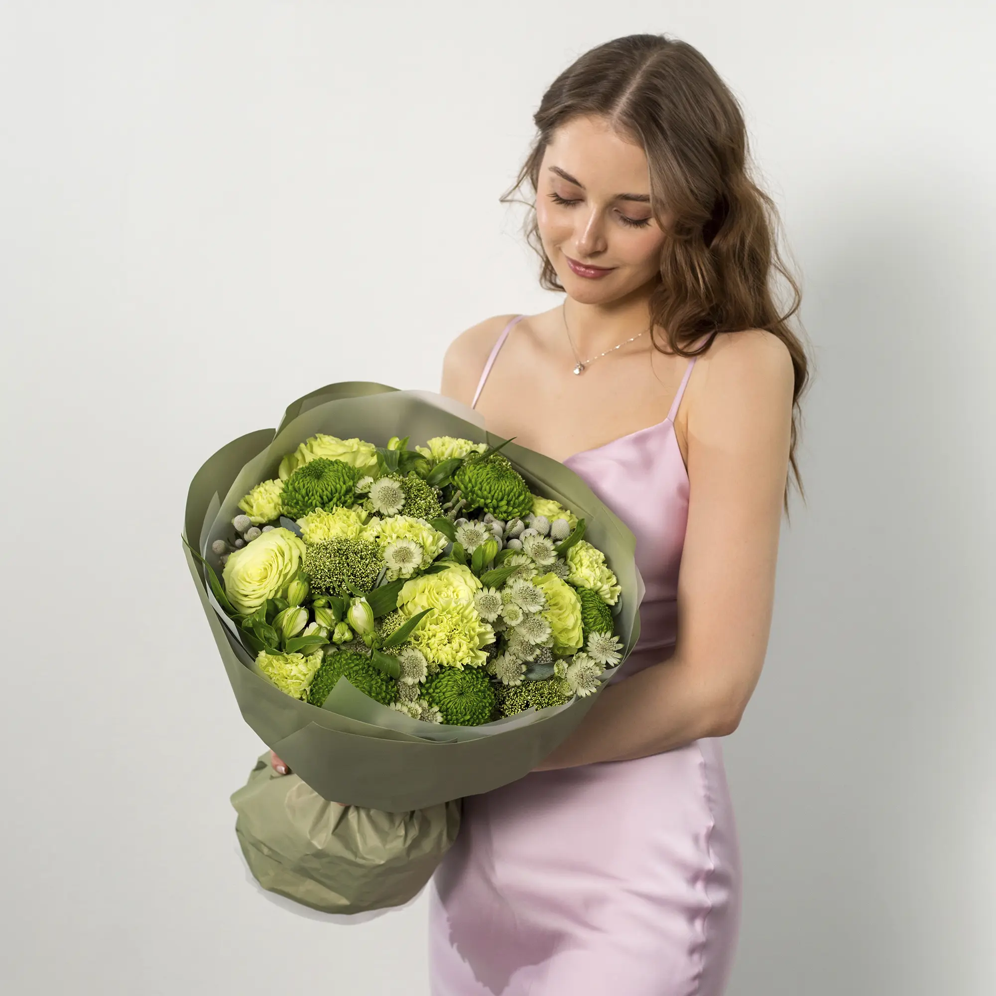 Этот букет — гармоничное сочетание нежности и стойкости. Пышные бутоны роз придают композиции изысканность и романтичность, объёмные хризантемы создают сочный цветовой акцент, а элегантные гвоздики добавляют графичности и завершённости образу. Сочетание трёх видов цветов символизирует прочность чувств, искренность намерений и долговечность отношений. Букет смотрится одновременно торжественно и естественно, подходит для самых разных поводов — от признания в любви до выражения глубокой благодарности.