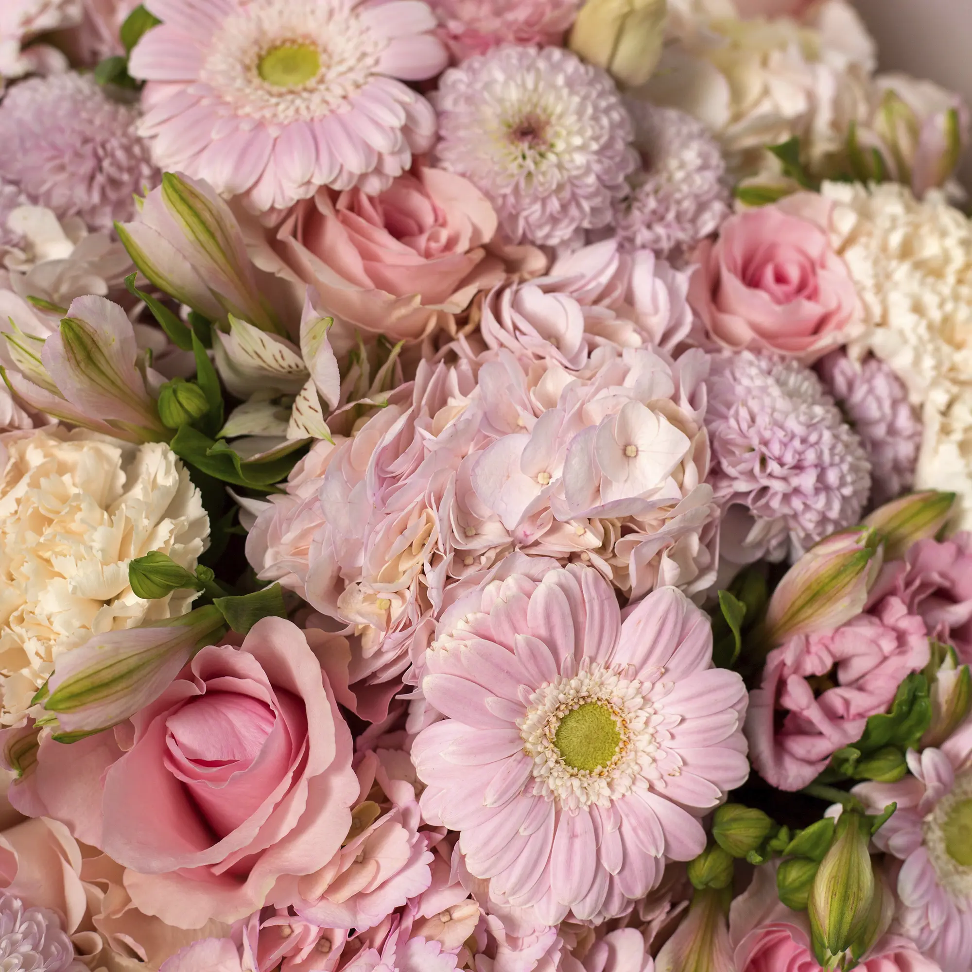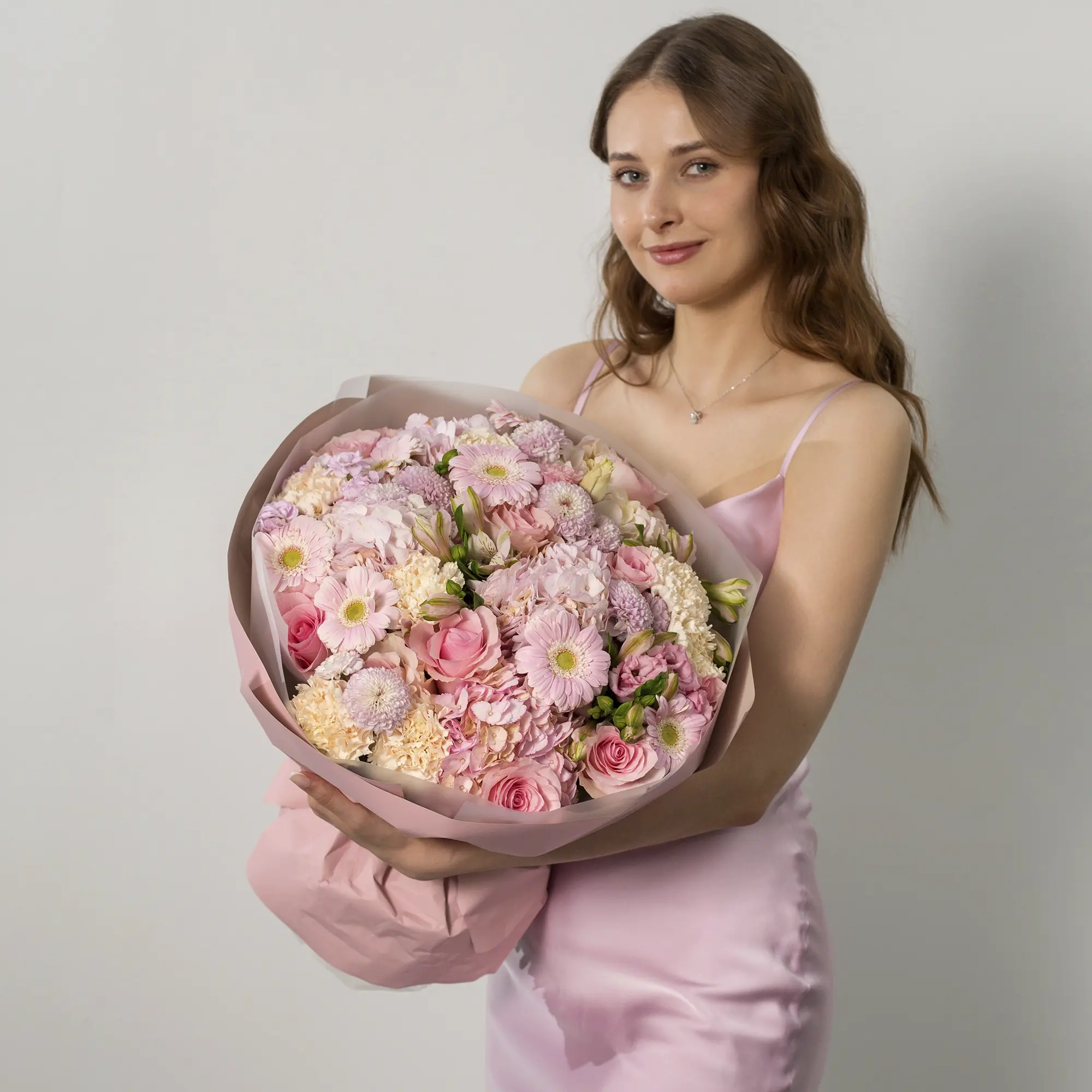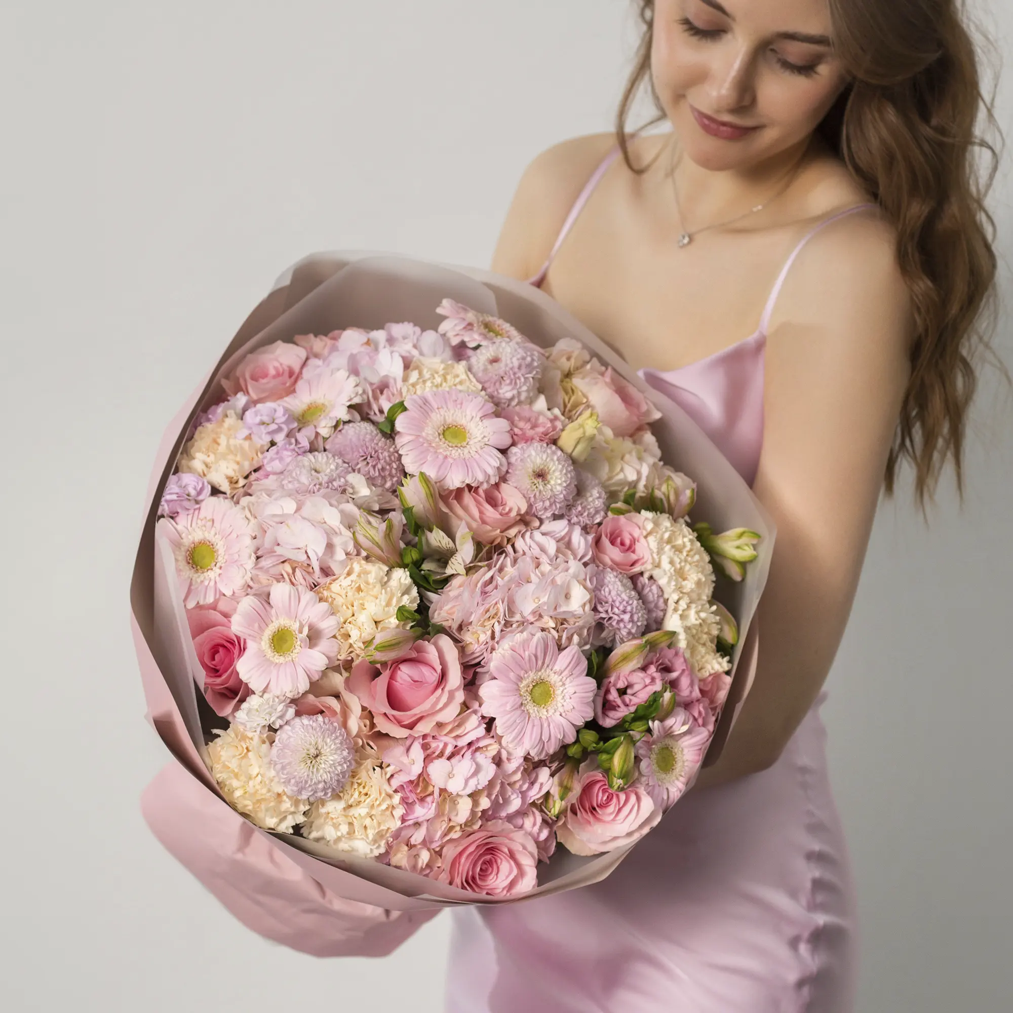 Этот букет — гармоничное сочетание яркости и утончённости, где каждый цветок дополняет друг друга, создавая жизнерадостную, но при этом изысканную композицию. Хризантемы выступают основой аранжировки: их пышные соцветия придают букету объём и сочность, задавая насыщенный цветовой тон. Эти цветы символизируют радость и долголетие, наполняя композицию позитивной энергией и теплом. Маттиолы вносят в букет особое очарование — их нежные, словно кружевные соцветия создают воздушный акцент и добавляют деликатный аромат. Мелкие цветки маттиолы формируют мягкие переходы между крупными элементами, придавая композиции лёгкость и романтичность. Альстромерии привносят графичность и выразительность: их изящные лепестки с контрастными штрихами и пятнами создают интересный визуальный ритм. Эти цветы добавляют букету изысканности и динамичности, подчёркивая продуманность каждой детали.