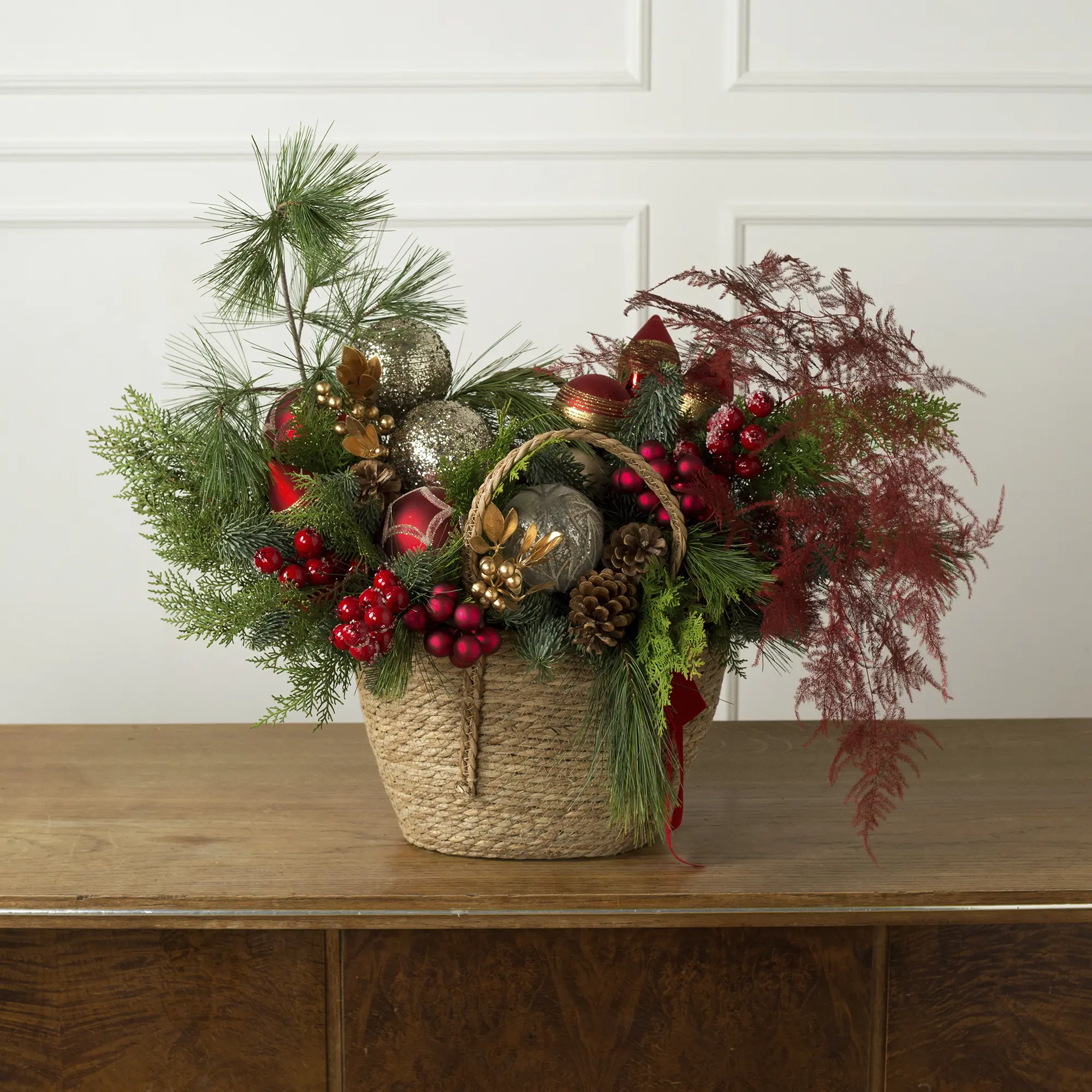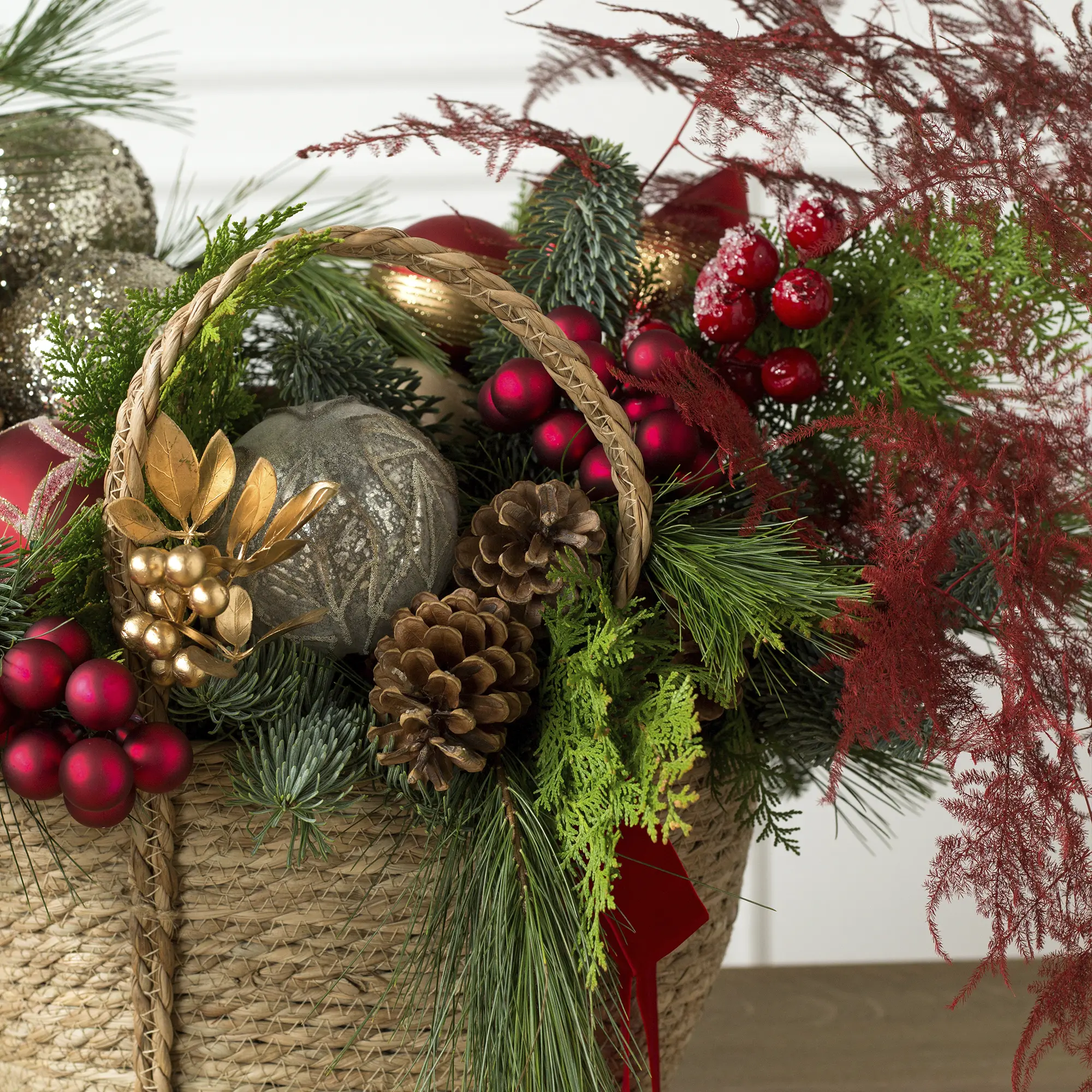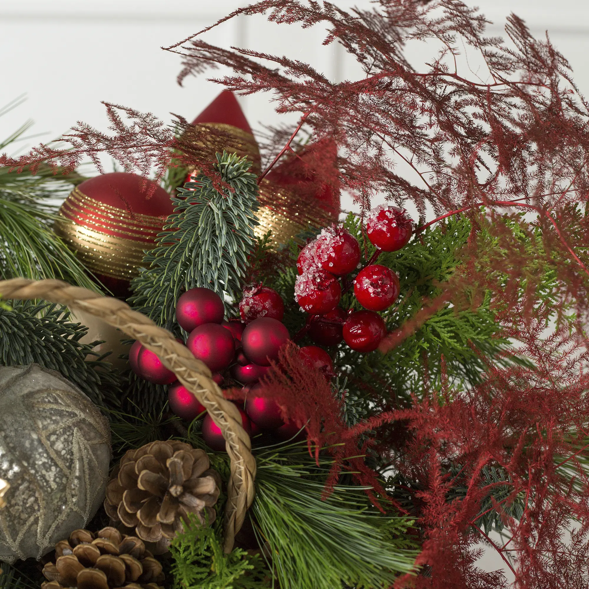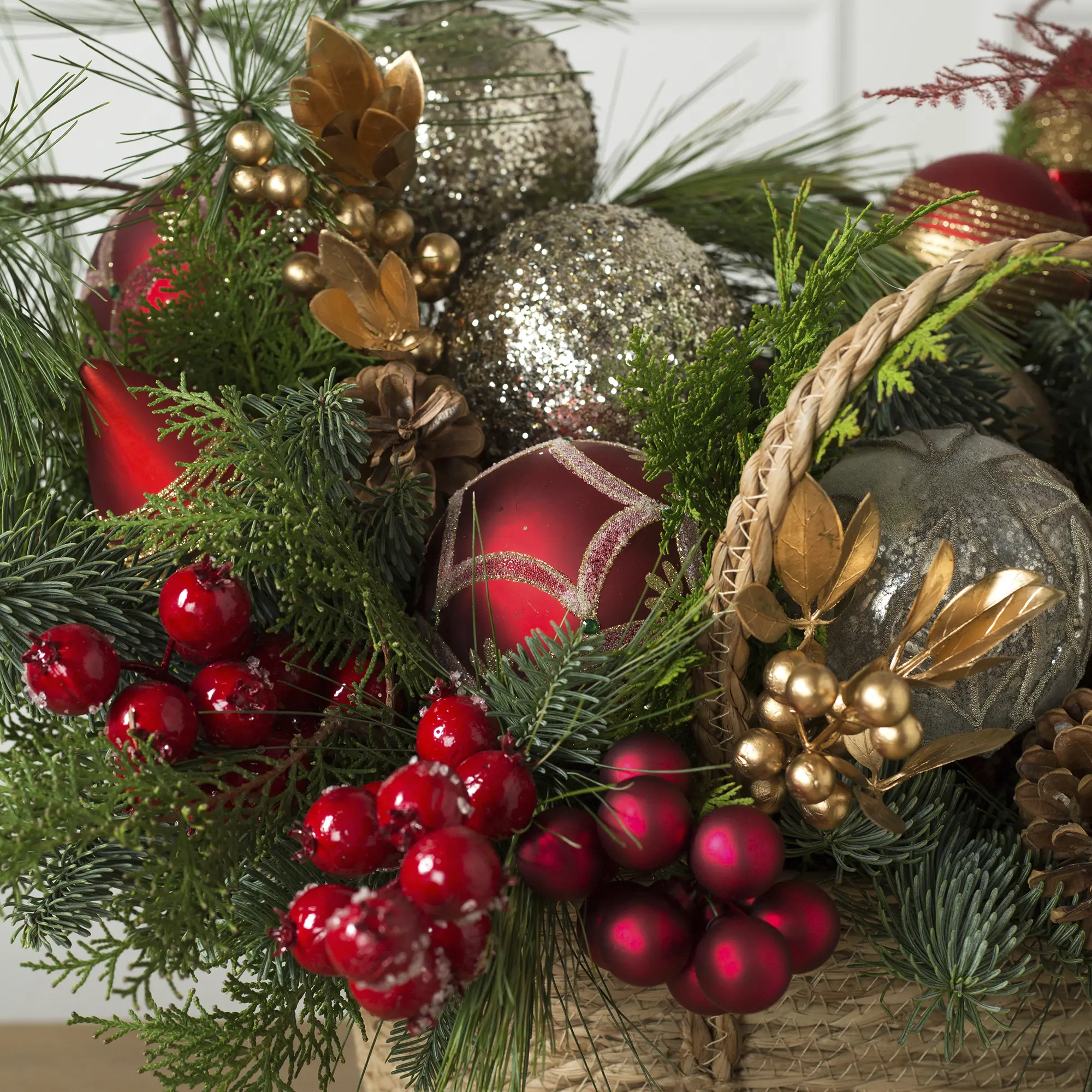 Погрузитесь в атмосферу праздника с нашей новогодней композицией! Еловые ветви, сверкающие шары, сочные красные ягоды и изящная плетёная корзина создают неповторимый праздничный акцент. Добавьте волшебства в свой дом уже сегодня!