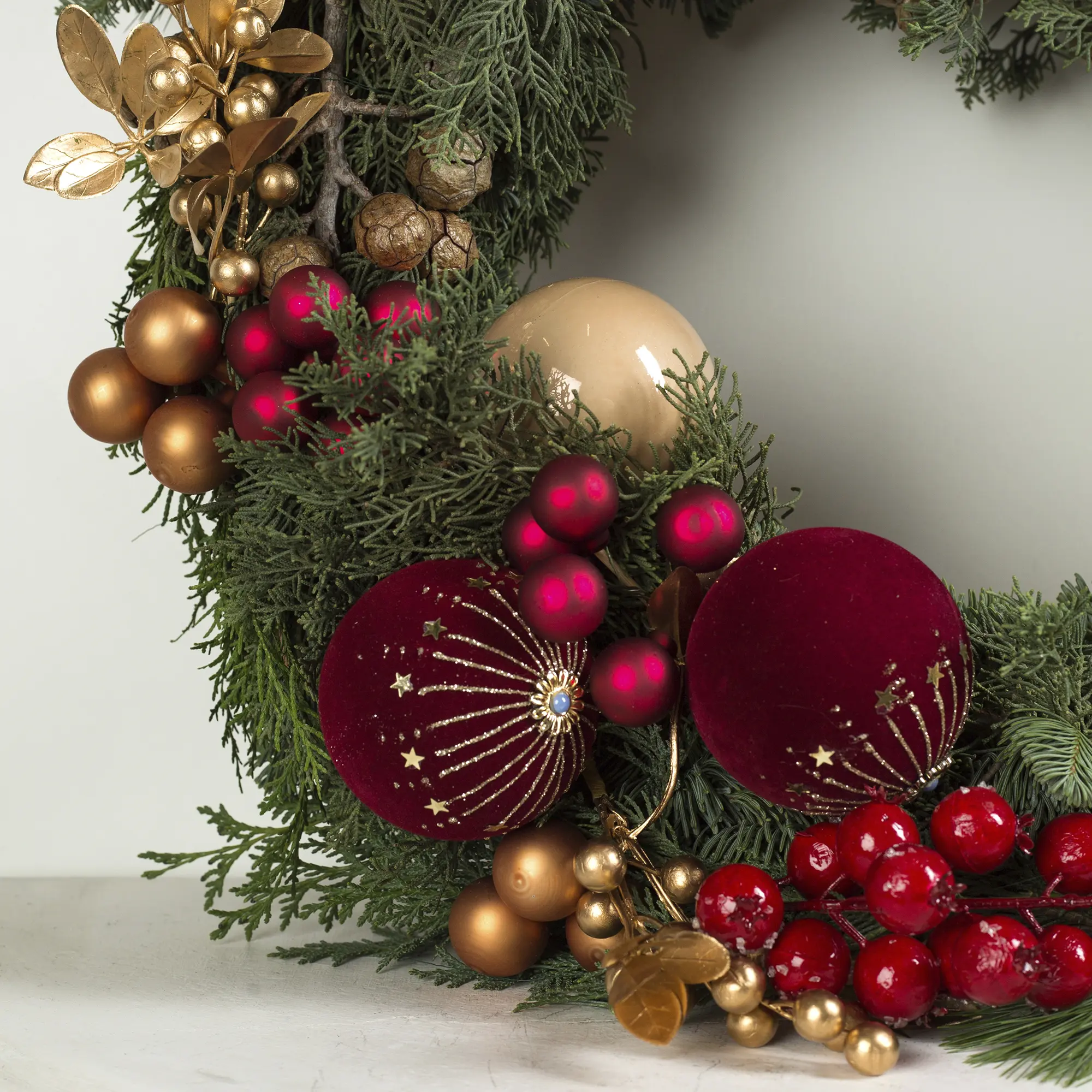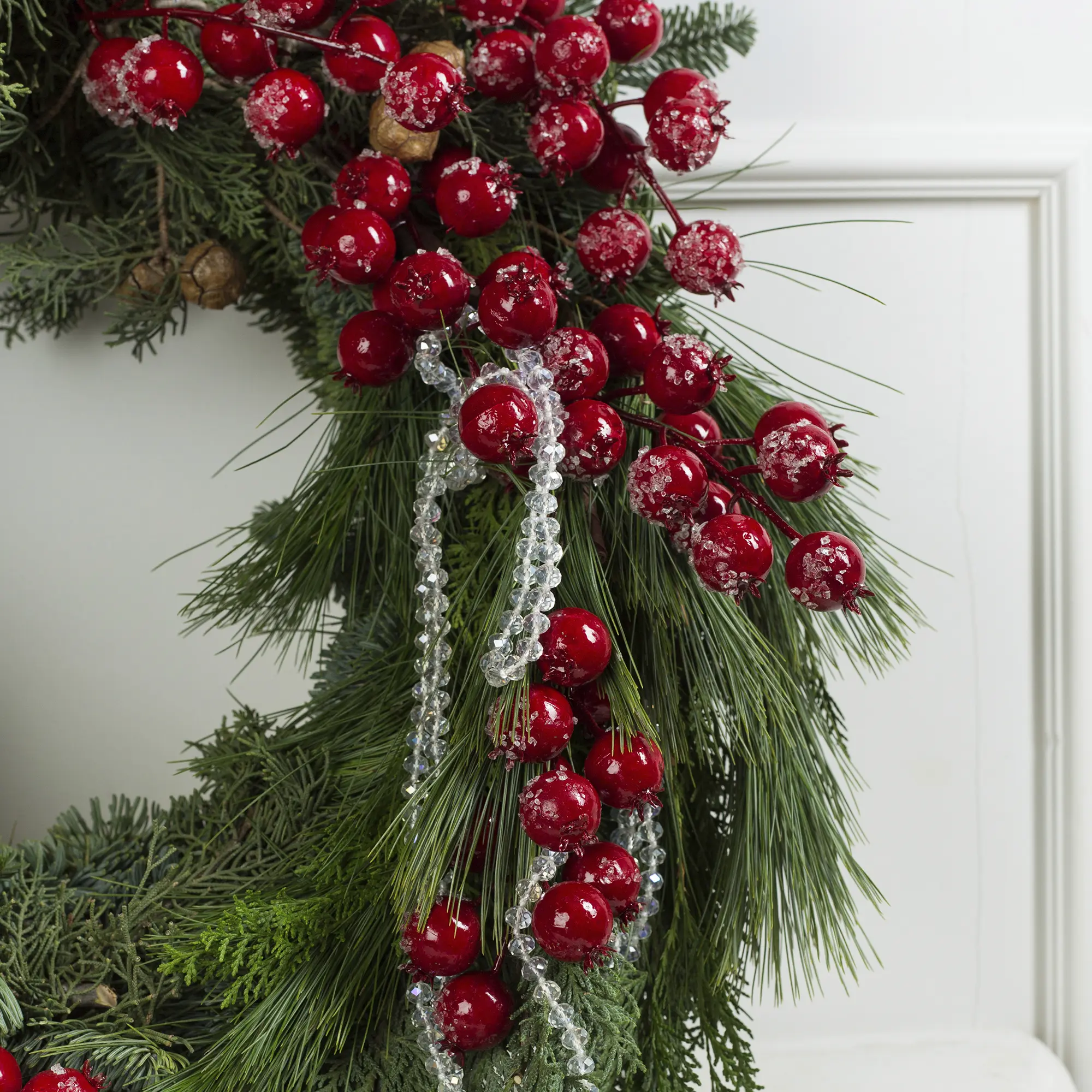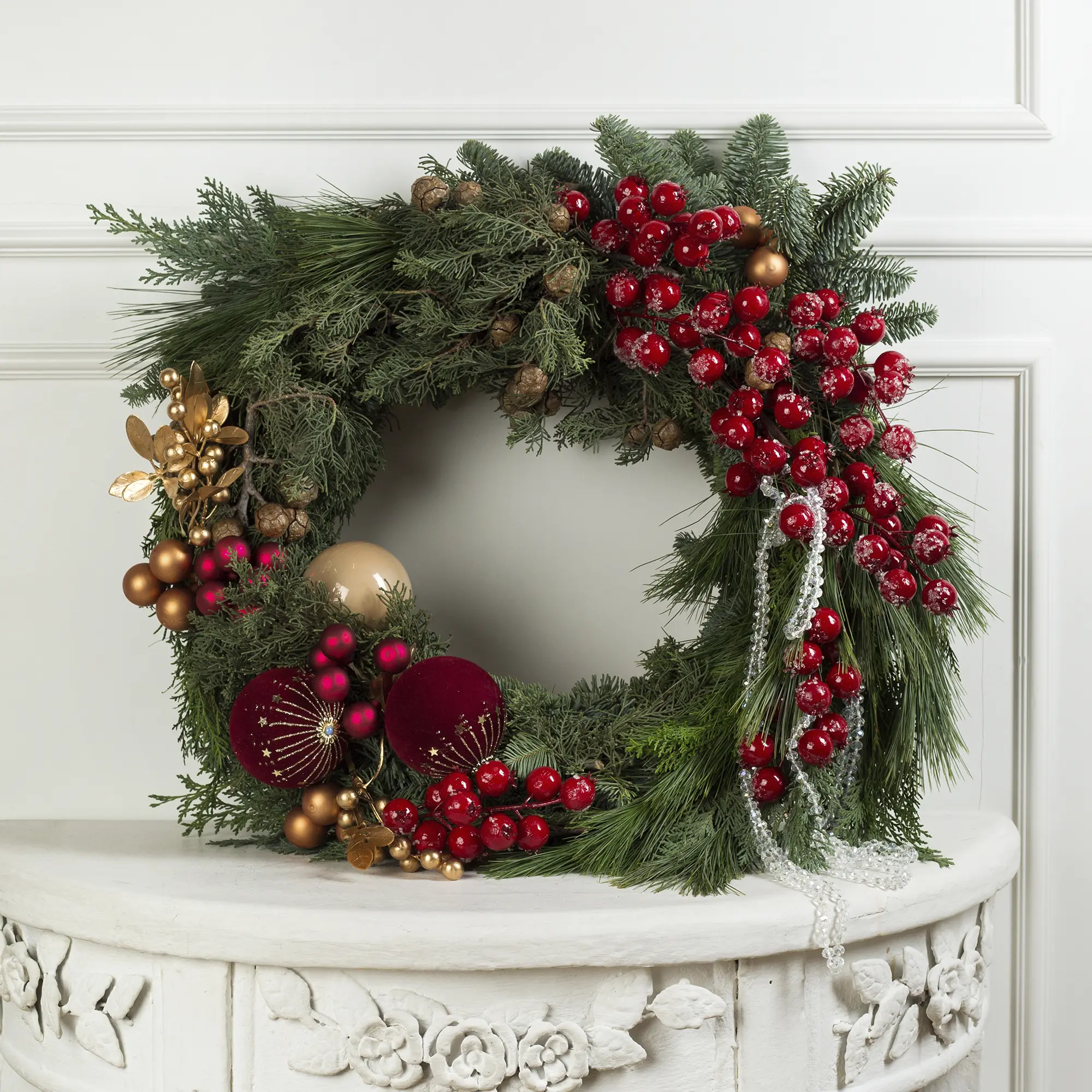 Праздничный венок с шишками, ягодами и бусами — прекрасное украшение для двери или стены. Натуральный аромат хвои и новогодняя атмосфера.