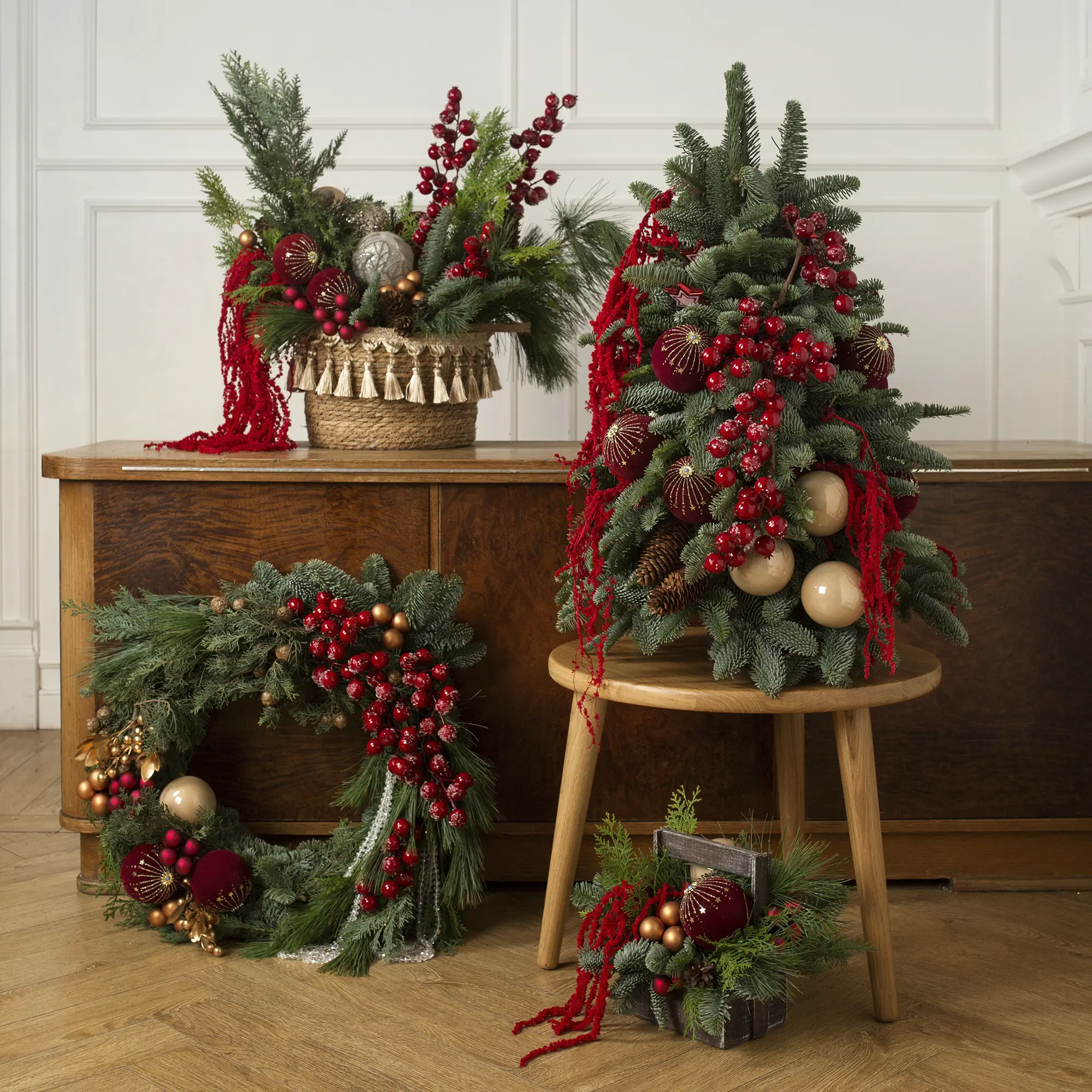 Этот набор — воплощение новогоднего уюта: сочетание природной зелени еловых веток, сочности красных ягод, блеска ёлочных игрушек и текстур плетеных корзины. Универсальный декор, который подойдёт как для классического, так и для современного интерьера. Преобразите пространство к праздникам без лишних хлопот!