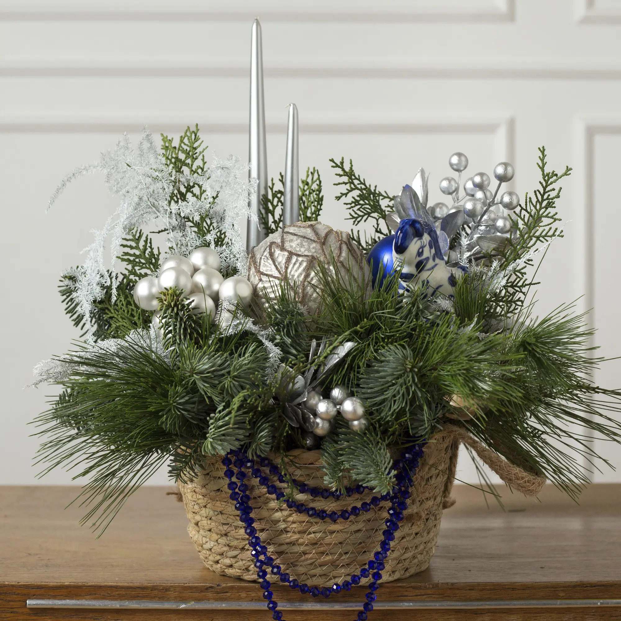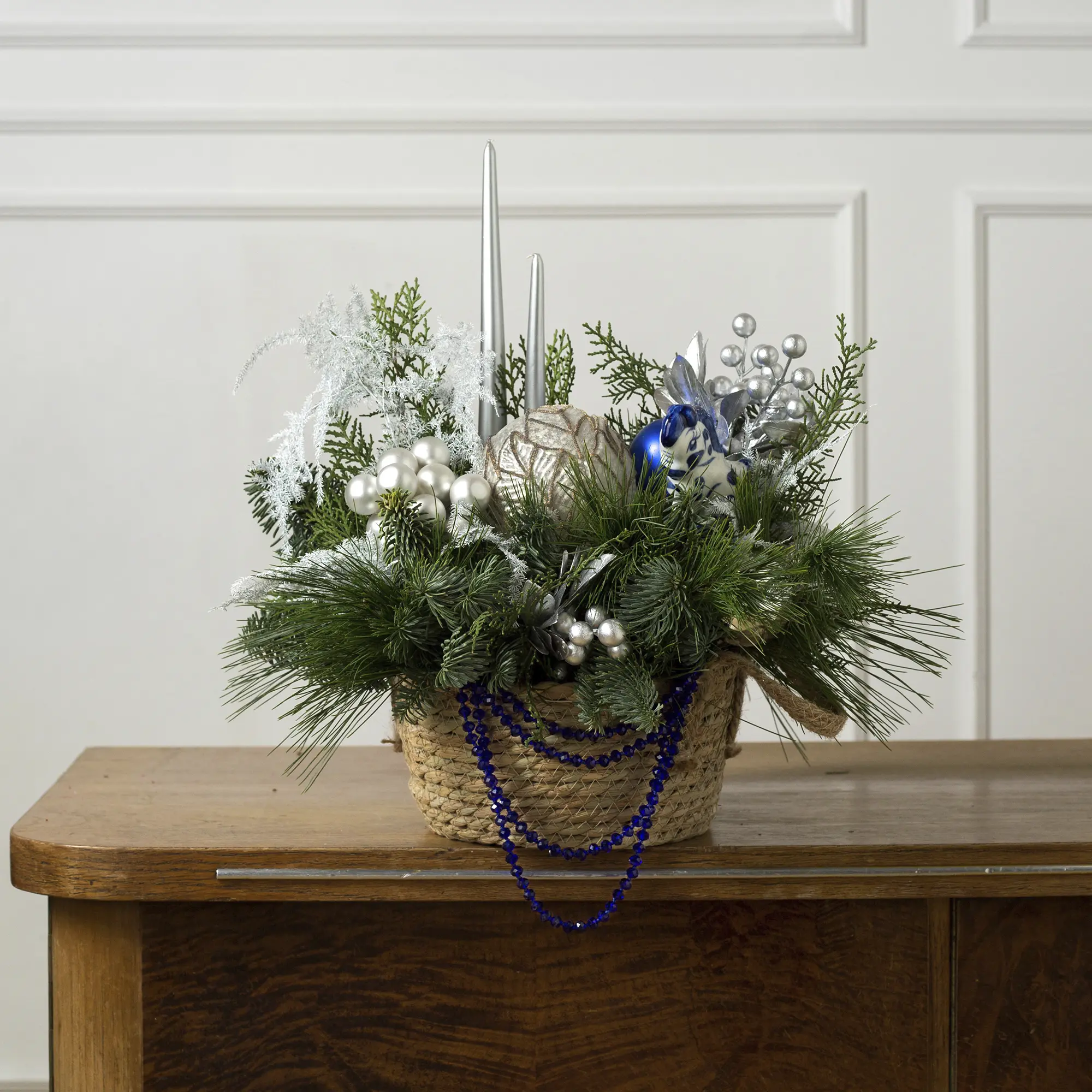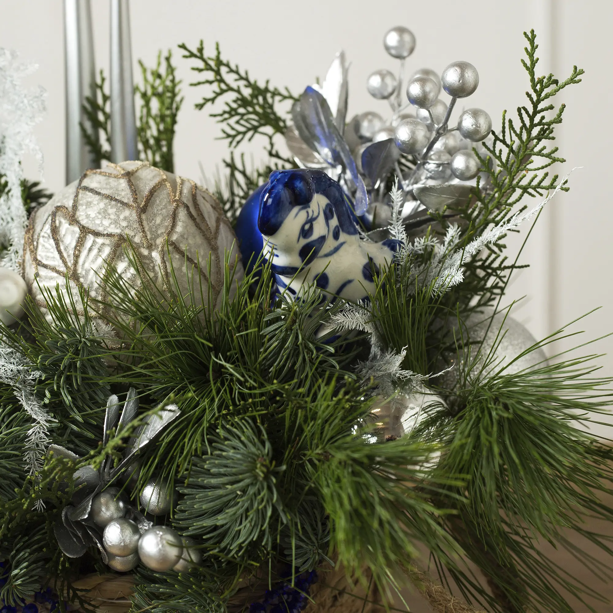 Роскошная новогодняя композиция для украшения интерьера: пышные еловые ветви, блестящие серебристые шары, изысканные свечи, декоративные элементы в синих тонах и изящная нить бус. Идеальный акцент для праздничного стола, каминной полки или зоны приёма гостей. Преобразите пространство к Новому году за считанные минуты!