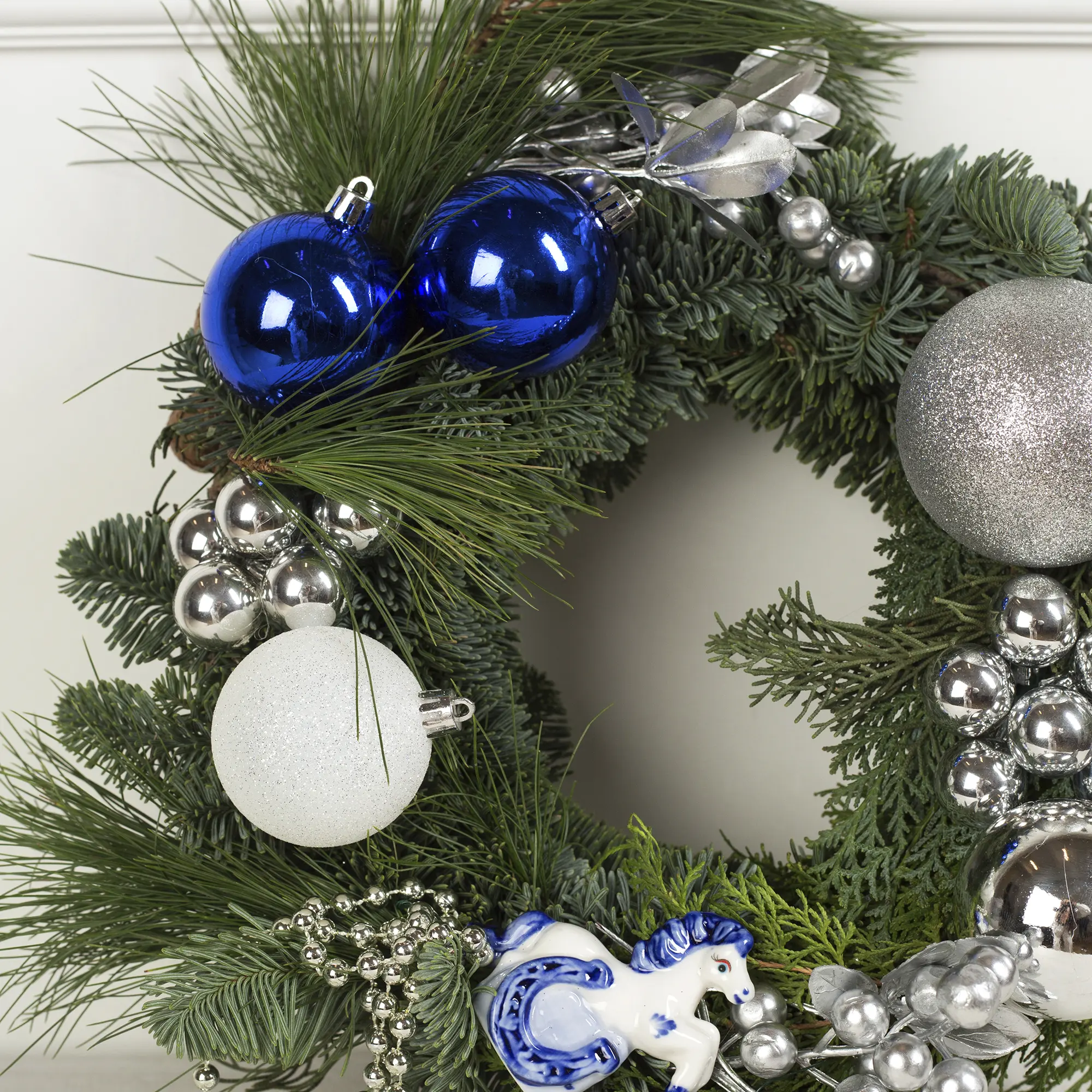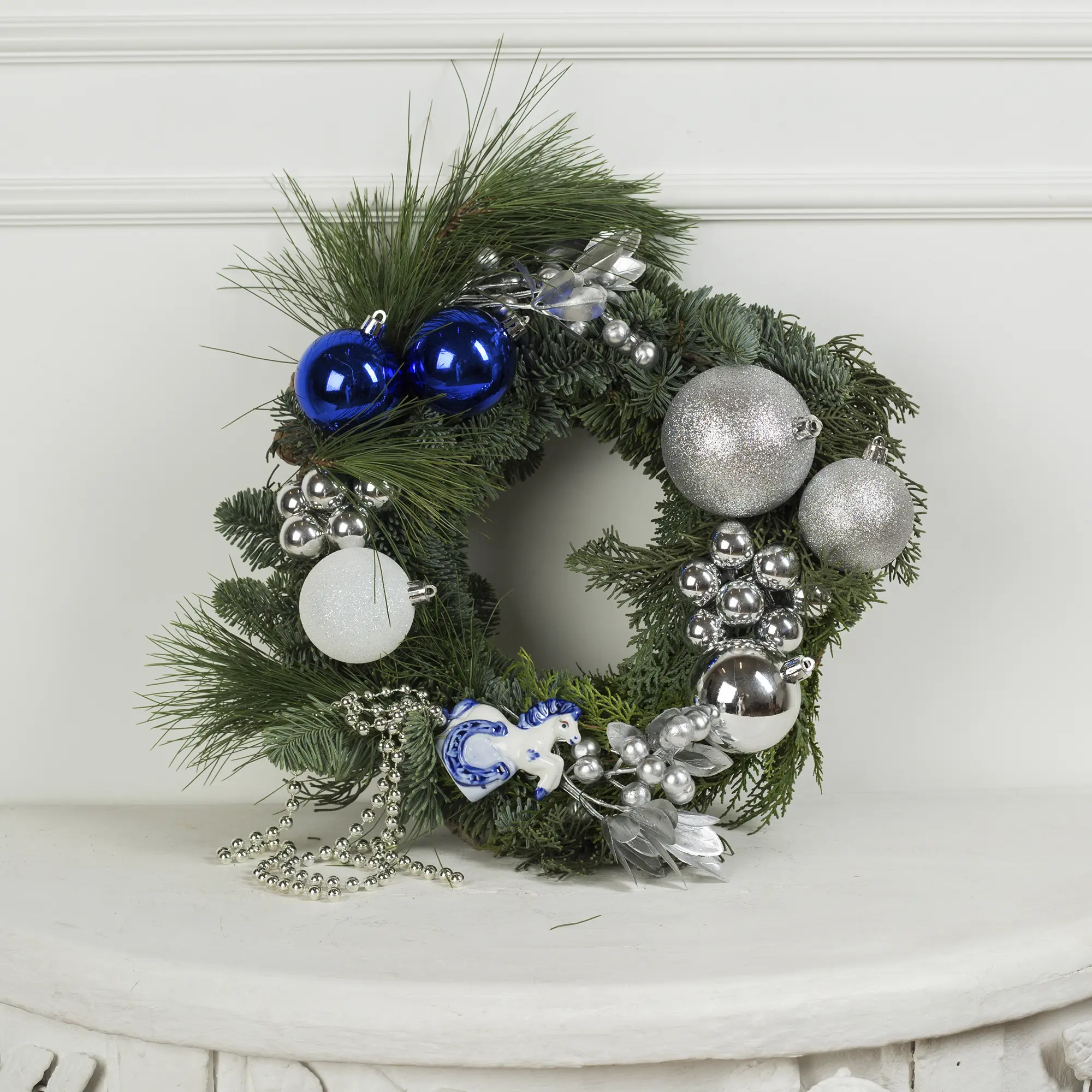 Новогодний венок: хвоя, серебристые и синие шары, белые акценты. Элегантный декор для дома, офиса, праздничного мероприятия. Украшение для интерьера, новогодний декор.