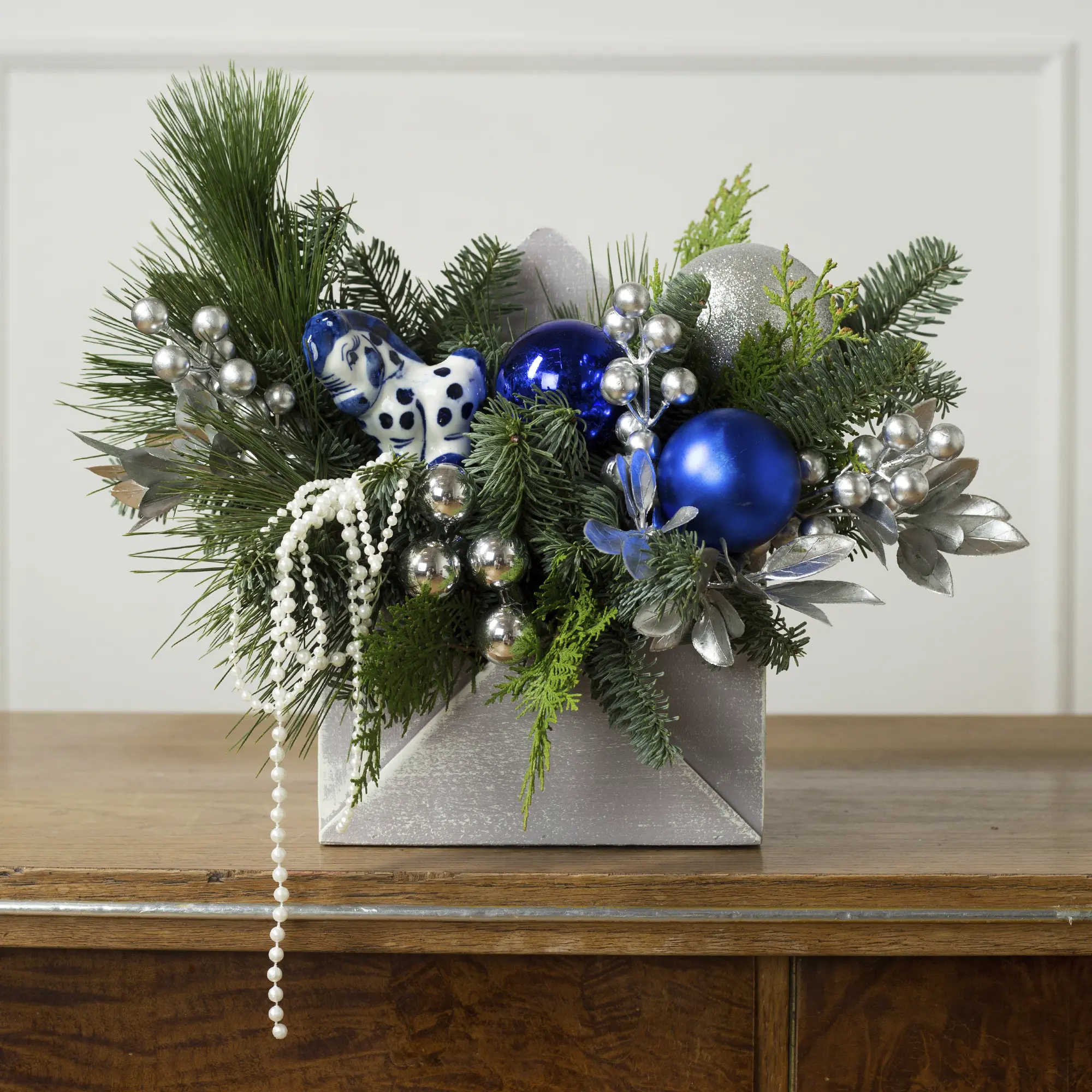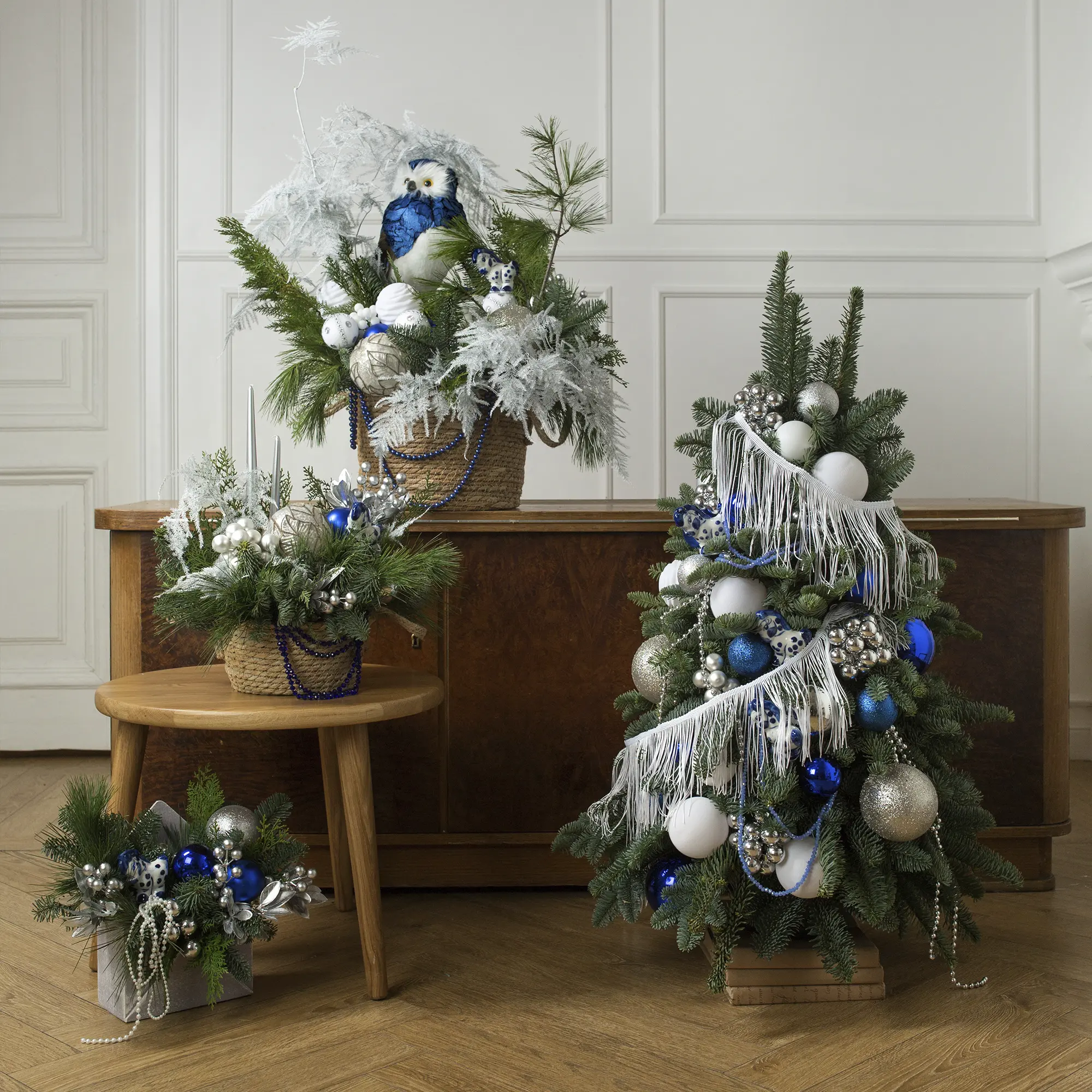 Этот набор воплощение духа зимы и ее праздников: сочетание природной зелени еловых ветвей, блеска серебристых шаров, прохлады синих акцентов и утончённости высоких свечей. Плетёная корзина добавляет уюта и завершённости образу. Универсальный декор, который подойдёт как для классического, так и для современного интерьера.