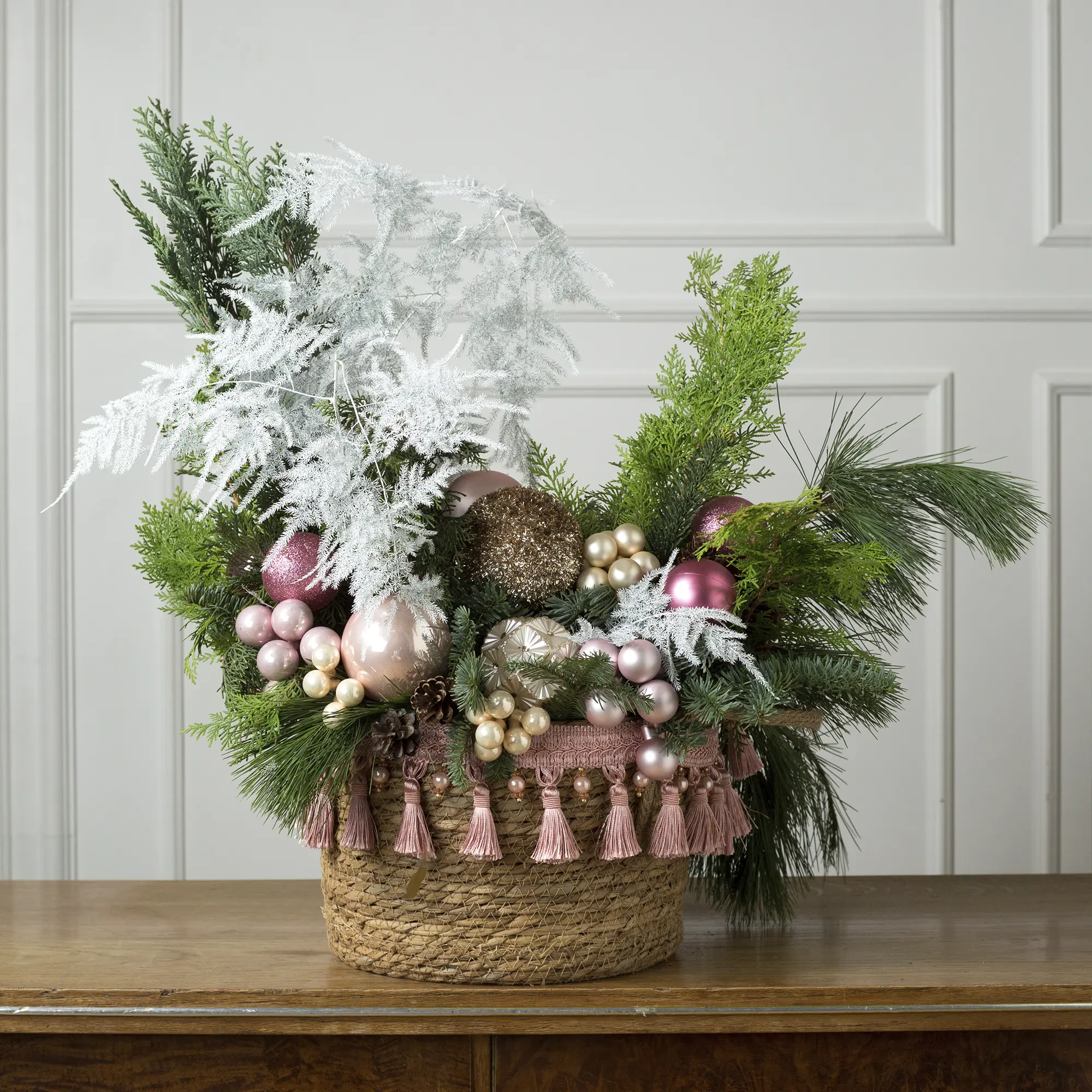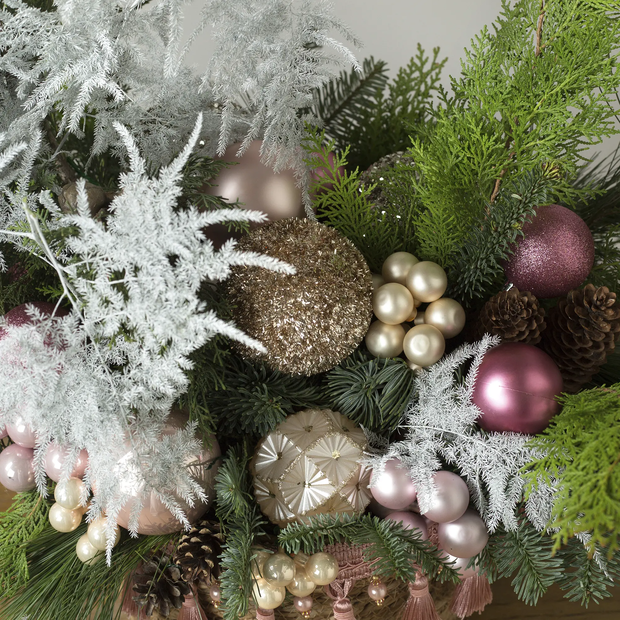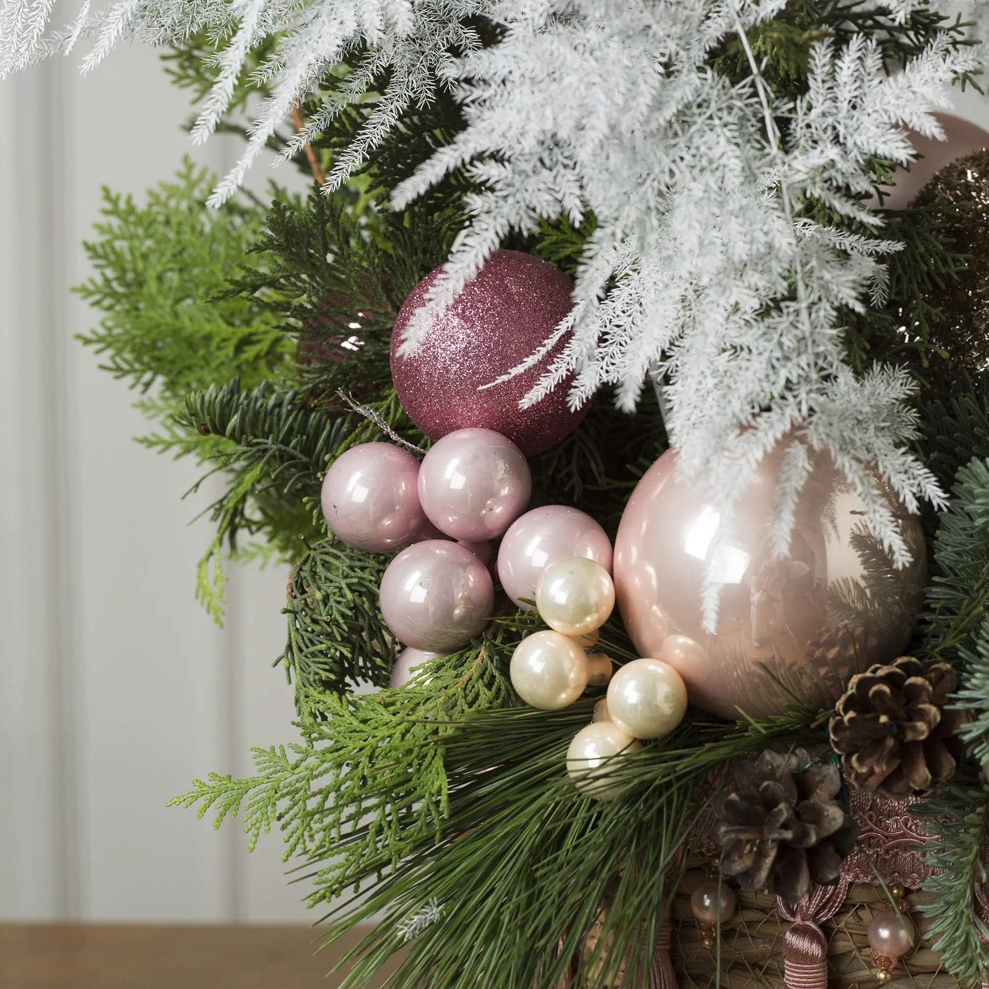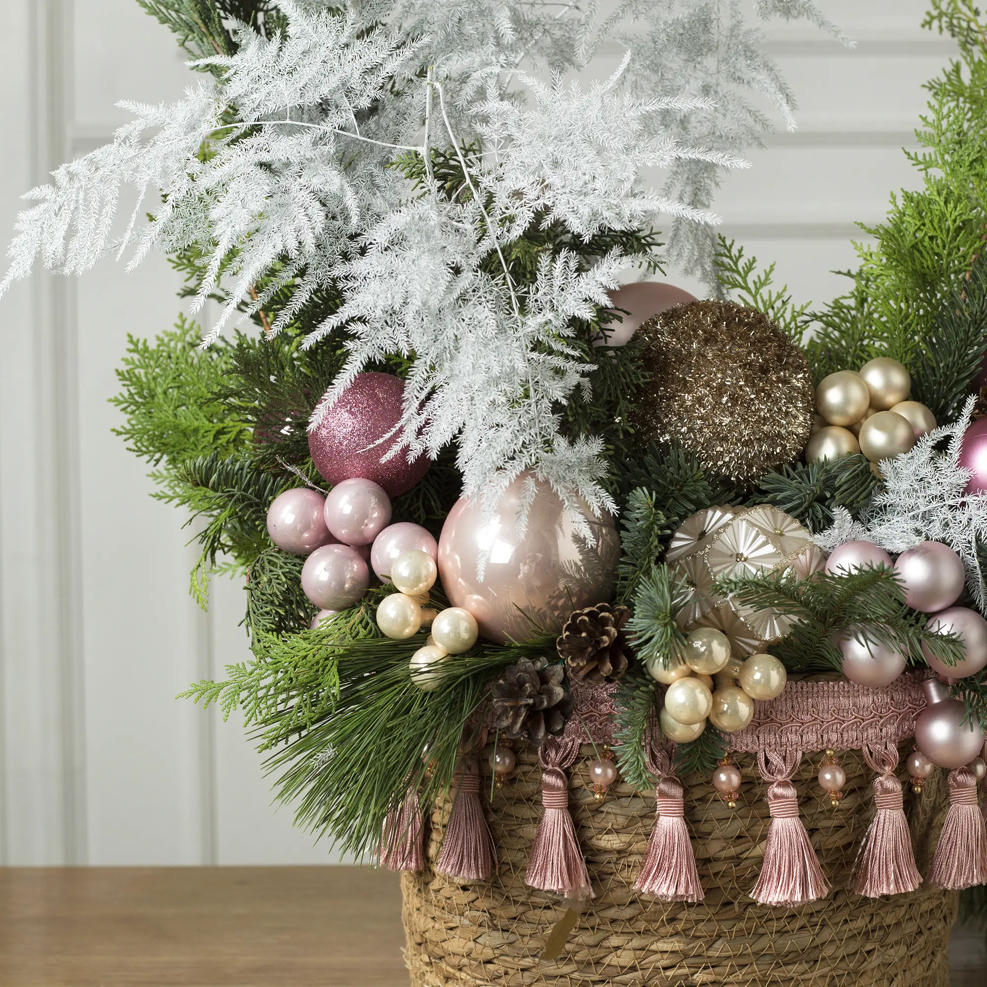Атмосфера зимней сказки! Благородная зелень хвои в сочетании с сияющими розовыми и золотыми шарами, нежными лентами и «ягодными» композициями создаёт неповторимый праздничный образ. Добавьте нотку элегантности в свой дом!