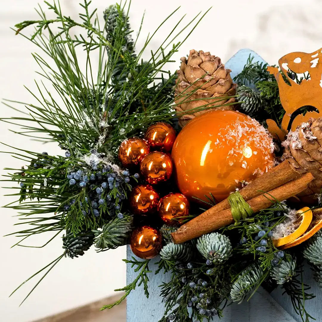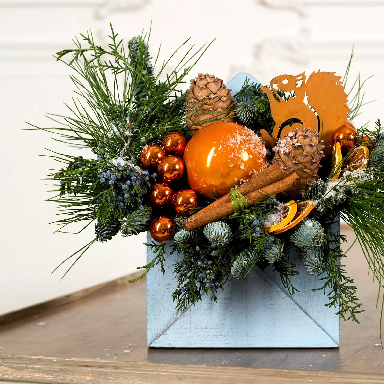 Эта изысканная новогодняя композиция воплощает в себе атмосферу уюта и праздничного волшебства. Центральным элементом служит стильное кашпо в форме конверта, окрашенное в нежный голубой цвет, которое служит идеальной «рамкой» для праздничного ансамбля.
