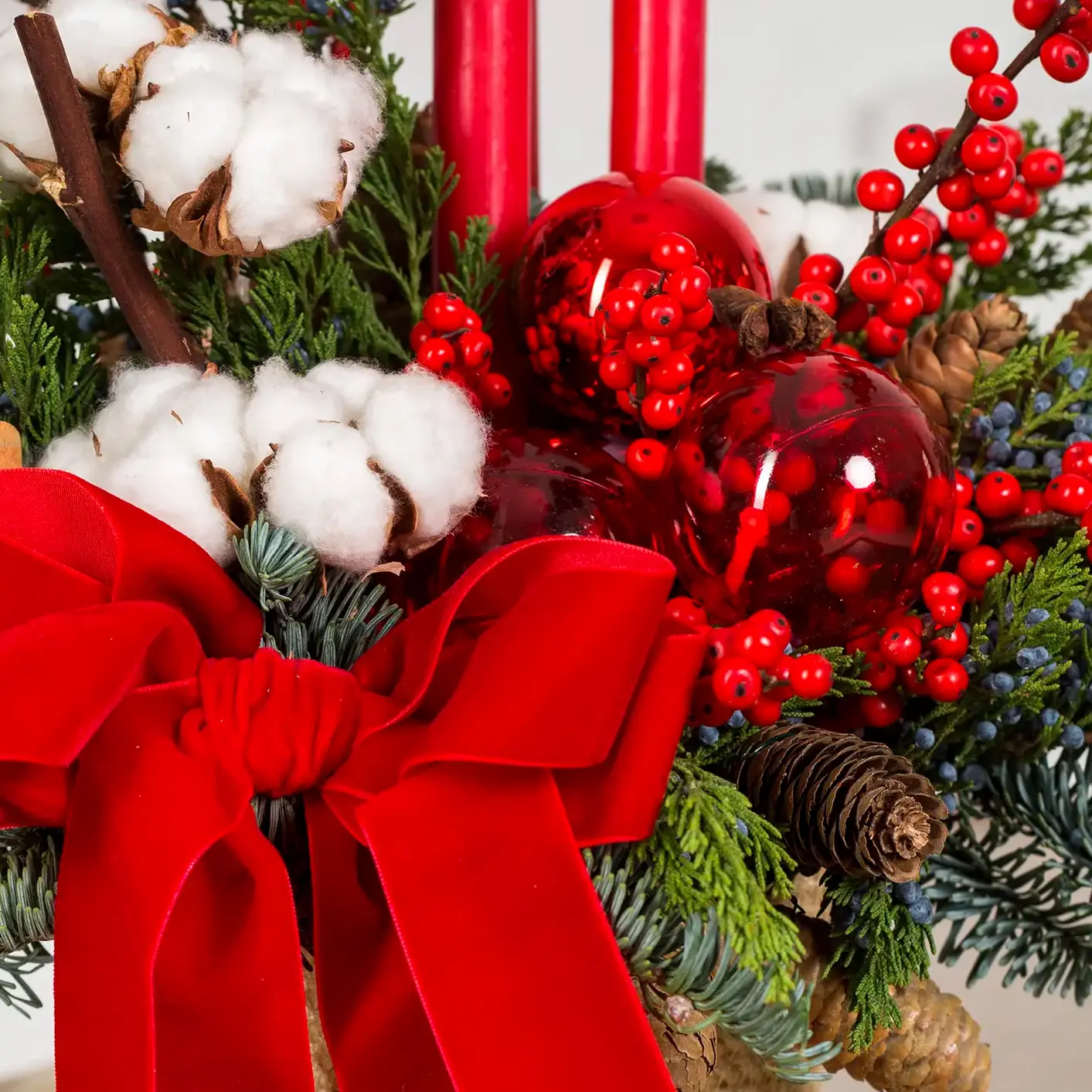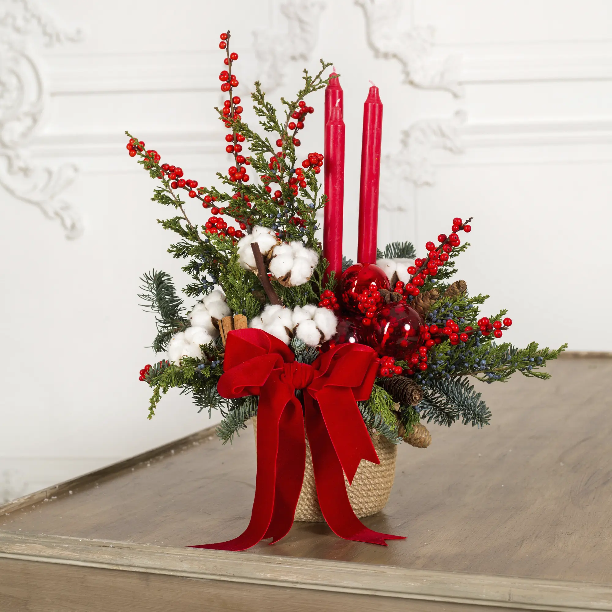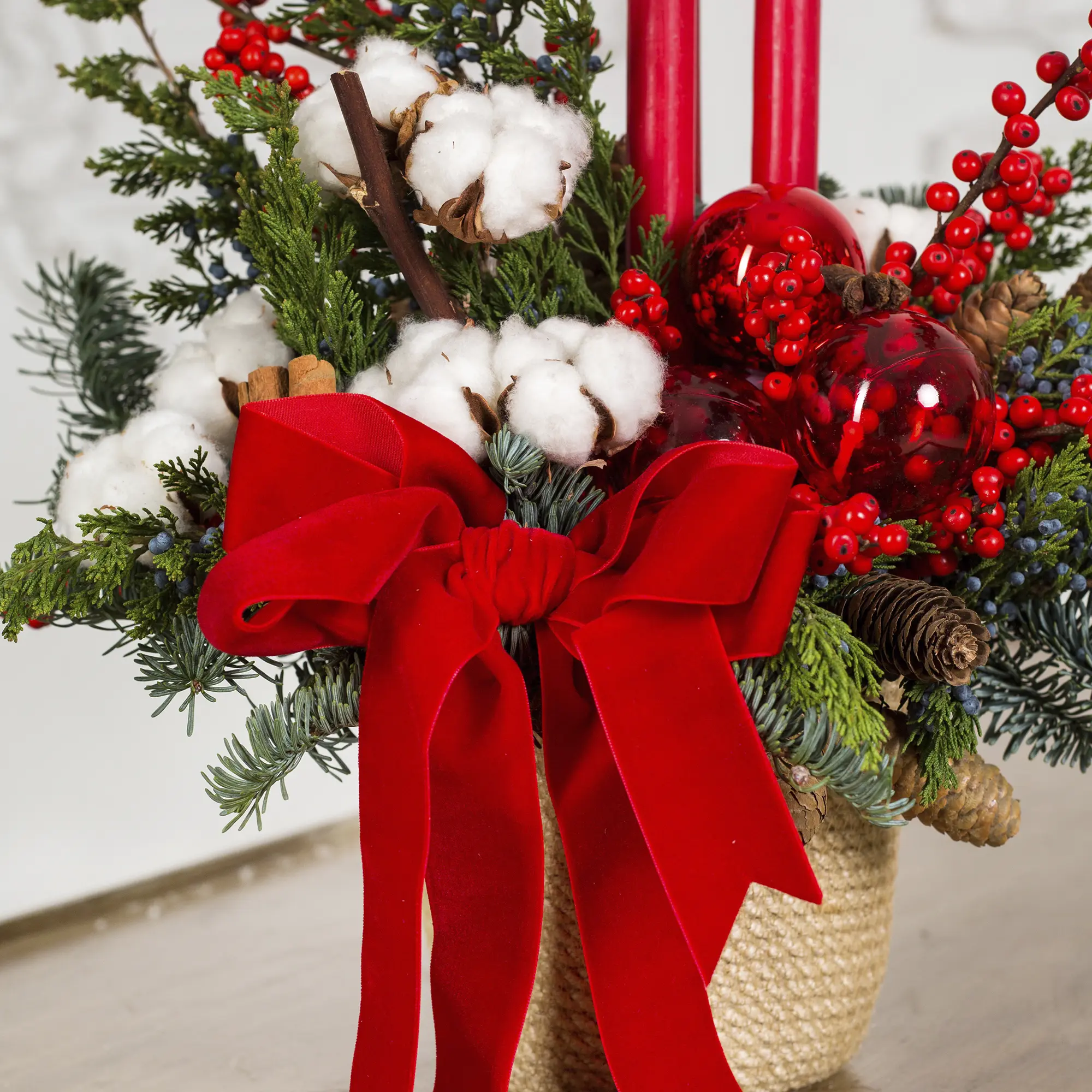 Укутайте свой дом атмосферой волшебства с нашей изысканной новогодней композицией! В центре внимания — миниатюрный блестящий мишка и благородная хвоя нобилиса, украшенная с особым шармом и вкусом.