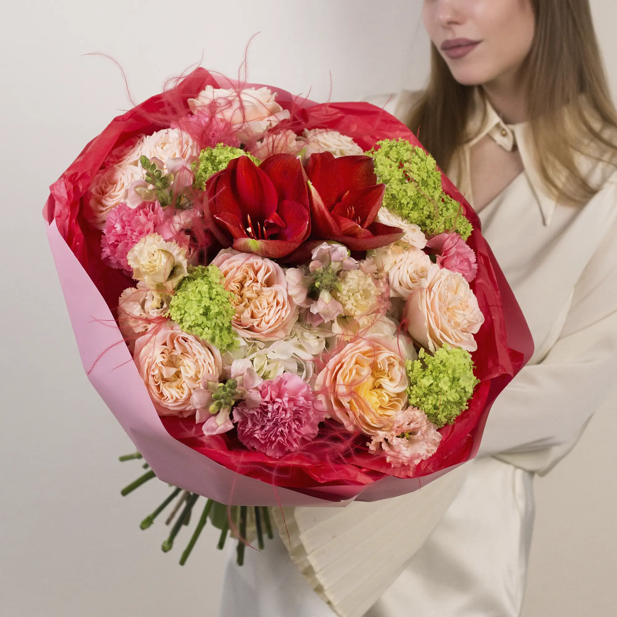 Этот букет — настоящий гимн гармонии и контрастов. В его основе — изысканные кустовые пионовидные розы нежных пастельных оттенков: от кремового до персикового. Они создают мягкую, романтичную базу, словно облако нежности. Я специально подбирал розы с пышными, слегка волнистыми лепестками — они придают композиции объём и глубину. Ярким акцентом стали крупные амариллисы насыщенного красного цвета. Они словно сердце букета — притягивают взгляд, добавляют драматизма и энергии. Контраст между нежными розами и выразительными амариллисами получился очень эффектным — это моя любимая «игра» с оттенками! Особую свежесть и лёгкость композиции придают зелёные соцветия гортензии. Они не только разбавляют цветочную палитру, но и добавляют интересную текстуру. А нежные гвоздики розовых оттенков вносят лёгкую игривость и делают букет более многослойным. Финальный штрих — упаковка в яркую красную плёнку. Она защищает цветы, и подчёркивает страсть и эмоциональность композиции. Лёгкая сетка добавляет воздушности и завершённости образу. Работая над этим букетом, я хотел передать ощущение праздника, любви и вдохновения. Надеюсь, он принесёт радость своему получателю и подарит массу положительных эмоций