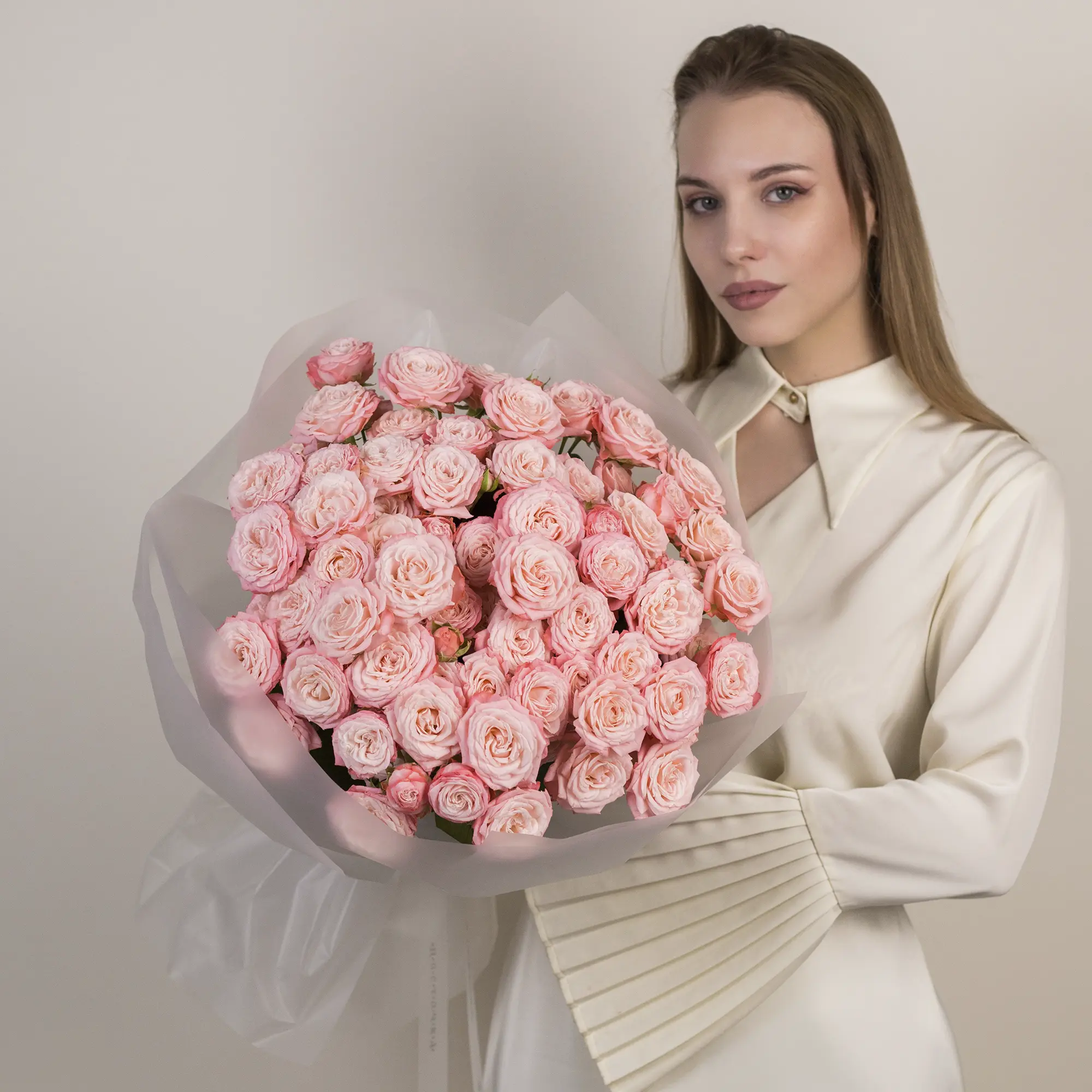 С огромной гордостью представляю этот букет — результат кропотливой работы и моей безграничной любви к цветам! Этот шедевр собран из 15 кустовой пионовидной розы сорта «Бомбастик» в нежном розовом оттенке. Я долго подбирала композицию, чтобы добиться идеальной гармонии: розы расположены максимально плотно, создавая эффект воздушного облака, которое одновременно поражает объёмом и изяществом. Мне хотелось создать нечто особенное — символ искренних чувств, который не оставит равнодушным. Уверена, этот букет станет незабываемым подарком для любого случая: будь то признание в любви, поздравление с юбилеем или просто желание подарить радость. Он говорит на языке цветов больше, чем тысяча слов!