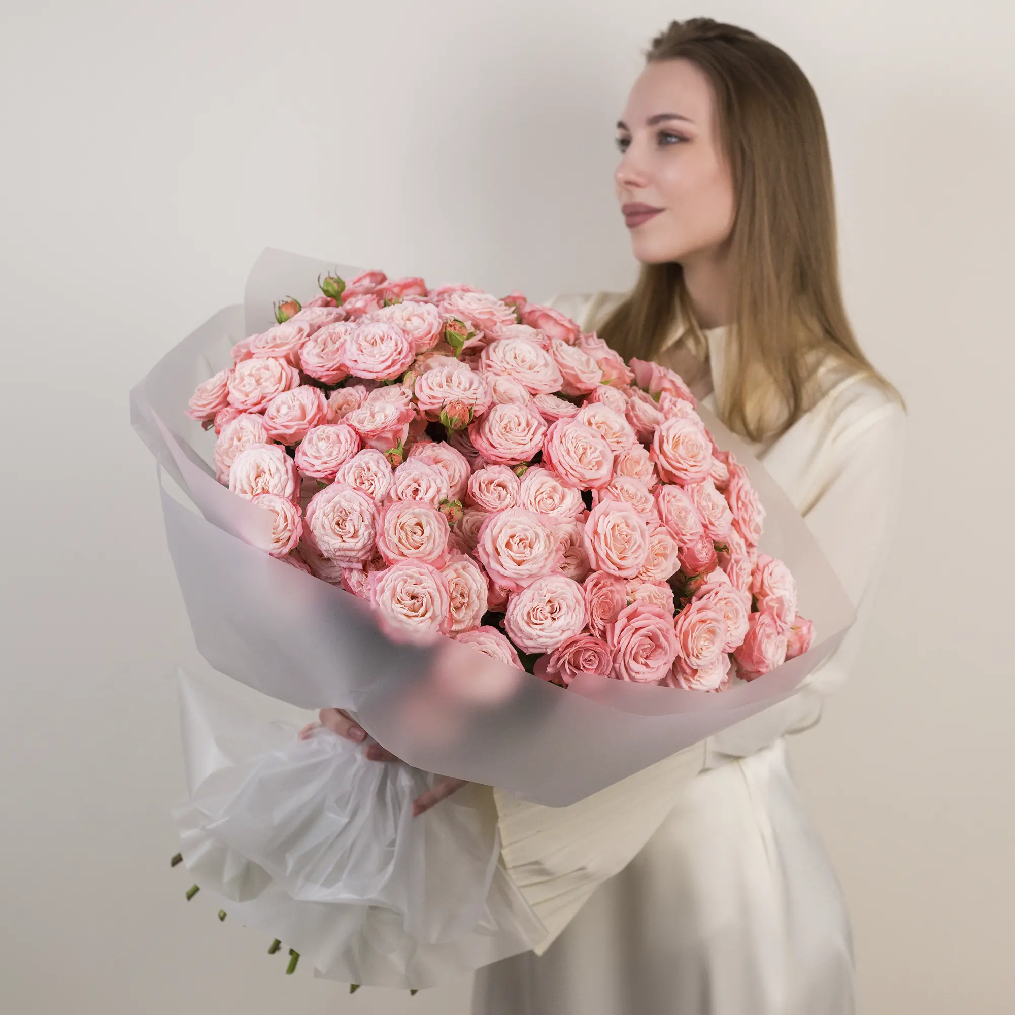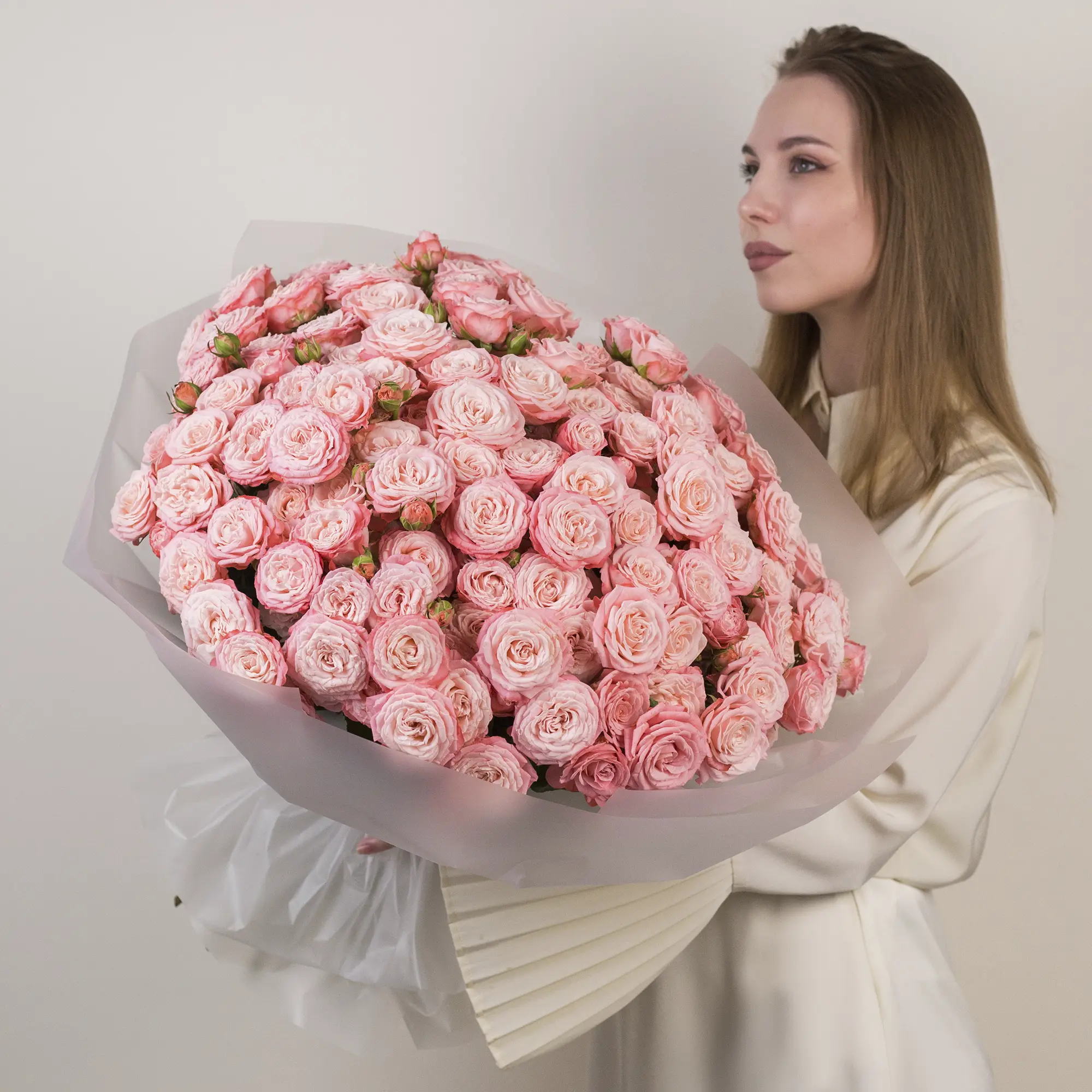 С огромной гордостью представляю этот букет — результат кропотливой работы и моей безграничной любви к цветам! Этот шедевр собран из 35 кустовой пионовидной розы сорта «Бомбастик» в нежном розовом оттенке. Я долго подбирала композицию, чтобы добиться идеальной гармонии: розы расположены максимально плотно, создавая эффект воздушного облака, которое одновременно поражает объёмом и изяществом. Мне хотелось создать нечто особенное — символ искренних чувств, который не оставит равнодушным. Уверена, этот букет станет незабываемым подарком для любого случая: будь то признание в любви, поздравление с юбилеем или просто желание подарить радость. Он говорит на языке цветов больше, чем тысяча слов!