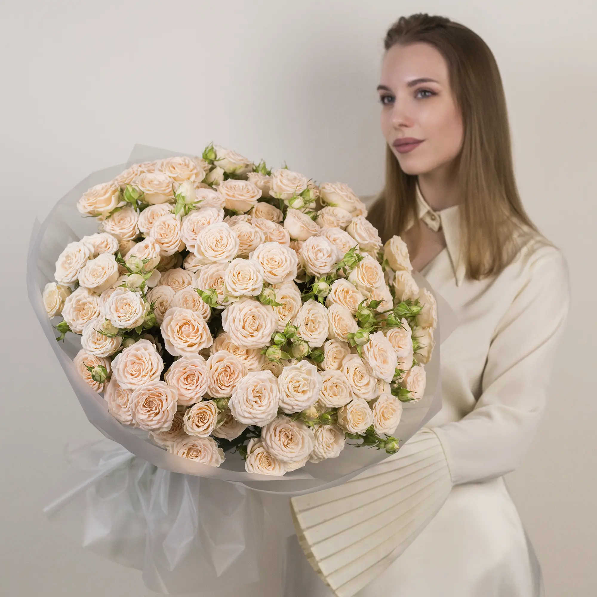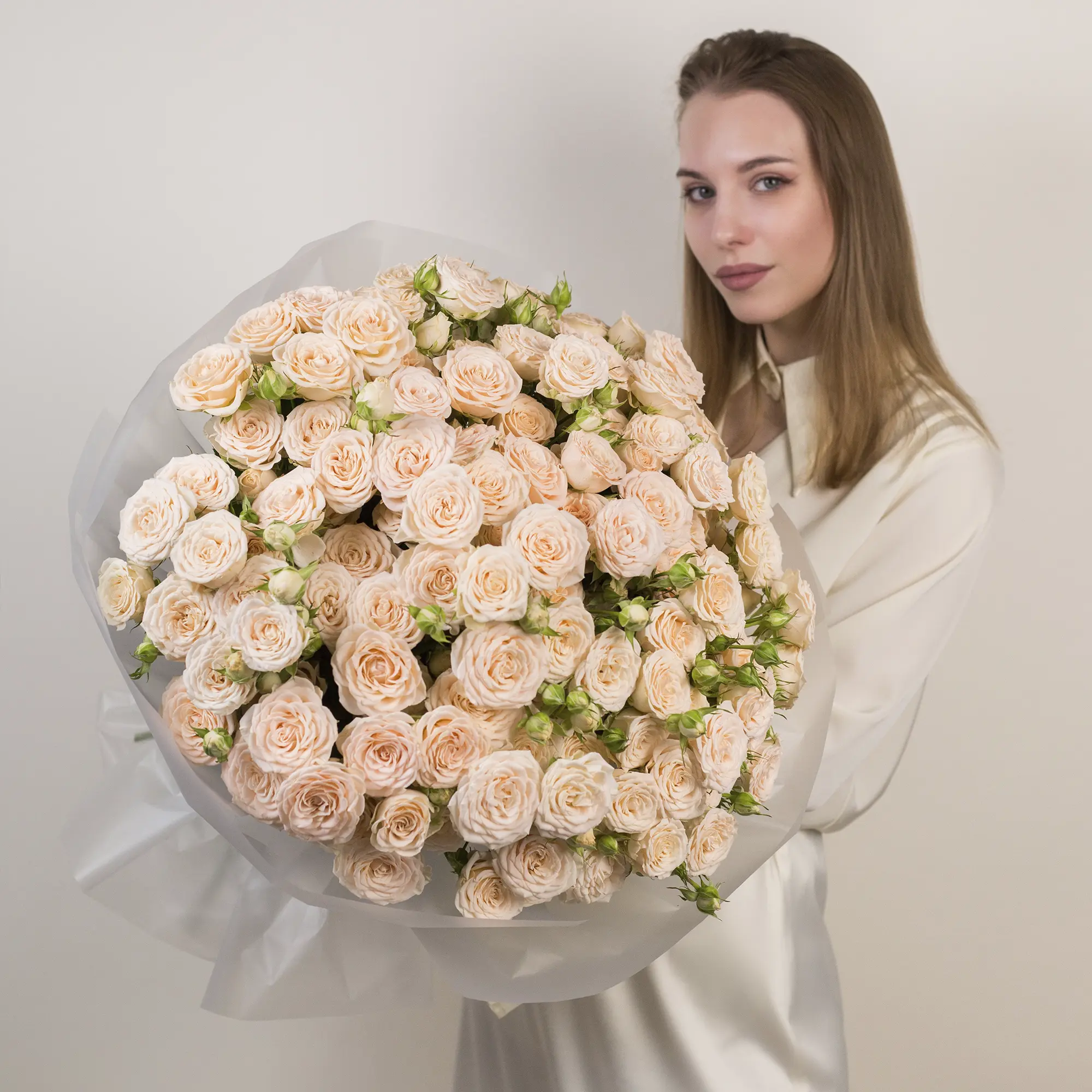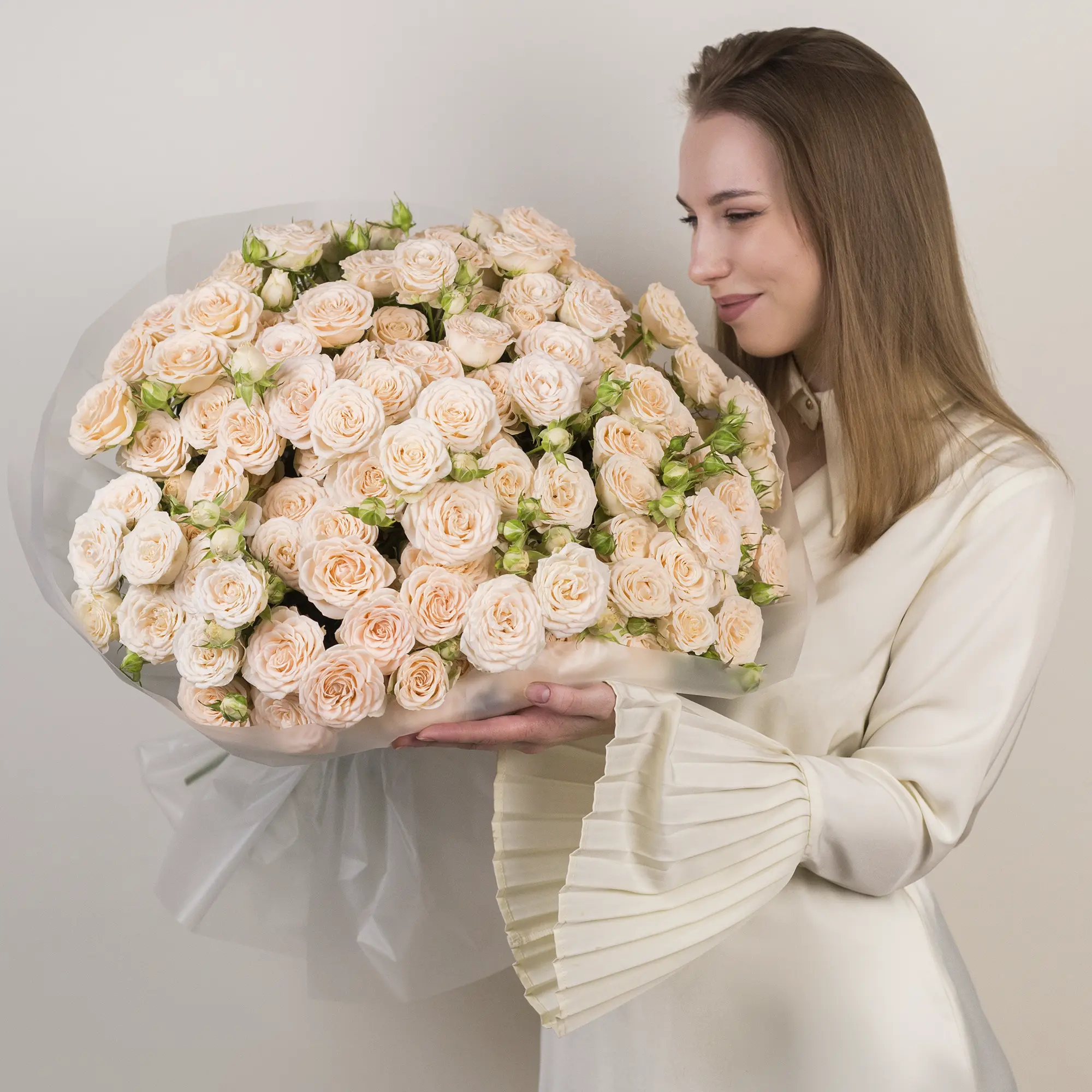 Представляю вам этот букет — он словно воплощение нежности и утончённости! Я вложила в него всю свою душу, подбирая каждую розу вручную. Этот букет — настоящая симфония кремовых оттенков. Кустовые розы, собранные в пышную композицию, поражают своей изысканностью. Мне особенно нравится, как плавно перетекают оттенки: от почти белого до тёплого персикового. Это создаёт эффект акварельной картины — так нежно и воздушно! Меня восхищает в этом букете плотность композиции — розы собраны очень плотно, создавая ощущение объёма и роскоши. Такой букет выглядит по-королевски! Каждый цветок словно маленький шедевр: лепестки аккуратно закручены, а бутоны выглядят свежими и живыми. Кремовая палитра универсальна: она подойдёт и для романтического признания, и для элегантного поздравления. Полупрозрачная плёнка подчёркивает нежность букета, не отвлекая внимание от цветов. Она добавляет лёгкости и завершённости образу. Работая над этим букетом, я думала о женщинах, которые ценят утончённость и изящество. Мне хотелось создать композицию, которая будет говорить сама за себя — без лишних слов, только через красоту и гармонию. Я уверена этот букет подарит море эмоций! Он идеально подойдёт для особых моментов — будь то день рождения, годовщина или просто желание порадовать близкого человека. Каждая роза здесь — как маленькое пожелание счастья и любви.