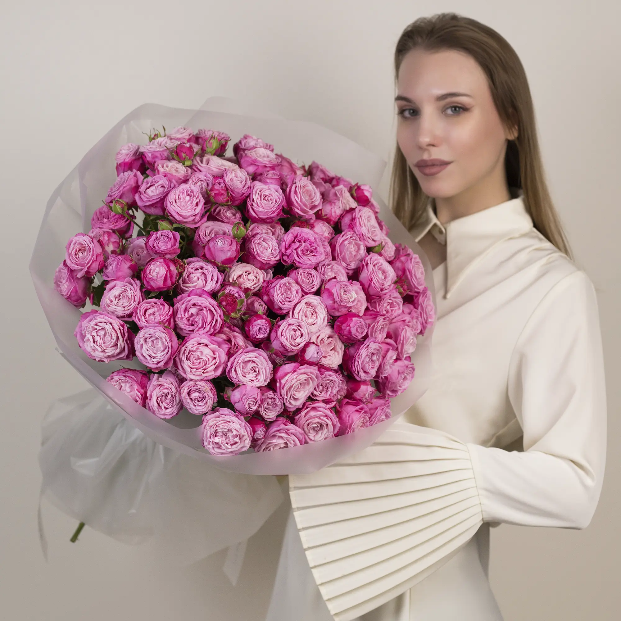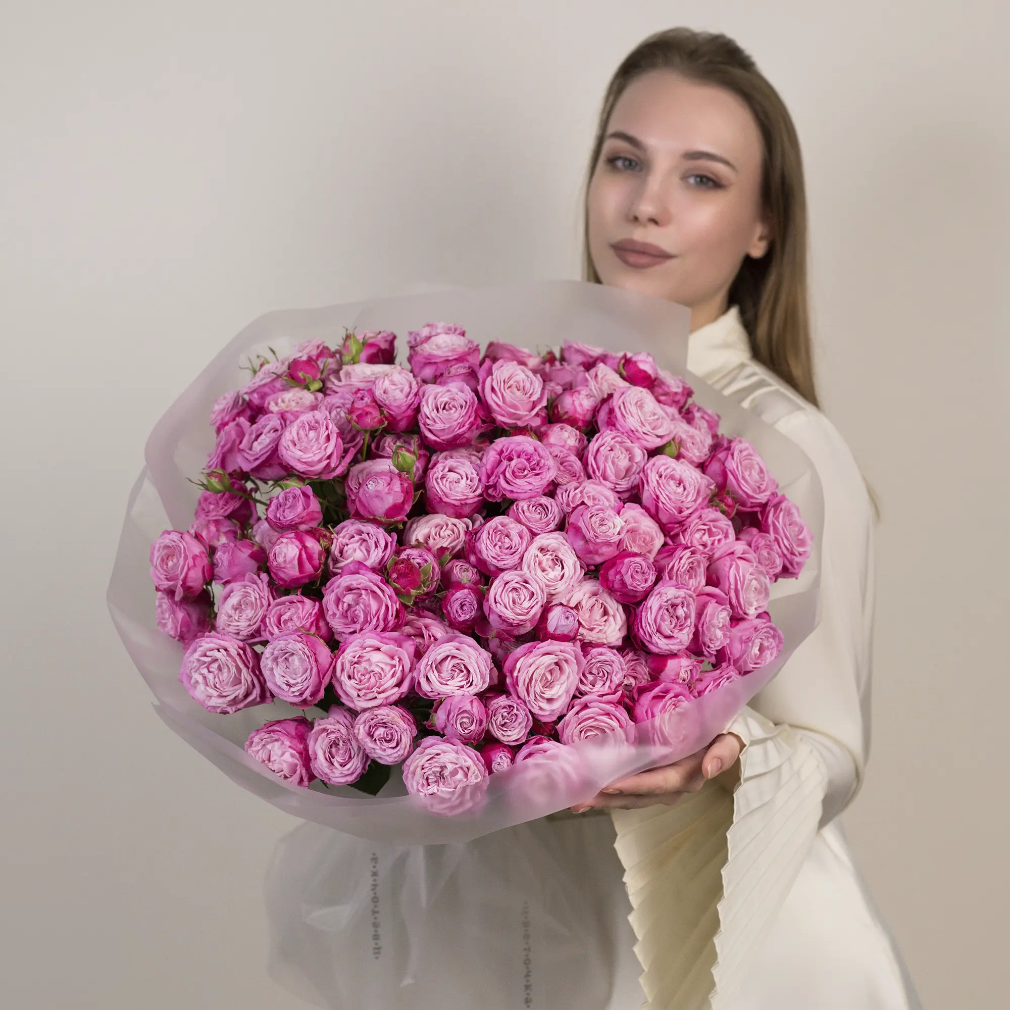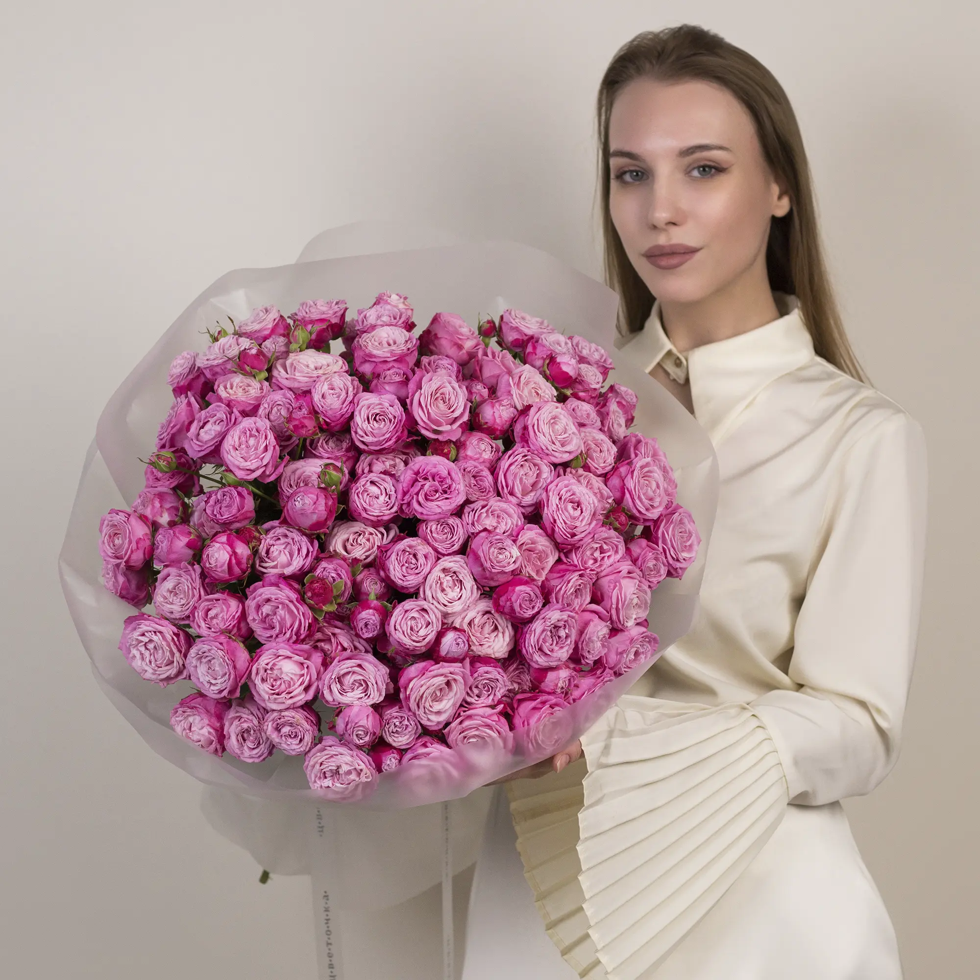 Этот букет — настоящая симфония кремовых оттенков. Кустовые розы, собранные в пышную композицию, поражают своей изысканностью. Мне особенно нравится, как плавно перетекают оттенки: от почти белого до тёплого персикового. Это создаёт эффект акварельной картины — так нежно и воздушно! Меня восхищает в этом букете плотность композиции — розы собраны очень плотно, создавая ощущение объёма и роскоши. Такой букет выглядит по-королевски! Каждый цветок словно маленький шедевр: лепестки аккуратно закручены, а бутоны выглядят свежими и живыми. Кремовая палитра универсальна: она подойдёт и для романтического признания, и для элегантного поздравления. Полупрозрачная плёнка подчёркивает нежность букета, не отвлекая внимание от цветов. Она добавляет лёгкости и завершённости образу. Работая над этим букетом, я думала о женщинах, которые ценят утончённость и изящество. Мне хотелось создать композицию, которая будет говорить сама за себя — без лишних слов, только через красоту и гармонию. Я уверена этот букет подарит море эмоций! Он идеально подойдёт для особых моментов — будь то день рождения, годовщина или просто желание порадовать близкого человека. Каждая роза здесь — как маленькое пожелание счастья и любви.