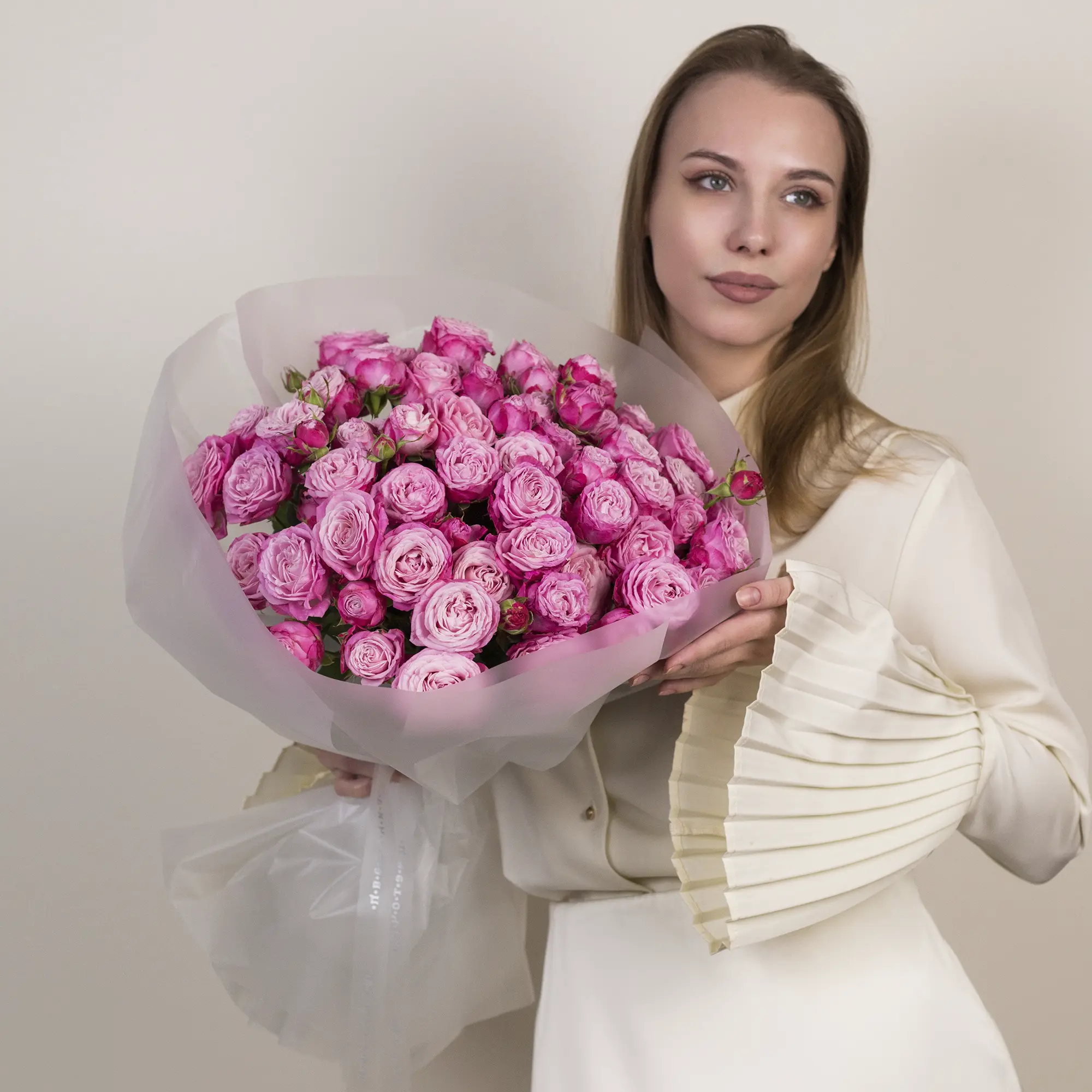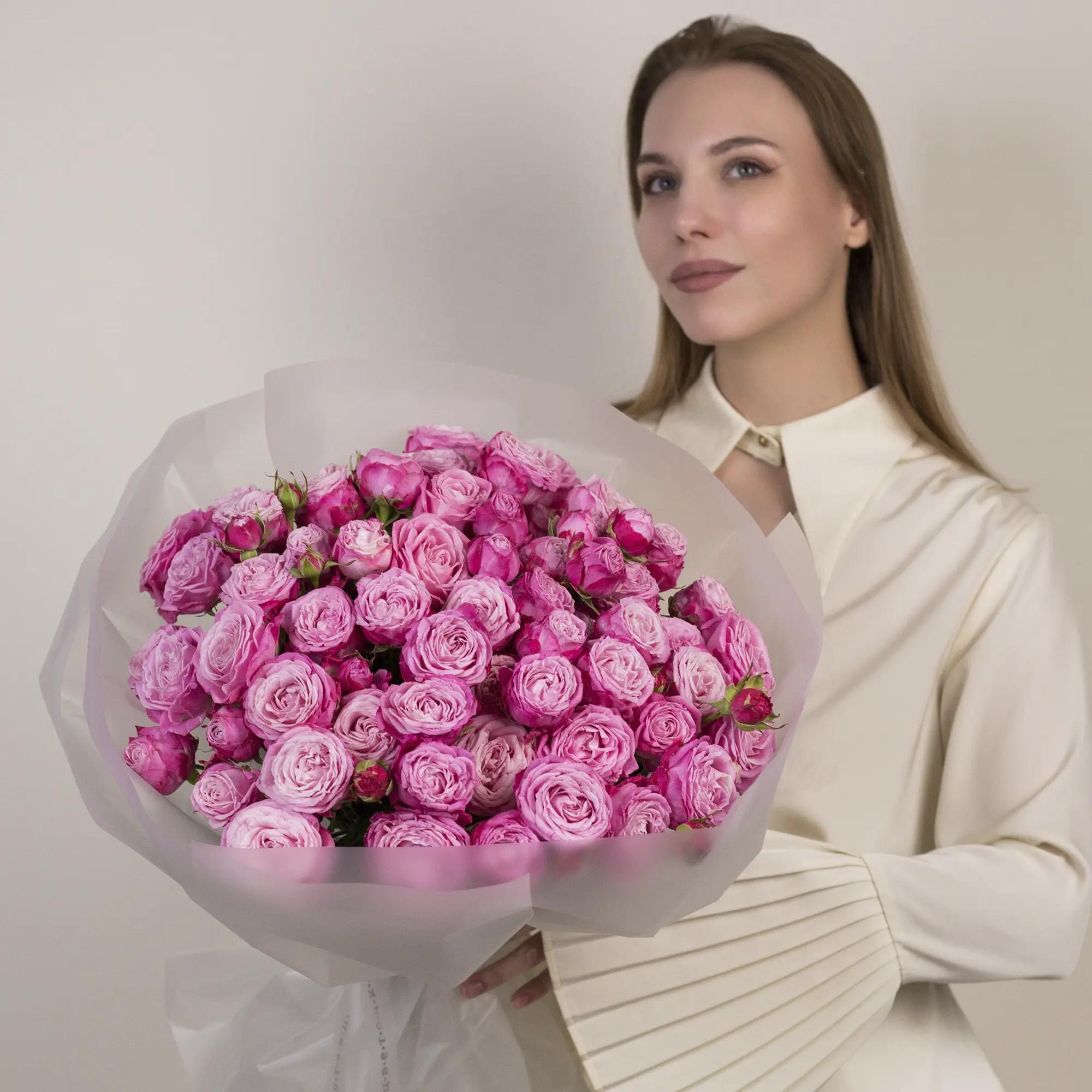 Этот букет — настоящая симфония кремовых оттенков. Кустовые розы, собранные в пышную композицию, поражают своей изысканностью. Мне особенно нравится, как плавно перетекают оттенки: от почти белого до тёплого персикового. Это создаёт эффект акварельной картины — так нежно и воздушно! Меня восхищает в этом букете плотность композиции — розы собраны очень плотно, создавая ощущение объёма и роскоши. Такой букет выглядит по-королевски! Каждый цветок словно маленький шедевр: лепестки аккуратно закручены, а бутоны выглядят свежими и живыми. Кремовая палитра универсальна: она подойдёт и для романтического признания, и для элегантного поздравления. Полупрозрачная плёнка подчёркивает нежность букета, не отвлекая внимание от цветов. Она добавляет лёгкости и завершённости образу. Работая над этим букетом, я думала о женщинах, которые ценят утончённость и изящество. Мне хотелось создать композицию, которая будет говорить сама за себя — без лишних слов, только через красоту и гармонию. Я уверена этот букет подарит море эмоций! Он идеально подойдёт для особых моментов — будь то день рождения, годовщина или просто желание порадовать близкого человека. Каждая роза здесь — как маленькое пожелание счастья и любви.
