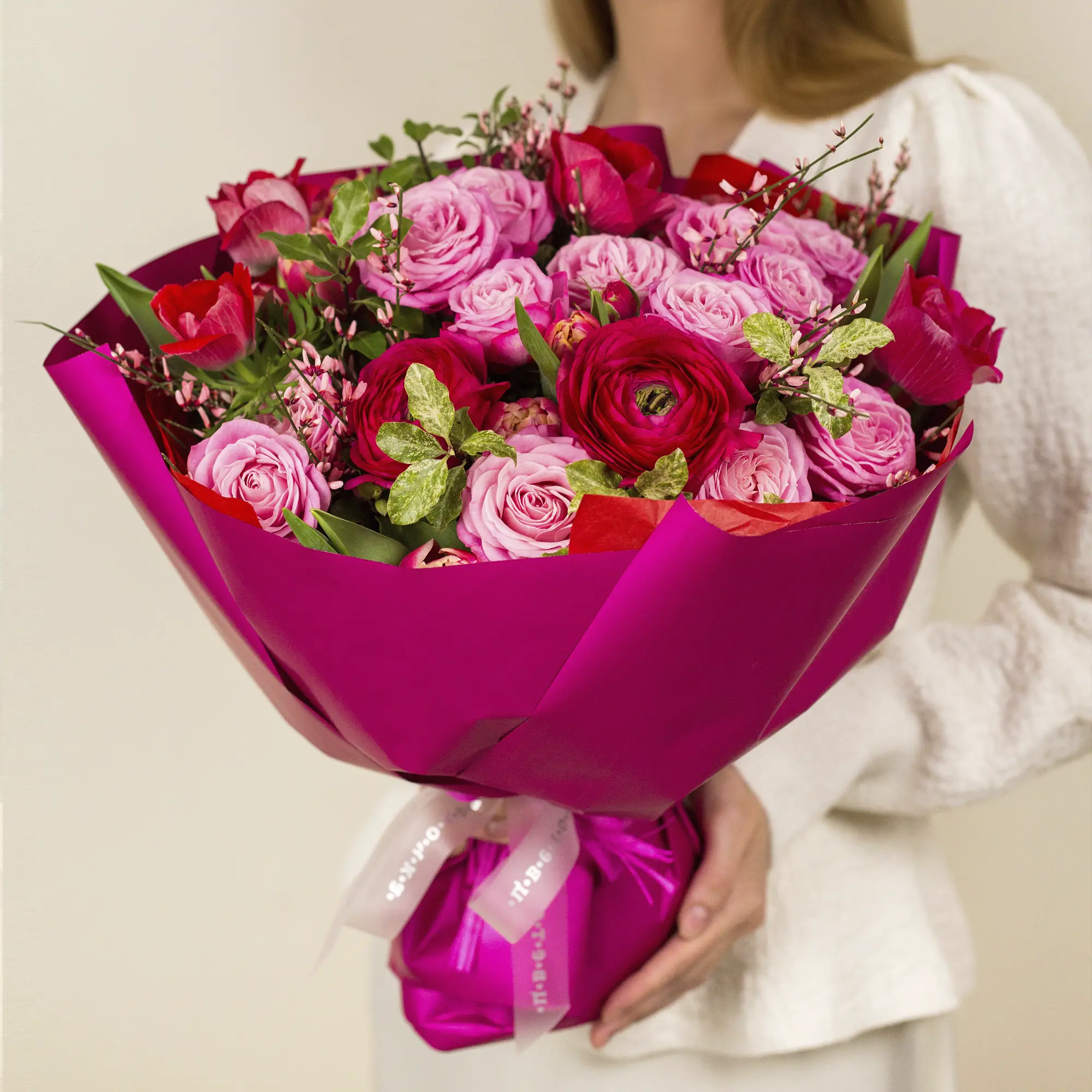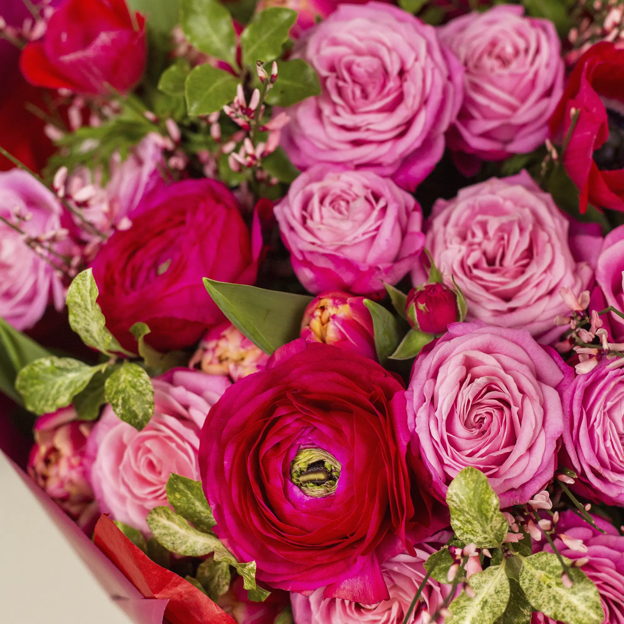 Букет из кустовых роз, анимонов и ранункулюса №2340 среднего размера