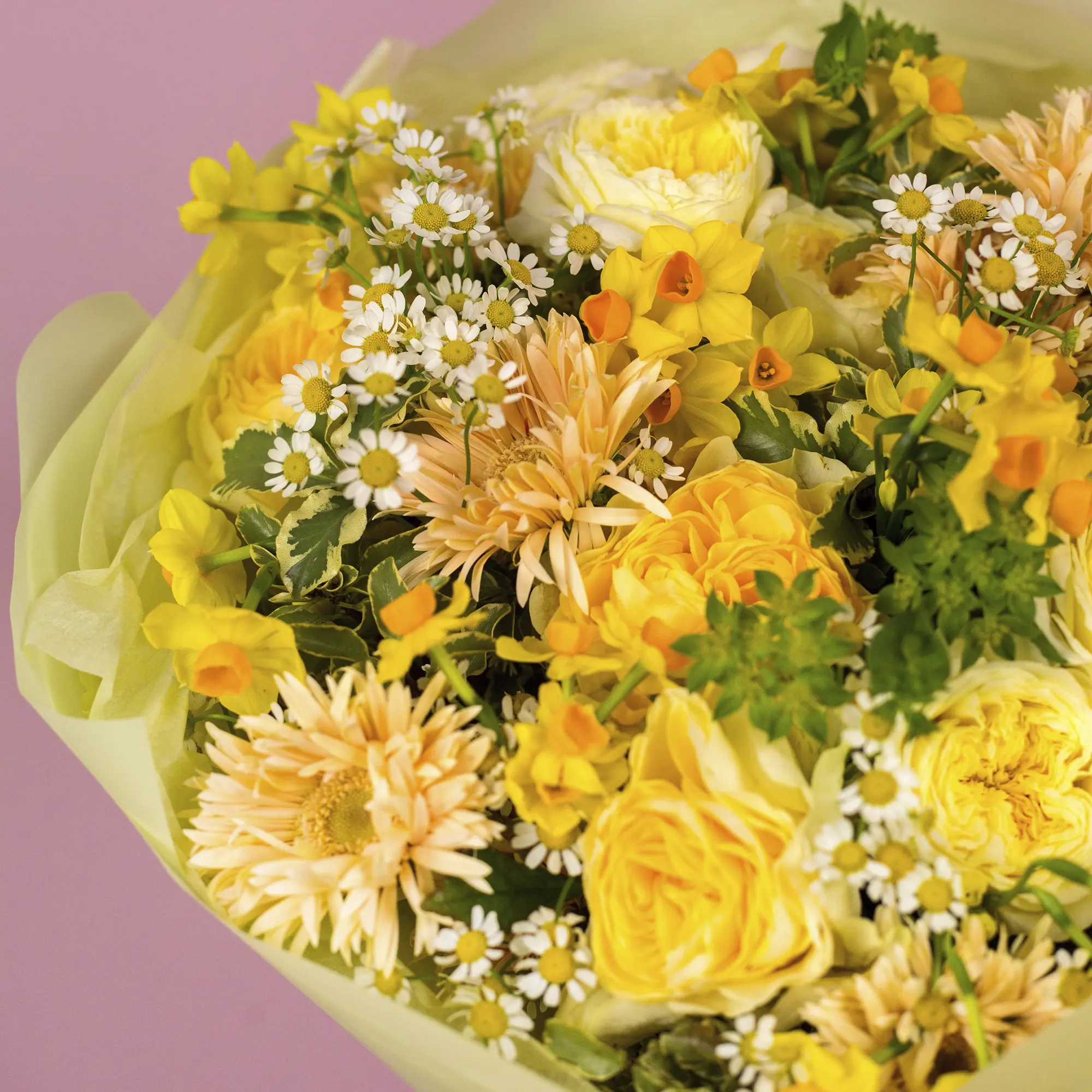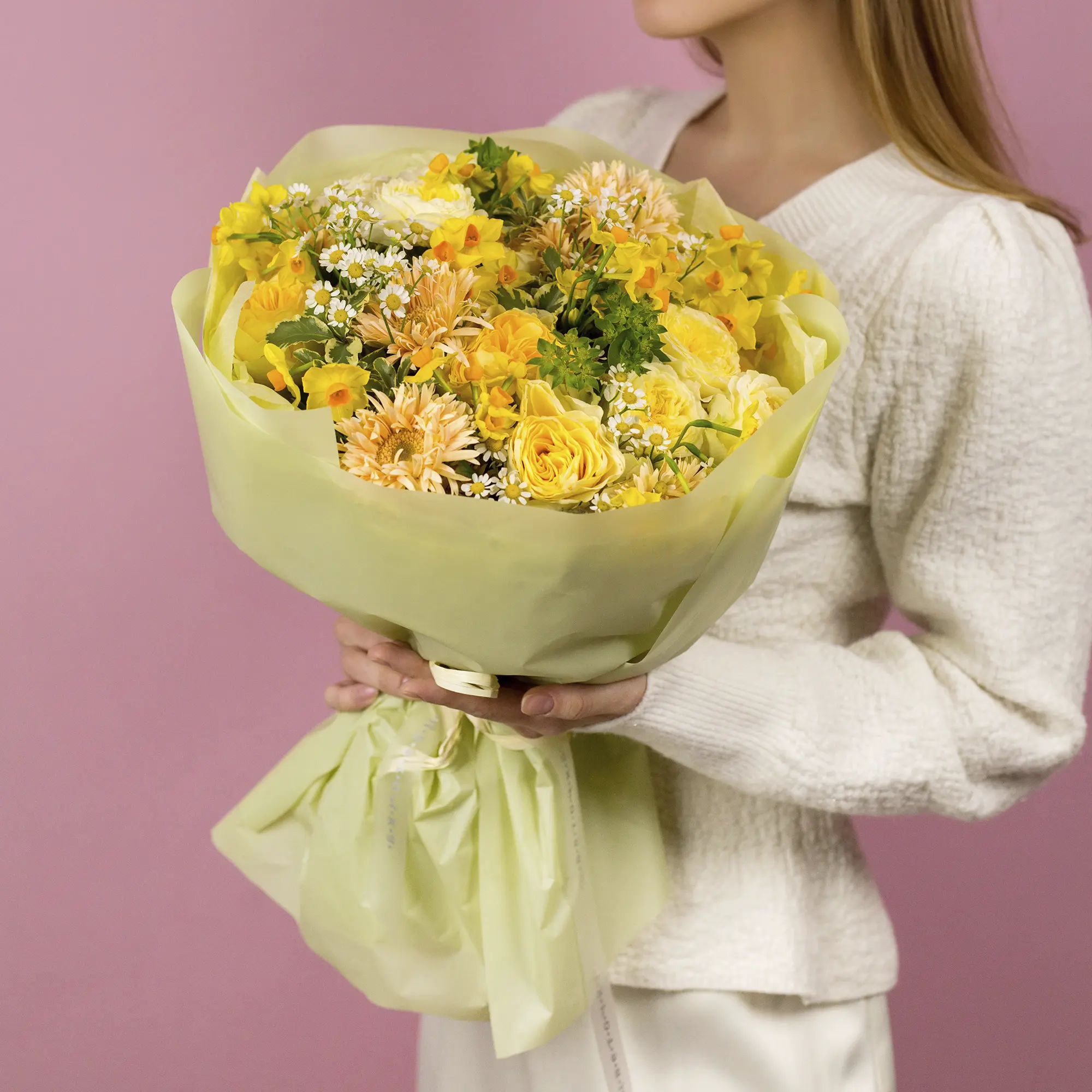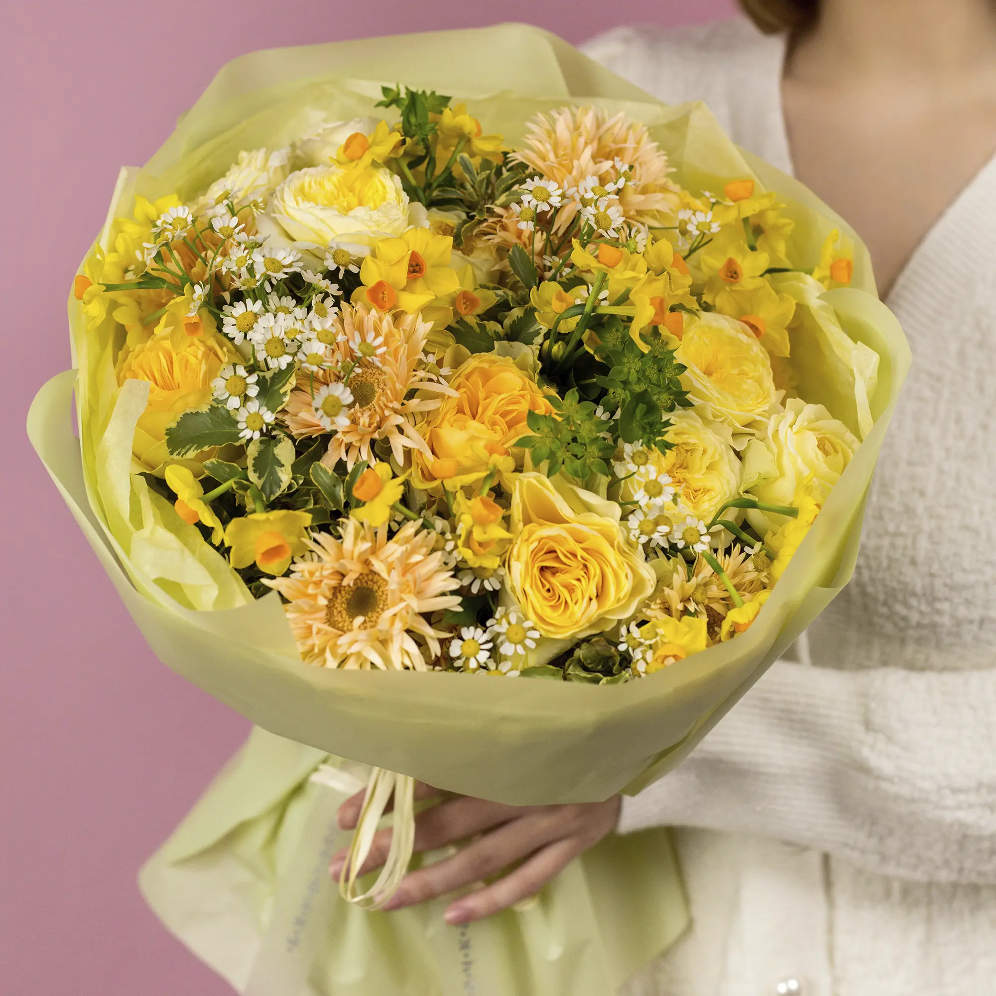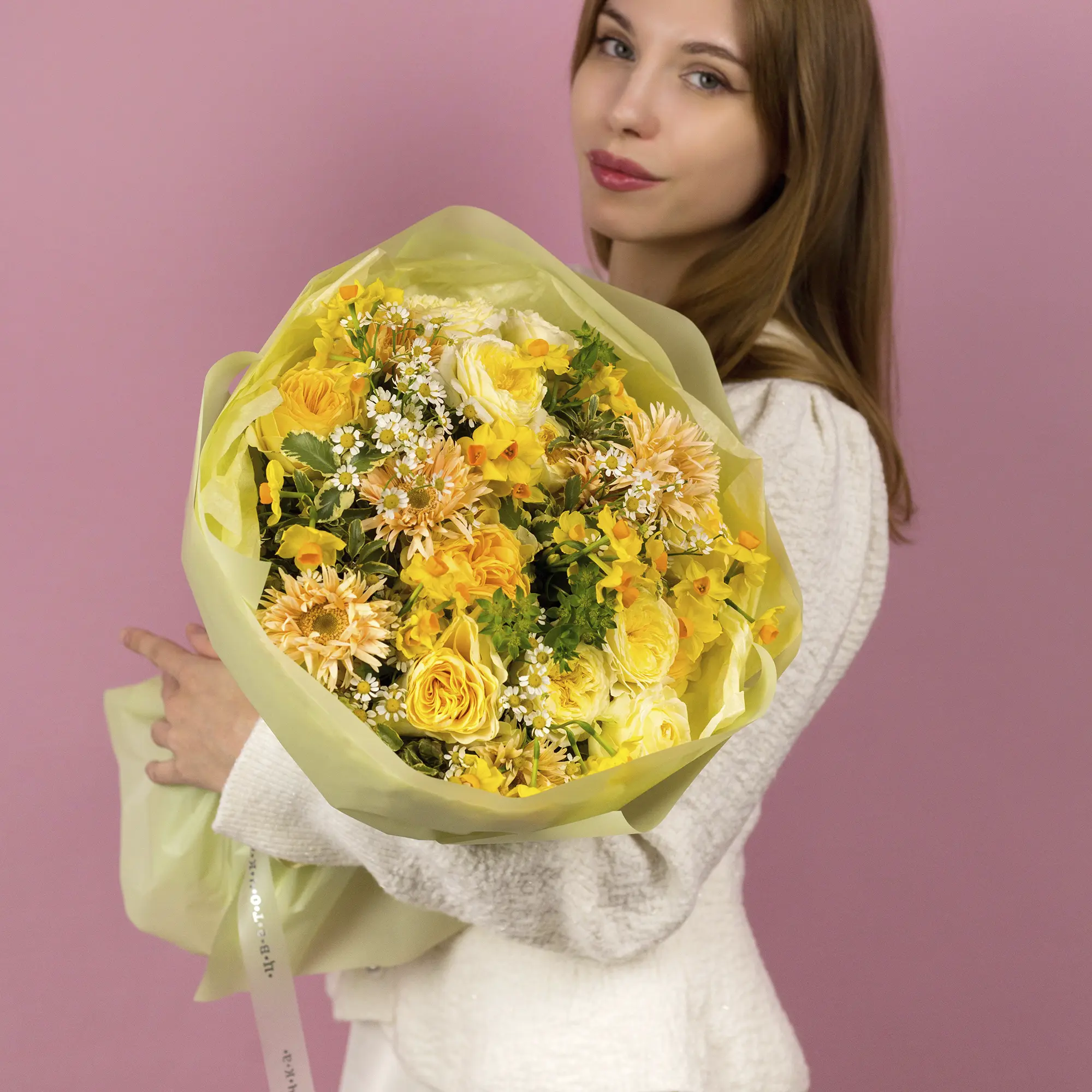 Букет из минигербер, роз и нарциссов №2345 среднего размера