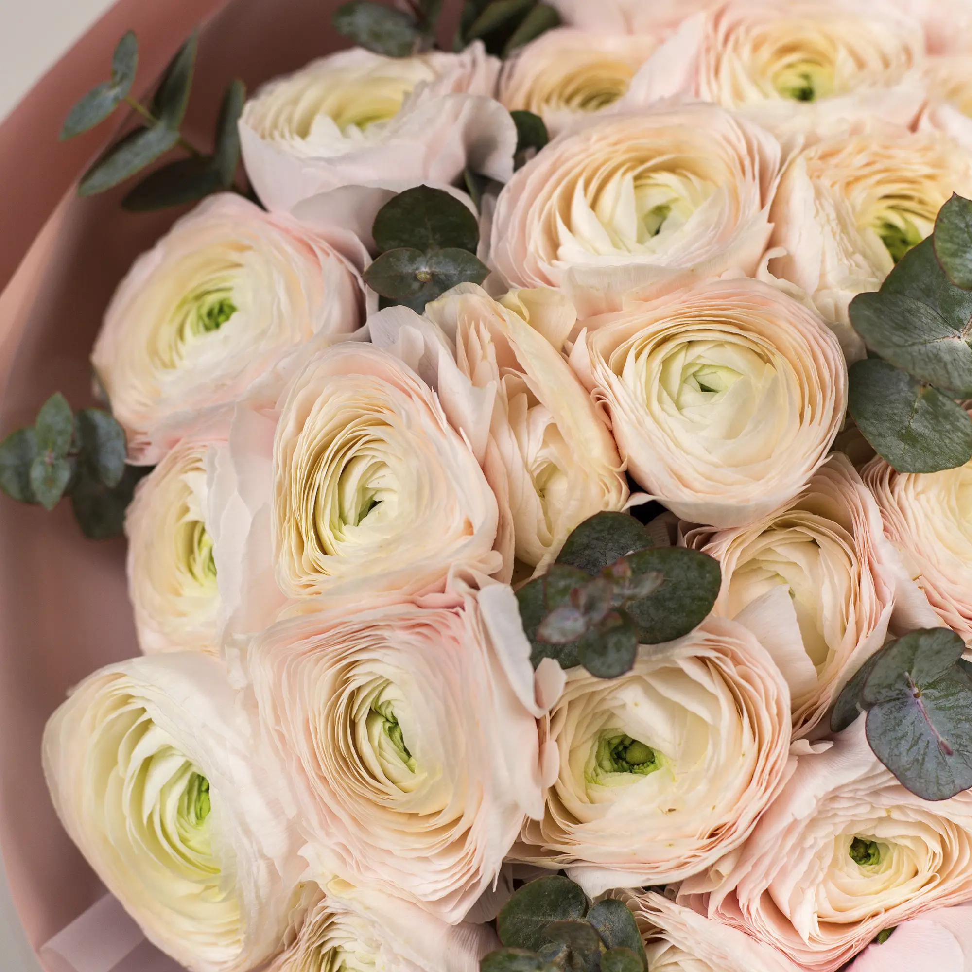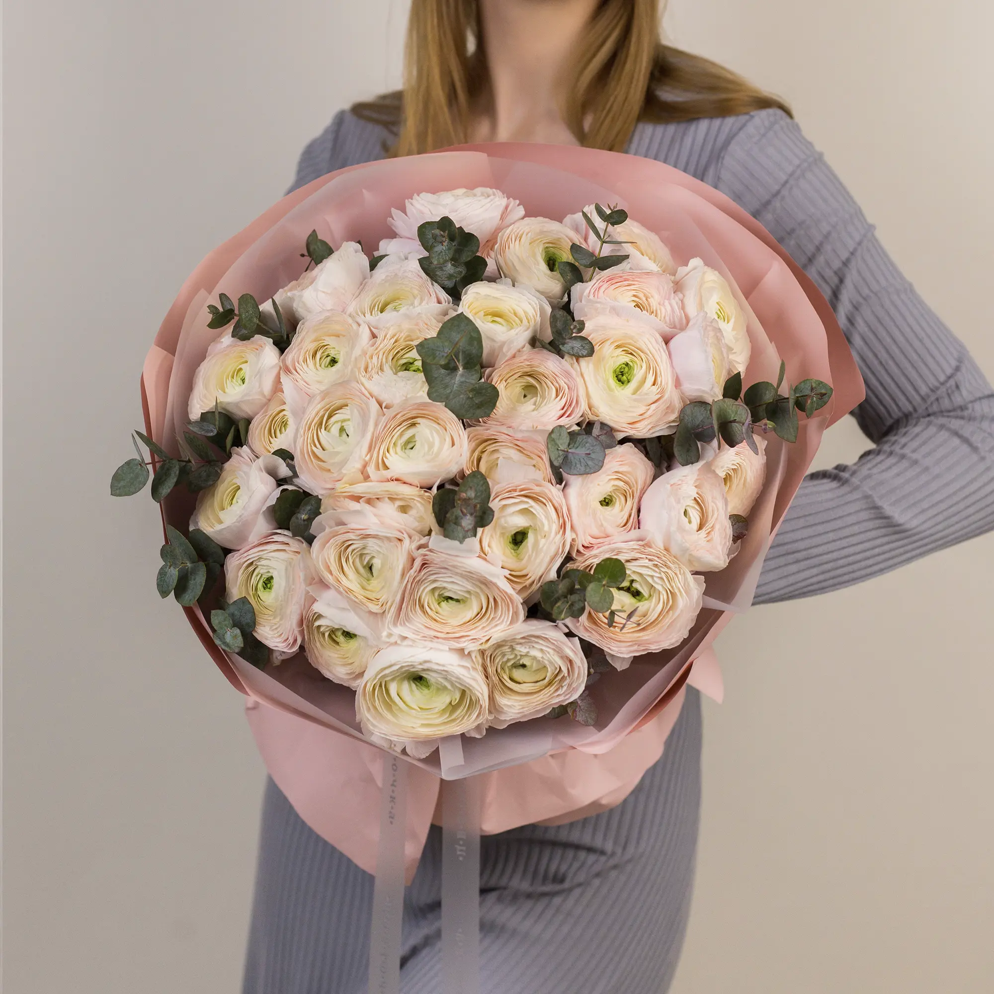 Букет из 35 розовых ранункулюсов c эвкалиптом №2360 большого размера