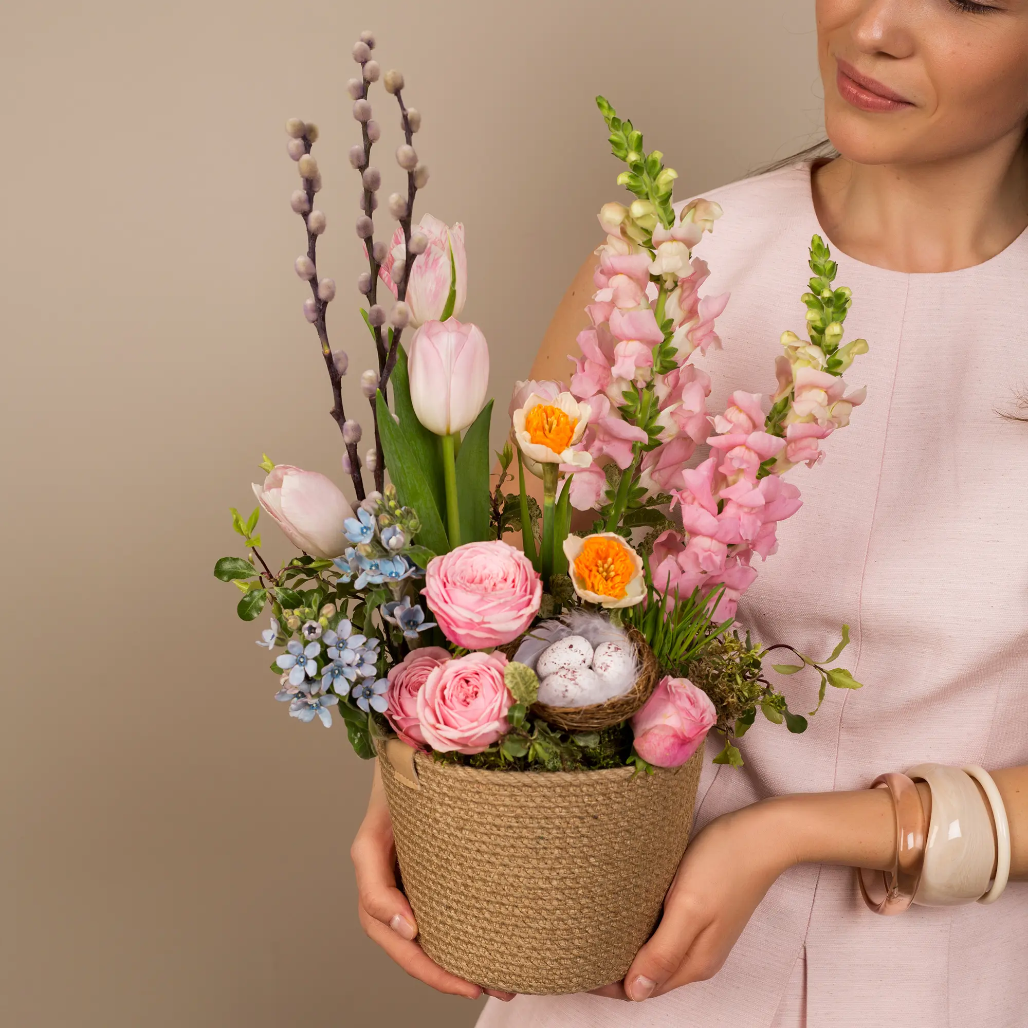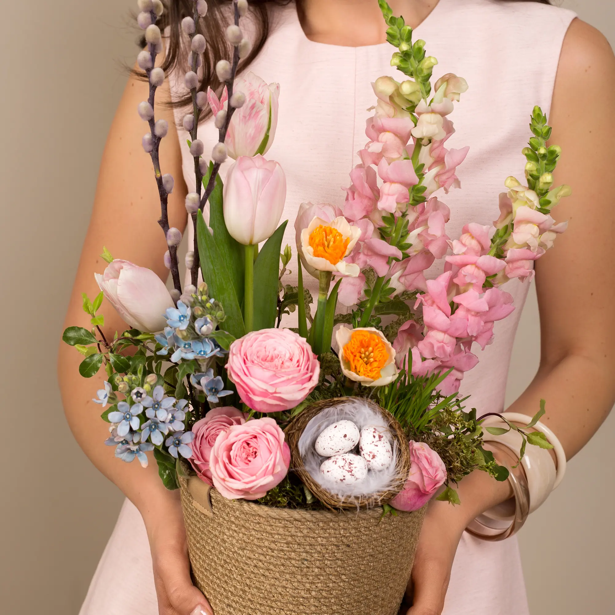 Пасхальная композиция из кустовой розы, нарциссов и тюльпанов №2388 среднего размера