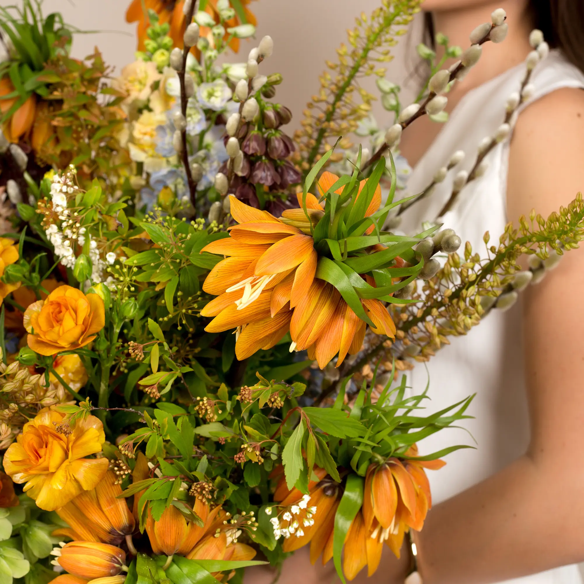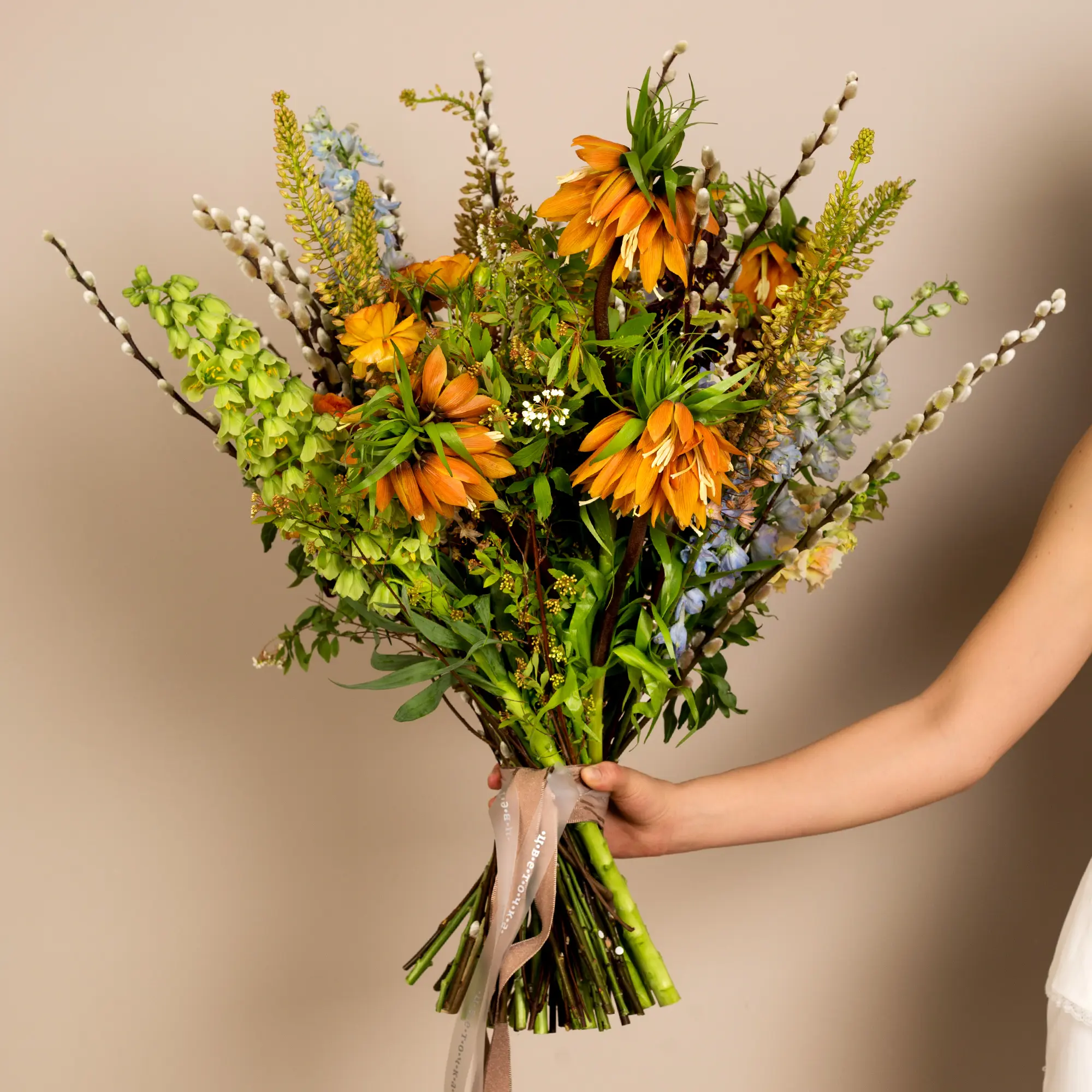 Букет из дельфиниума, фритиллярии и ранункулюсов №2398 самого большого размера