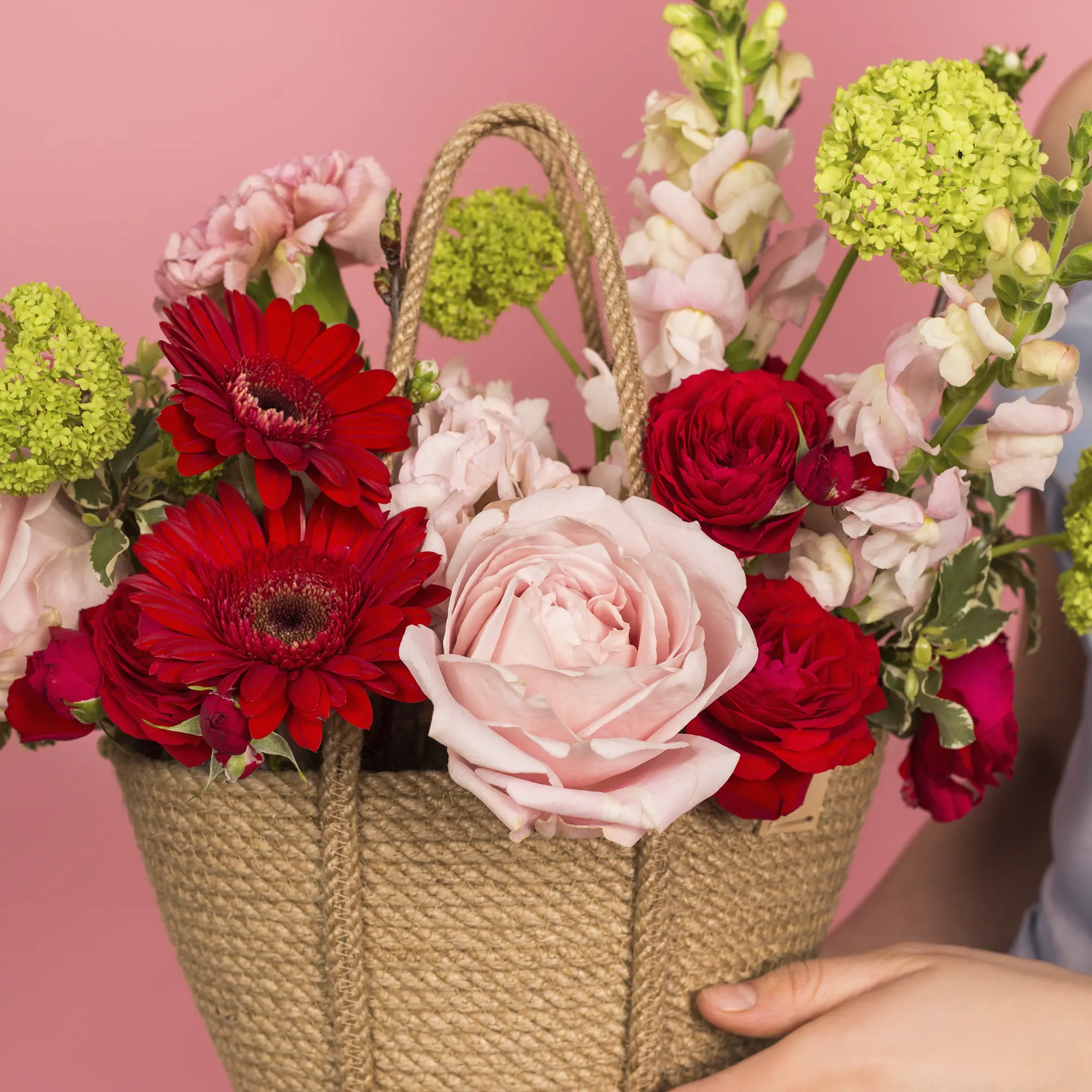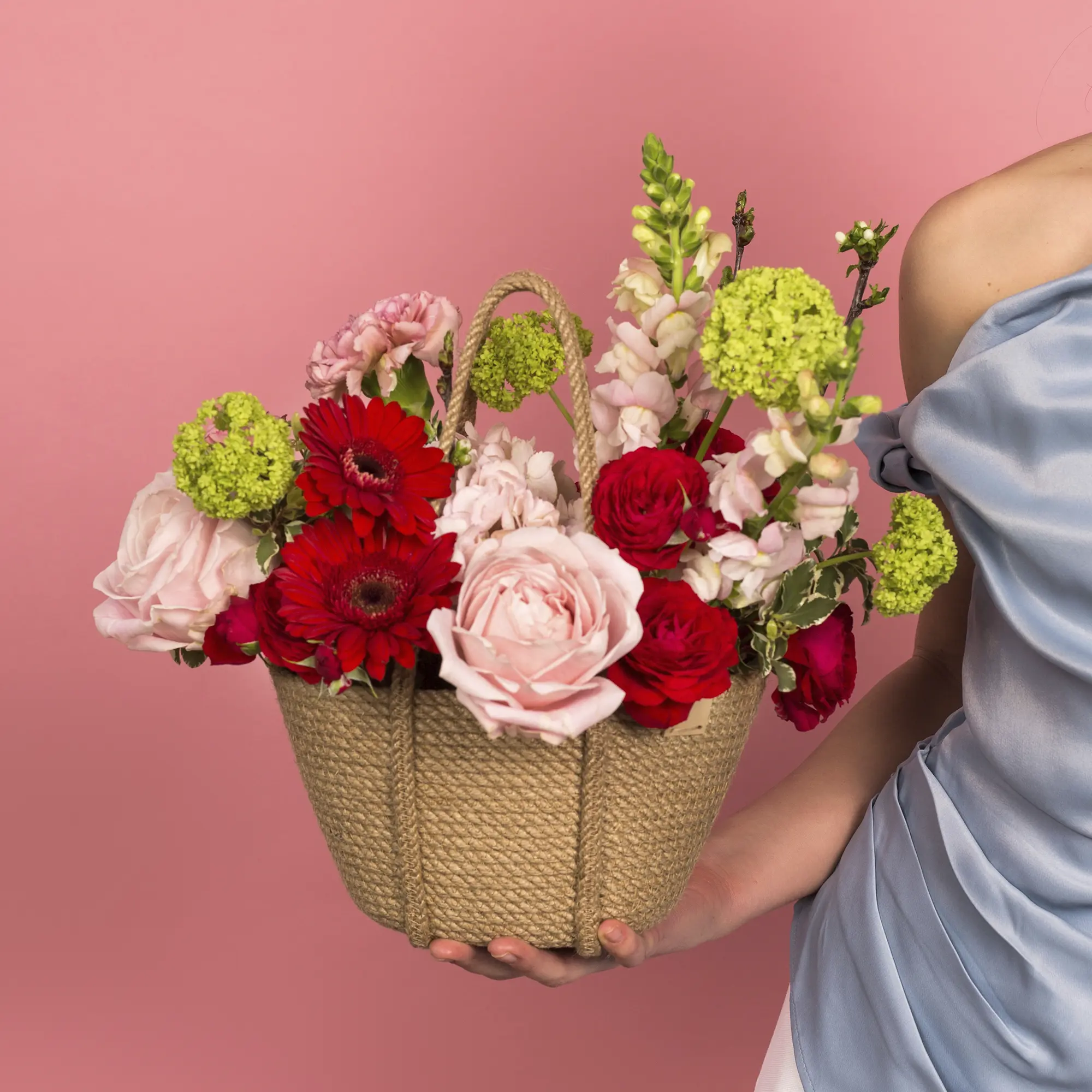Корзинка с ромашками, розами и гортензией №2410 среднего размера